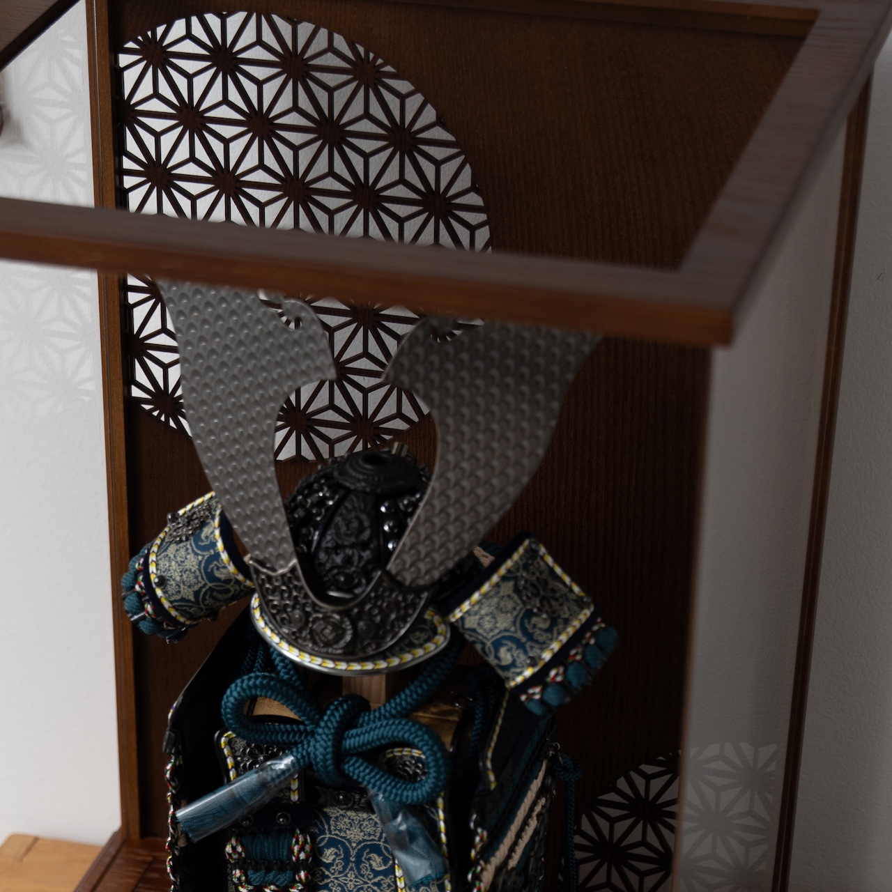 ケースでも手にとって欲しいこだわりの兜通常ケースタイプの商品は「取り付け型」と言われ飾る手間を省くために設置箇所が固定されています。本兜は、あえて飾る手間を残し本物の素材や質感をお子様とご一緒に手にとって飾る体験をしてもらいたい為、設置箇所は固定されておりません。また、上部、前、左右にはガラスではなくアクリル板が設置されていますので、万が一の際も安心です。