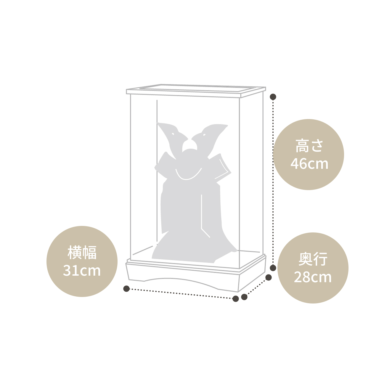 ケースでも手にとって欲しいこだわりの兜通常ケースタイプの商品は「取り付け型」と言われ飾る手間を省くために設置箇所が固定されています。本兜は、あえて飾る手間を残し本物の素材や質感をお子様とご一緒に手にとって飾る体験をしてもらいたい為、設置箇所は固定されておりません。また、上部、前、左右にはガラスではなくアクリル板が設置されていますので、万が一の際も安心です。