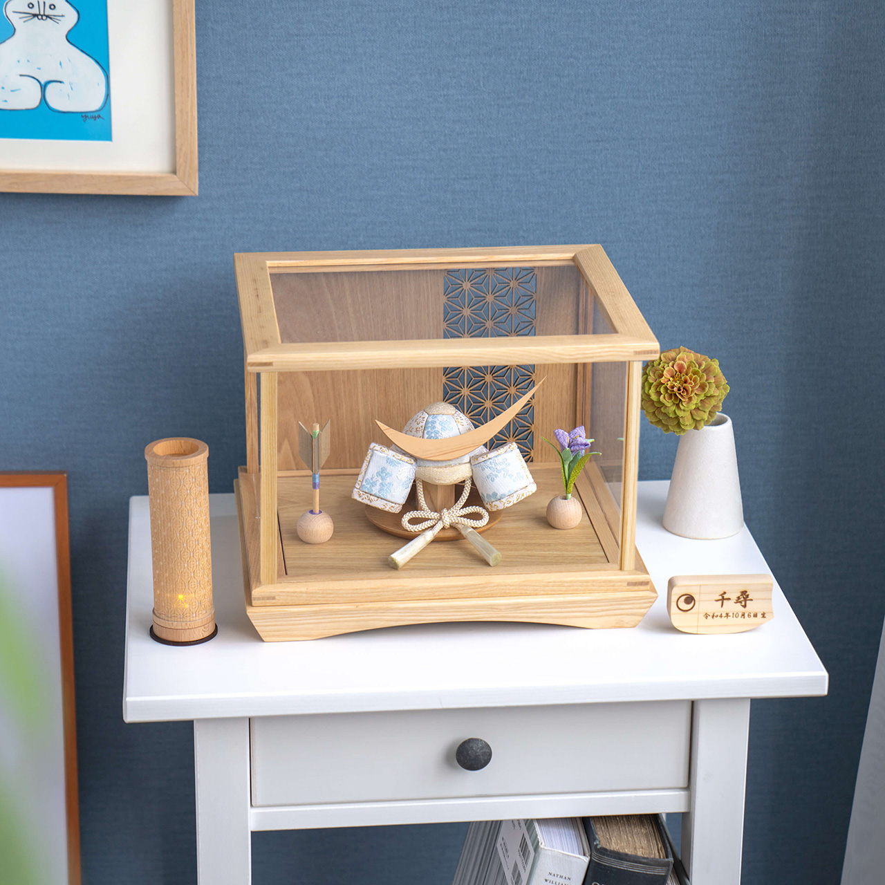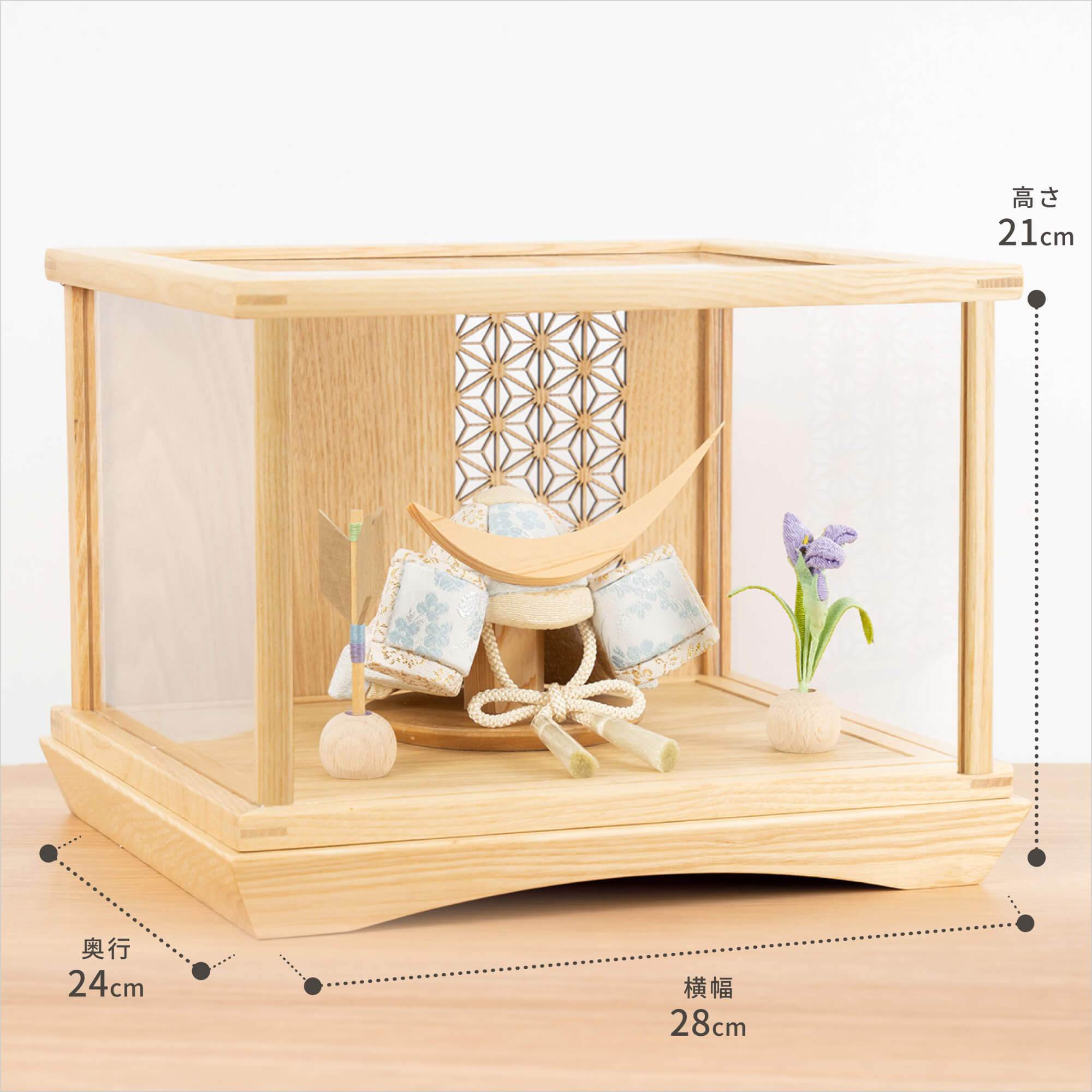 実際に手に取ると天然木の素材ならではの優しいぬくもりが伝わります。てづくり工房「木都」の職人が、伝統工芸の技術と天然木の素材を活かし、真心込めて1つ1つ丁寧につくりました。親しみやすく、お子様と一緒に飾れる 「ことの木目込かぶと」です。※ 細かい部品が含まれています。3歳未満のお子様は、保護者の方と一緒にお遊びください。 コンパクトでちょうどいいサイズコンパクトでちょうどいいサイズ今どきのおうちに合わせたコンパクトなサイズに仕上げました。飾るスペースが狭くなりがちなマンションや子ども部屋にもぴったり。お衣装へのこだわりお衣装へのこだわり有職裂地に桜と牡丹、菊の柄をあしらっています。有職とは「有職故事」という宮廷の決まり事に準拠した色彩や文様で、それらで造った衣装を有職衣装と呼びます。桜は豊かさ、牡丹は富貴、菊は無病息災や長寿の意味があります。お部屋のイメージに調和するデザインお部屋のイメージに調和するデザイン天然木の素材を活かしたシンプルなデザインだから、お部屋の雰囲気にもピッタリ。富士山の麓でとれた桧富士山の麓でとれた桧鍬形の素材には、富士山麓の無垢のヒノキを使用しています。健やかな成長への願いを込めた麻の葉文様健やかな成長への願いを込めた麻の葉文様古来からの日本伝統の吉祥文様である麻の葉文様。麻の丈夫さ・成長の早さにあやかり、お子さまの健やかな成長への願いが込められています。お子さまの感性を育む天然木へのこだわりお子さまの感性を育む天然木へのこだわり素材には、桧、タモといった天然木を使用。お子さまへの一生に一度の贈り物だから、木都は自然素材の天然木にこだわり続けています。※ 生産時期により使用する素材が一部変更になる場合がございます。熟練の職人による確かな手仕事熟練の職人による確かな手仕事伝統工芸の技術を受け継ぐ日本国内の熟練の職人が、一つひとつ丁寧に手づくりしています。おしゃれなギフト包装でお届けしますおしゃれなギフト包装でお届けします和の雰囲気を感じさせる越前和紙のギフト用ラッピングでお届け。料金がわかるものもお入れしていないので、そのまま贈り物として利用できます。商品レビュー記入でもれなくもらえる天然木のミニ名前札プレゼント商品レビュー記入でもれなくもらえる天然木のミニ名前札プレゼントミニサイズのお名前札 (通常販売価格1,980円) をプレゼント♪商品到着後、商品レビューをご記入の上、商品と同梱のチラシ記載のQRコードから応募フォームへ必要事項をご入力ください。店舗よりレビュー特典を発送いたします。※ お名前札の生年月日の表記は和暦となります。(例:令和七年)商品のご注文へ収納方法とセット内容兜・鍬形・芯木・菖蒲・矢羽根・ケース素材:桧・タモ重量:1,420g サイズ:W280mm × D240mm × H210mm梱包時:W330mm × D280mm × H240mm兜のみ:約 W130mm × D125mm × H110mm注意事項色合いなど実際のものと写真とでは多少の誤差が生じる場合がございます。また、手作りであり天然木を使用している為、多少の仕様の変化や風合いがひとつひとつ異なります。あらかじめご了承ください。部品には小さなものがございます。お子様がお口に入れないようにご注意ください。観賞用ではございますが手にとって遊んでいただくことも可能です。鍬形部は折れやすくなっております。強い衝撃を与えたり落としたりしないで下さい。材質により目の刻印の濃淡に差が生じますが不良品ではございません。木製品である限り自然なこととご承知下さいませ。保管場所は変色やカビ、サビの原因になりますので湿気の少ない場所・直射日光の当たらない場所に保管してください。ご不明点がございましたら > お問い合わせページ からご相談ください。