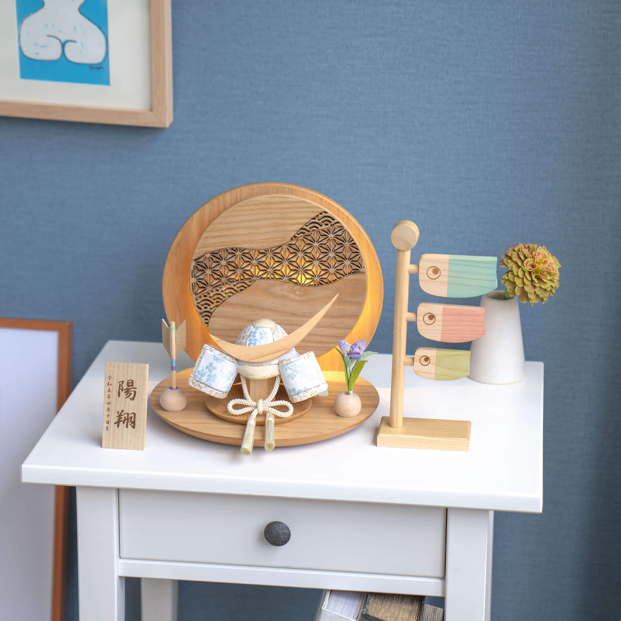 実際に手に取ると天然木の素材ならではの優しいぬくもりが伝わります。てづくり工房「木都」の職人が、伝統工芸の技術と天然木の素材を活かし、真心込めて1つ1つ丁寧につくりました。親しみやすく、お子様と一緒に飾れる 「ことの木目込かぶと」です。細かい部品が含まれています。3歳未満のお子様は、保護者の方と一緒にお遊びください。兜の忍び緒の房に巻いておりますビニールは外さずにお飾り下さい。コンパクトでちょうどいいサイズコンパクトでちょうどいいサイズ今どきのおうちに合わせたコンパクトなサイズに仕上げました。飾るスペースが狭くなりがちなマンションや子ども部屋にもぴったり。お衣装へのこだわりお衣装へのこだわり有職裂地に桜と牡丹、菊の柄をあしらっています。有職とは「有職故事」という宮廷の決まり事に準拠した色彩や文様で、それらで造った衣装を有職衣装と呼びます。桜は豊かさ、牡丹は富貴、菊は無病息災や長寿の意味があります。お部屋のイメージに調和するデザインお部屋のイメージに調和するデザイン天然木の素材を活かしたシンプルなデザインだから、お部屋の雰囲気にもピッタリ。天然ひのきの抗菌・防腐性天然ひのきの抗菌・防腐性桧には天然成分ヒノキチオールが含まれ、抗菌・防腐性があります。鍬形の素材には富士山麓の無垢ヒノキを使用。樹脂(ヤニ)が出る場合がありますが良質な木材の証です。健やかな成長への願いを込めた麻の葉文様健やかな成長への願いを込めた麻の葉文様古来からの日本伝統の吉祥文様である麻の葉文様。麻の丈夫さ・成長の早さにあやかり、お子さまの健やかな成長への願いが込められています。お子さまの感性を育む天然木へのこだわりお子さまの感性を育む天然木へのこだわり素材には、桧、タモといった天然木を使用。お子さまへの一生に一度の贈り物だから、木都は自然素材の天然木にこだわり続けています。※ 生産時期により使用する素材が一部変更になる場合がございます。熟練の職人による確かな手仕事熟練の職人による確かな手仕事伝統工芸の技術を受け継ぐ日本国内の熟練の職人が、一つひとつ丁寧に手づくりしています。越前和紙のギフト包装でお届けします越前和紙のギフト包装でお届けします和の雰囲気を感じさせる越前和紙のギフト用ラッピングでお届け。料金がわかるものもお入れしていないので、そのまま贈り物として利用できます。商品レビュー記入でもれなくもらえる天然木のミニ名前札プレゼント商品レビュー記入でもれなくもらえる天然木のミニ名前札プレゼントミニサイズのお名前札 (通常販売価格1,980円) をプレゼント♪商品到着後、商品レビューをご記入の上、商品と同梱のチラシ記載のQRコードから応募フォームへ必要事項をご入力ください。店舗よりレビュー特典を発送いたします。※ レビューの投稿後、特典の発送は2週間ほどかかります。節句に間に合わせたい方は単品でのご購入をおすすめいたします。※ お名前札の生年月日の表記は和暦となります。(例:令和八年)商品のご注文へ収納方法とセット内容兜・鍬形・芯木・菖蒲・矢羽根・衝立・平台・電源ケーブル素材:桧・タモ重量:1,080g サイズ:W220mm × D205mm × H210mm梱包時:W290mm × D290mm × H160mm兜のみ:約 W130mm × D125mm × H110mm注意事項色合いなど実際のものと写真とでは多少の誤差が生じる場合がございます。また、手作りであり天然木を使用している為、多少の仕様の変化や風合いがひとつひとつ異なります。あらかじめご了承ください。部品には小さなものがございます。お子様がお口に入れないようにご注意ください。観賞用ではございますが手にとって遊んでいただくことも可能です。鍬形部は折れやすくなっております。強い衝撃を与えたり落としたりしないで下さい。材質により目の刻印の濃淡に差が生じますが不良品ではございません。木製品である限り自然なこととご承知下さいませ。保管場所は変色やカビ、サビの原因になりますので湿気の少ない場所・直射日光の当たらない場所に保管してください。ご不明点がございましたら > お問い合わせページ からご相談ください。