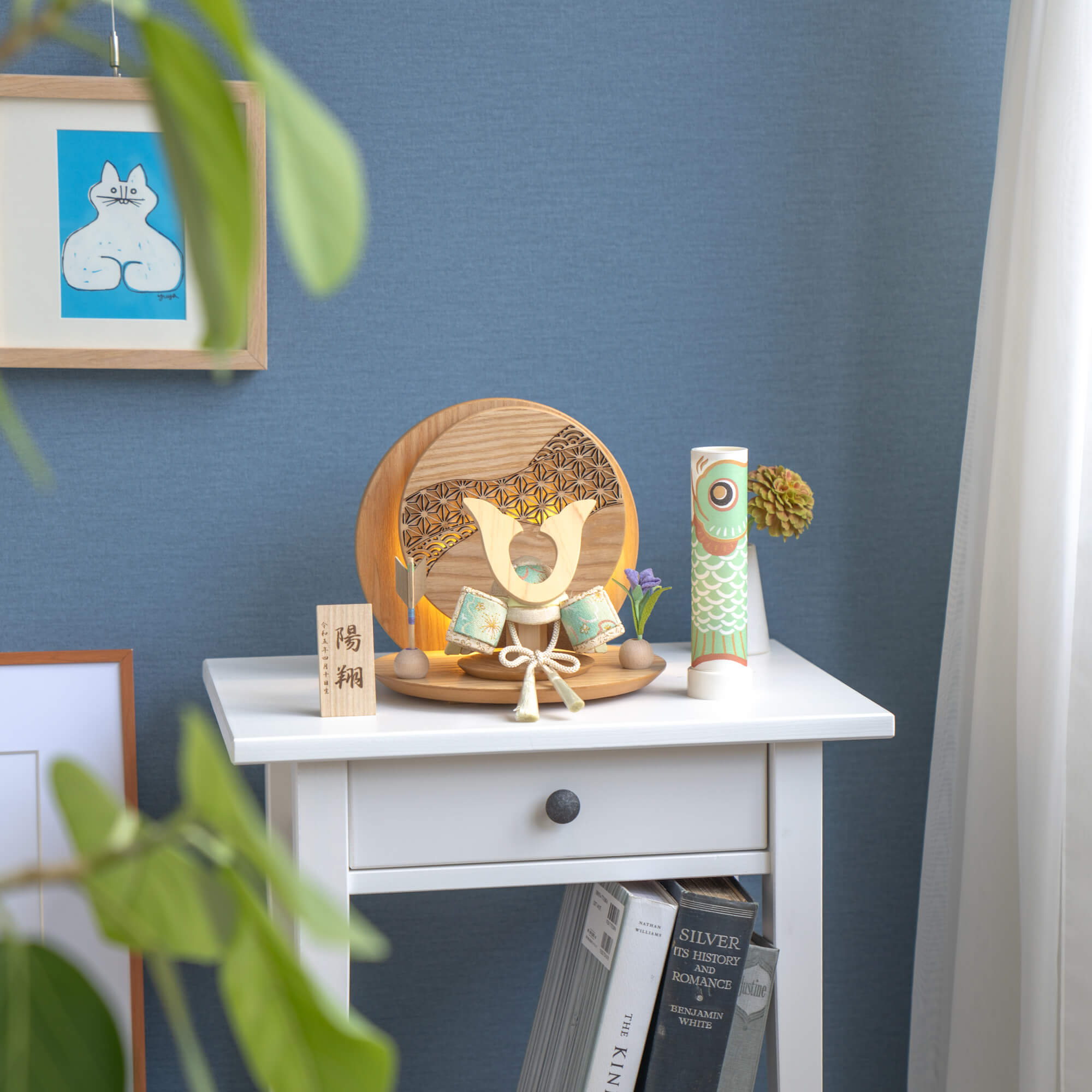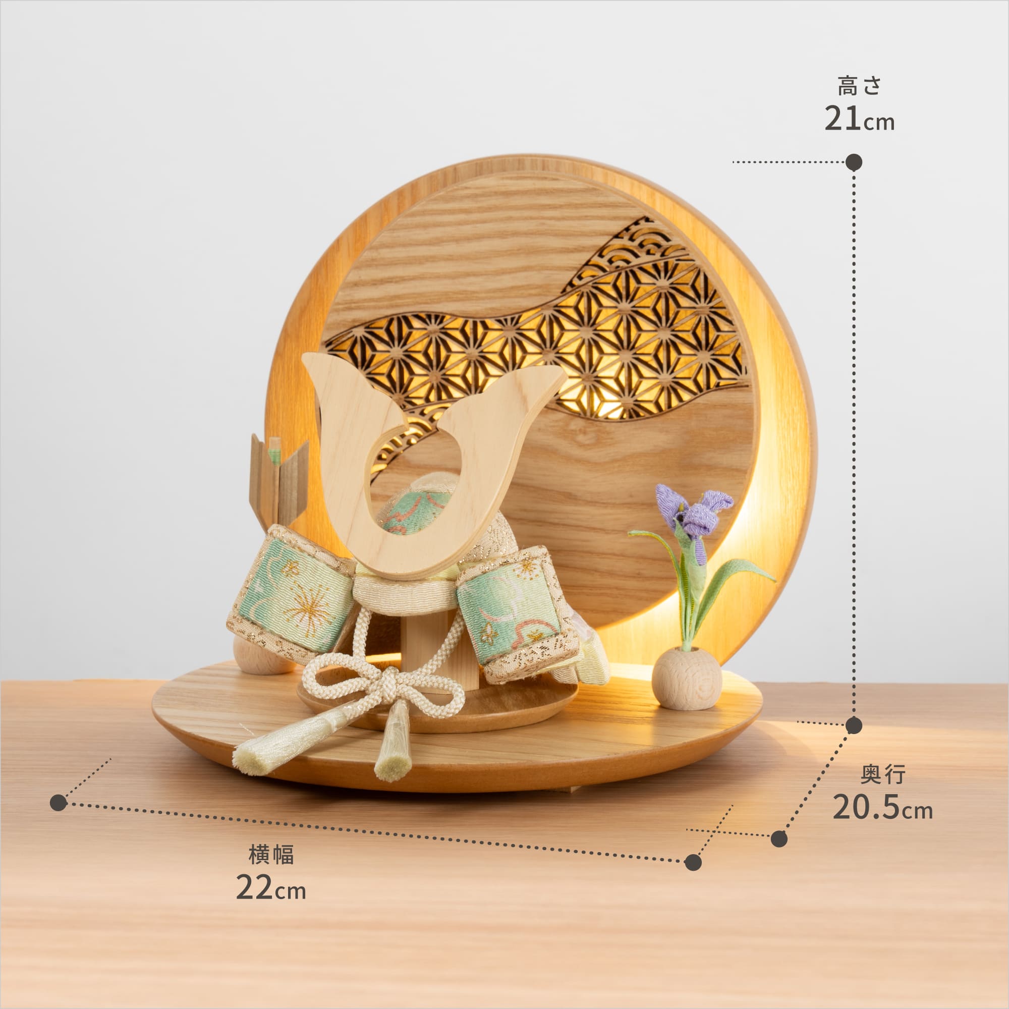 実際に手に取ると天然木の素材ならではの優しいぬくもりが伝わります。てづくり工房「木都」の職人が、伝統工芸の技術と天然木の素材を活かし、真心込めて1つ1つ丁寧につくりました。親しみやすく、お子様と一緒に飾れる 「ことの木目込かぶと」です。細かい部品が含まれています。3歳未満のお子様は、保護者の方と一緒にお遊びください。兜の忍び緒の房に巻いておりますビニールは外さずにお飾り下さい。コンパクトでちょうどいいサイズコンパクトでちょうどいいサイズ今どきのおうちに合わせたコンパクトなサイズに仕上げました。飾るスペースが狭くなりがちなマンションや子ども部屋にもぴったり。お衣装へのこだわりお衣装へのこだわり有職裂地を使用しています。有職とは「有職故事」という宮廷の決まり事に準拠した色彩や文様で、それらで造った衣装を有職衣装と呼びます。薔薇には美しさや愛情という意味があります。お部屋のイメージに調和するデザインお部屋のイメージに調和するデザイン天然木の素材を活かしたシンプルなデザインだから、お部屋の雰囲気にもピッタリ。天然ひのきの抗菌・防腐性天然ひのきの抗菌・防腐性桧には天然成分ヒノキチオールが含まれ、抗菌・防腐性があります。鍬形の素材には富士山麓の無垢ヒノキを使用。樹脂(ヤニ)が出る場合がありますが良質な木材の証です。健やかな成長への願いを込めた麻の葉文様健やかな成長への願いを込めた麻の葉文様古来からの日本伝統の吉祥文様である麻の葉文様。麻の丈夫さ・成長の早さにあやかり、お子さまの健やかな成長への願いが込められています。お子さまの感性を育む天然木へのこだわりお子さまの感性を育む天然木へのこだわり素材には、桧、タモといった天然木を使用。お子さまへの一生に一度の贈り物だから、木都は自然素材の天然木にこだわり続けています。※ 生産時期により使用する素材が一部変更になる場合がございます。熟練の職人による確かな手仕事熟練の職人による確かな手仕事伝統工芸の技術を受け継ぐ日本国内の熟練の職人が、一つひとつ丁寧に手づくりしています。越前和紙のギフト包装でお届けします越前和紙のギフト包装でお届けします和の雰囲気を感じさせる越前和紙のギフト用ラッピングでお届け。料金がわかるものもお入れしていないので、そのまま贈り物として利用できます。商品レビュー記入でもれなくもらえる天然木のミニ名前札プレゼント商品レビュー記入でもれなくもらえる天然木のミニ名前札プレゼントミニサイズのお名前札 (通常販売価格1,980円) をプレゼント♪商品到着後、商品レビューをご記入の上、商品と同梱のチラシ記載のQRコードから応募フォームへ必要事項をご入力ください。店舗よりレビュー特典を発送いたします。※ レビューの投稿後、特典の発送は2週間ほどかかります。節句に間に合わせたい方は単品でのご購入をおすすめいたします。※ お名前札の生年月日の表記は和暦となります。(例:令和八年)商品のご注文へ収納方法とセット内容兜・鍬形・芯木・菖蒲・矢羽根・衝立・平台・電源ケーブル素材:桧・タモ重量:1,080g サイズ:W220mm × D205mm × H210mm梱包時:W290mm × D290mm × H160mm兜のみ:約 W130mm × D125mm × H110mm注意事項色合いなど実際のものと写真とでは多少の誤差が生じる場合がございます。また、手作りであり天然木を使用している為、多少の仕様の変化や風合いがひとつひとつ異なります。あらかじめご了承ください。部品には小さなものがございます。お子様がお口に入れないようにご注意ください。観賞用ではございますが手にとって遊んでいただくことも可能です。鍬形部は折れやすくなっております。強い衝撃を与えたり落としたりしないで下さい。材質により目の刻印の濃淡に差が生じますが不良品ではございません。木製品である限り自然なこととご承知下さいませ。保管場所は変色やカビ、サビの原因になりますので湿気の少ない場所・直射日光の当たらない場所に保管してください。ご不明点がございましたら > お問い合わせページ からご相談ください。