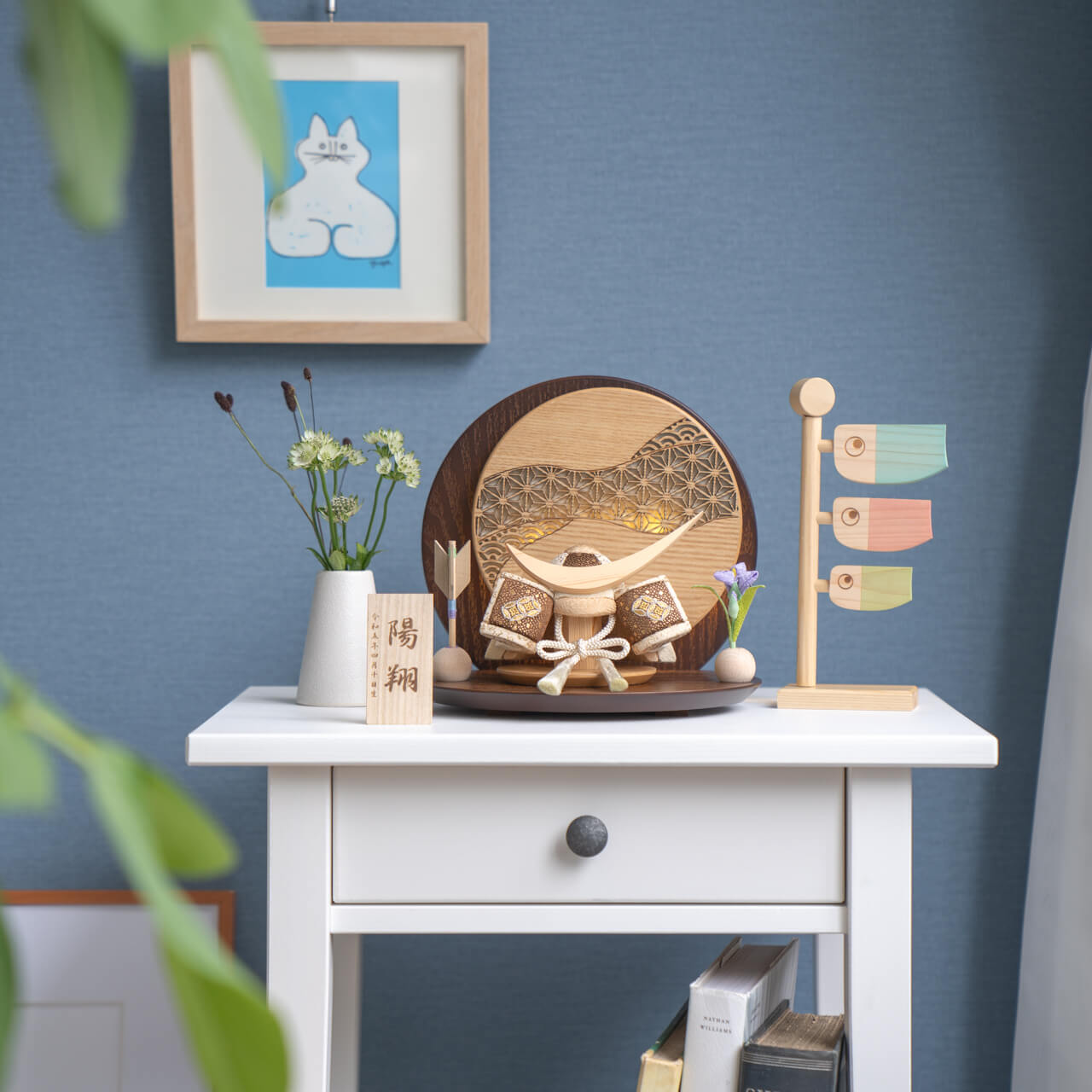 実際に手に取ると天然木の素材ならではの優しいぬくもりが伝わります。てづくり工房「木都」の職人が、伝統工芸の技術と天然木の素材を活かし、真心込めて1つ1つ丁寧につくりました。親しみやすく、お子様と一緒に飾れる 「ことの木目込かぶと」です。※ 細かい部品が含まれています。3歳未満のお子様は、保護者の方と一緒にお遊びください。 コンパクトでちょうどいいサイズコンパクトでちょうどいいサイズ今どきのおうちに合わせたコンパクトなサイズに仕上げました。飾るスペースが狭くなりがちなマンションや子ども部屋にもぴったり。お衣装へのこだわりお衣装へのこだわり有職裂地を使用しています。有職とは「有職故事」という宮廷の決まり事に準拠した色彩や文様で、それらで造った衣装を有職衣装と呼びます。お部屋のイメージに調和するデザインお部屋のイメージに調和するデザイン天然木の素材を活かしたシンプルなデザインだから、お部屋の雰囲気にもピッタリ。富士山の麓でとれた桧富士山の麓でとれた桧鍬形の素材には、富士山麓の無垢のヒノキを使用しています。健やかな成長への願いを込めた麻の葉文様健やかな成長への願いを込めた麻の葉文様古来からの日本伝統の吉祥文様である麻の葉文様。麻の丈夫さ・成長の早さにあやかり、お子さまの健やかな成長への願いが込められています。お子さまの感性を育む天然木へのこだわりお子さまの感性を育む天然木へのこだわり素材には、桧、タモといった天然木を使用。お子さまへの一生に一度の贈り物だから、木都は自然素材の天然木にこだわり続けています。※ 生産時期により使用する素材が一部変更になる場合がございます。熟練の職人による確かな手仕事熟練の職人による確かな手仕事伝統工芸の技術を受け継ぐ日本国内の熟練の職人が、一つひとつ丁寧に手づくりしています。おしゃれなギフト包装でお届けしますおしゃれなギフト包装でお届けします和の雰囲気を感じさせる越前和紙のギフト用ラッピングでお届け。料金がわかるものもお入れしていないので、そのまま贈り物として利用できます。商品レビュー記入でもれなくもらえる天然木のミニ名前札プレゼント商品レビュー記入でもれなくもらえる天然木のミニ名前札プレゼントミニサイズのお名前札 (通常販売価格1,980円) をプレゼント♪商品到着後、商品レビューをご記入の上、商品と同梱のチラシ記載のQRコードから応募フォームへ必要事項をご入力ください。店舗よりレビュー特典を発送いたします。※ お名前札の生年月日の表記は和暦となります。(例:令和七年)商品のご注文へ収納方法とセット内容兜・鍬形・芯木・菖蒲・矢羽根・衝立・平台・電源ケーブル素材:桧・タモ重量:1,080g サイズ:W220mm × D205mm × H210mm梱包時:W290mm × D290mm × H160mm兜のみ:約 W130mm × D125mm × H110mm注意事項色合いなど実際のものと写真とでは多少の誤差が生じる場合がございます。また、手作りであり天然木を使用している為、多少の仕様の変化や風合いがひとつひとつ異なります。あらかじめご了承ください。部品には小さなものがございます。お子様がお口に入れないようにご注意ください。観賞用ではございますが手にとって遊んでいただくことも可能です。鍬形部は折れやすくなっております。強い衝撃を与えたり落としたりしないで下さい。材質により目の刻印の濃淡に差が生じますが不良品ではございません。木製品である限り自然なこととご承知下さいませ。保管場所は変色やカビ、サビの原因になりますので湿気の少ない場所・直射日光の当たらない場所に保管してください。ご不明点がございましたら > お問い合わせページ からご相談ください。