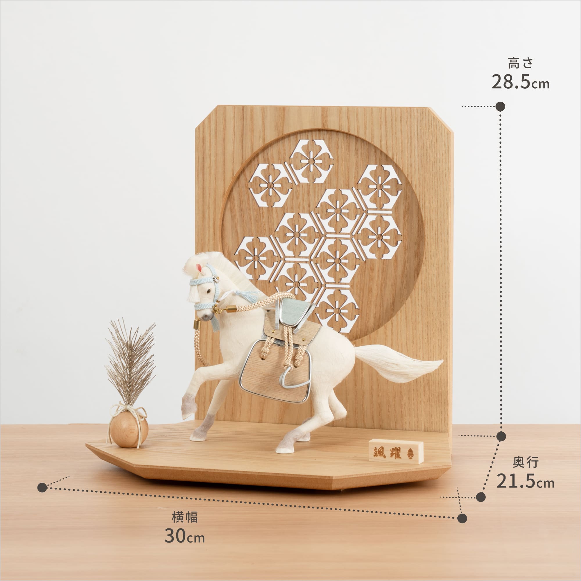 実際に手に取ると天然木の素材ならではの優しいぬくもりが伝わります。てづくり工房「木都」の職人が、伝統工芸の技術と天然木の素材を活かし、真心込めて1つ1つ丁寧につくりました。勝利や誇りの象徴でもあり、富や権力、出世の象徴のシンボルとされる馬を躍動感溢れる姿で表現した「ことの颯躍」です。※ 細かい部品が含まれています。3歳未満のお子様は、保護者の方と一緒にお遊びください。コンパクトでちょうどいいサイズコンパクトでちょうどいいサイズ今どきのおうちに合わせたコンパクトなサイズに仕上げました。飾るスペースが狭くなりがちなマンションや子ども部屋にもぴったり。子供の成長と成功を願う 馬子供の成長と成功を願う 馬戦国時代に武将を乗せて戦場を走り抜けた馬は、行動力や力の源とされる「陽」の気をもつといわれています。鞍や手綱やくつわ、あぶみなどの細部までこだわった、躍動感溢れる飾り馬です。お子さまの感性を育む天然木へのこだわりお子さまの感性を育む天然木へのこだわり素材には、タモ、ブナといった天然木を使用。お子さまへの一生に一度の贈り物だから、木都は自然素材の天然木にこだわり続けています。※ 生産時期により使用する素材が一部変更になる場合がございます。熟練の職人による確かな手仕事熟練の職人による確かな手仕事伝統工芸の技術を受け継ぐ日本国内の熟練の職人が、一つひとつ丁寧に手づくりしています。おしゃれなギフト包装でお届けしますおしゃれなギフト包装でお届けします和の雰囲気を感じさせる越前和紙のギフト用ラッピングでお届け。料金がわかるものもお入れしていないので、そのまま贈り物として利用できます。商品レビュー記入でもれなくもらえる天然木のミニ名前札プレゼント商品レビュー記入でもれなくもらえる天然木のミニ名前札プレゼントミニサイズのお名前札 (通常販売価格1,980円) をプレゼント♪商品到着後、商品レビューをご記入の上、商品と同梱のチラシ記載のQRコードから応募フォームへ必要事項をご入力ください。店舗よりレビュー特典を発送いたします。※ お名前札の生年月日の表記は和暦となります。(例:令和七年)商品のご注文へ収納方法とセット内容馬・松・衝立・平台素材:タモ重量:1,030gサイズ:W300mm × D215mm × H285mm馬のみ:約 W210mm × D80mm × H150mm馬について本品の上には絶対に乗らないでください。本品または本品の部品は装飾品です。他の目的に使用しないで下さい。部品には小さなものがございます。お子様がお口に入れないようにご注意ください。木製品について色合いなど実際のものと写真とでは多少の誤差が生じる場合がございます。また、手作りであり天然木を使用している為、多少の仕様の変化や風合いがひとつひとつ異なります。あらかじめご了承ください。部品には小さなものがございます。お子様がお口に入れないようにご注意いください。材質により刻印の濃淡に差が生じますが不良品ではございません。木製品である限り自然なこととご承知下さいませ。保管場所は変色やカビ、サビの原因になりますので湿気の少ない場所・直射日光の当たらない場所に保管してください。ご不明点がございましたら > お問い合わせページ からご相談ください。