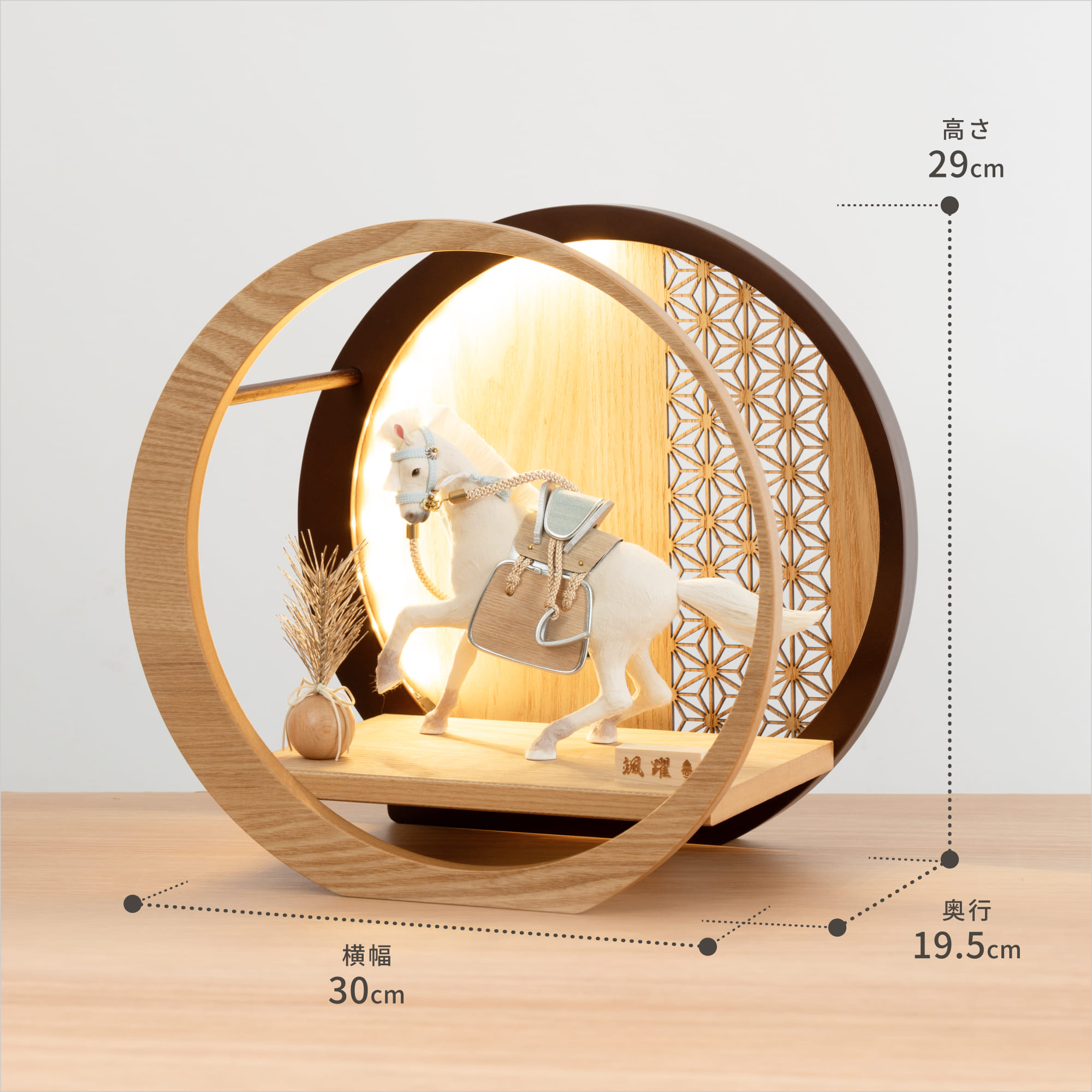 実際に手に取ると天然木の素材ならではの優しいぬくもりが伝わります。てづくり工房「木都」の職人が、伝統工芸の技術と天然木の素材を活かし、真心込めて1つ1つ丁寧につくりました。勝利や誇りの象徴でもあり、富や権力、出世の象徴のシンボルとされる馬を躍動感溢れる姿で表現した「ことの颯躍」です。※ 細かい部品が含まれています。3歳未満のお子様は、保護者の方と一緒にお遊びください。コンパクトでちょうどいいサイズコンパクトでちょうどいいサイズ今どきのおうちに合わせたコンパクトなサイズに仕上げました。飾るスペースが狭くなりがちなマンションや子ども部屋にもぴったり。子供の成長と成功を願う 馬子供の成長と成功を願う 馬戦国時代に武将を乗せて戦場を走り抜けた馬は、行動力や力の源とされる「陽」の気をもつといわれています。鞍や手綱やくつわ、あぶみなどの細部までこだわった、躍動感溢れる飾り馬です。日本の伝統柄 麻の葉日本の伝統柄 麻の葉模様は、麻の葉と呼ばれています。麻の丈夫さ・成長の早さにあやかり、子供の健やかな成長の願いが込められています。お子さまの感性を育む天然木へのこだわりお子さまの感性を育む天然木へのこだわり素材には、タモ、ブナといった天然木を使用。お子さまへの一生に一度の贈り物だから、木都は自然素材の天然木にこだわり続けています。※ 生産時期により使用する素材が一部変更になる場合がございます。熟練の職人による確かな手仕事熟練の職人による確かな手仕事伝統工芸の技術を受け継ぐ日本国内の熟練の職人が、一つひとつ丁寧に手づくりしています。おしゃれなギフト包装でお届けしますおしゃれなギフト包装でお届けします和の雰囲気を感じさせる越前和紙のギフト用ラッピングでお届け。料金がわかるものもお入れしていないので、そのまま贈り物として利用できます。商品レビュー記入でもれなくもらえる天然木のミニ名前札プレゼント商品レビュー記入でもれなくもらえる天然木のミニ名前札プレゼントミニサイズのお名前札 (通常販売価格1,980円) をプレゼント♪商品到着後、商品レビューをご記入の上、商品と同梱のチラシ記載のQRコードから応募フォームへ必要事項をご入力ください。店舗よりレビュー特典を発送いたします。※ お名前札の生年月日の表記は和暦となります。(例:令和七年)商品のご注文へ収納方法とセット内容馬・松・飾り台・電源ケーブル素材:タモ重量:1,205gサイズ:W300mm × D195mm × H290mm馬のみ:約 W210mm × D80mm × H150mm馬について本品の上には絶対に乗らないでください。本品または本品の部品は装飾品です。他の目的に使用しないで下さい。部品には小さなものがございます。お子様がお口に入れないようにご注意ください。木製品について色合いなど実際のものと写真とでは多少の誤差が生じる場合がございます。また、手作りであり天然木を使用している為、多少の仕様の変化や風合いがひとつひとつ異なります。あらかじめご了承ください。部品には小さなものがございます。お子様がお口に入れないようにご注意いください。材質により刻印の濃淡に差が生じますが不良品ではございません。木製品である限り自然なこととご承知下さいませ。保管場所は変色やカビ、サビの原因になりますので湿気の少ない場所・直射日光の当たらない場所に保管してください。ご不明点がございましたら > お問い合わせページ からご相談ください。
