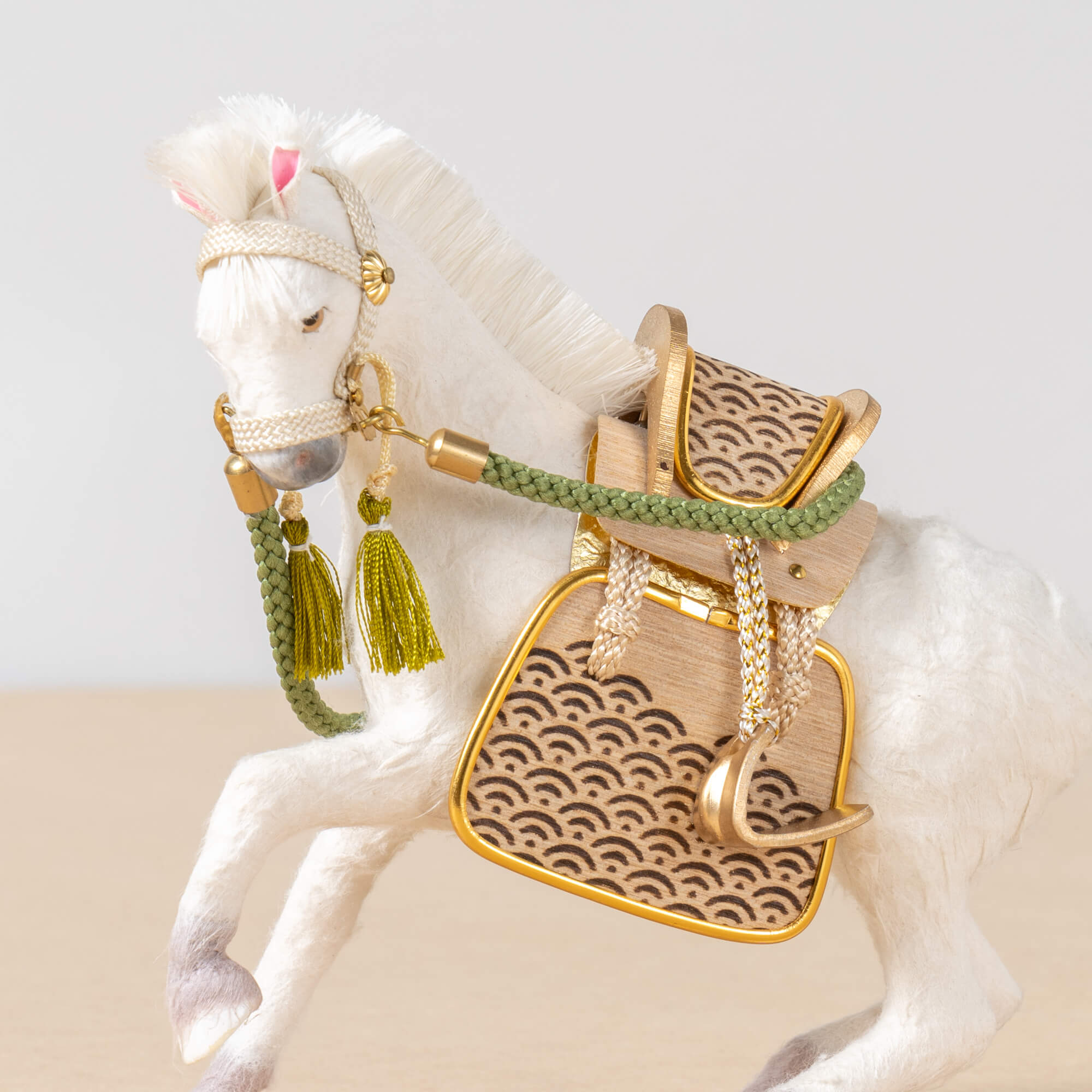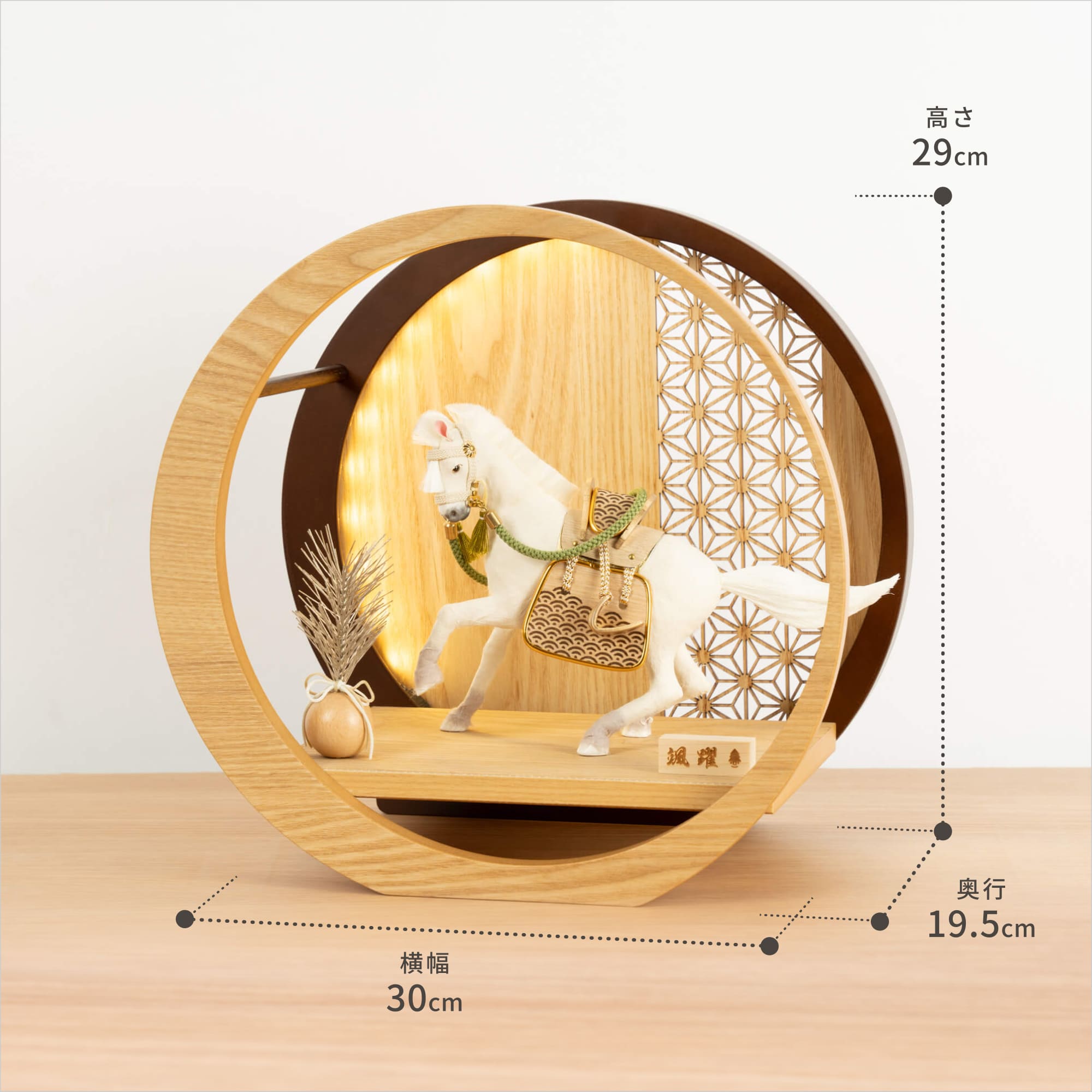 実際に手に取ると天然木の素材ならではの優しいぬくもりが伝わります。てづくり工房「木都」の職人が、伝統工芸の技術と天然木の素材を活かし、真心込めて1つ1つ丁寧につくりました。勝利や誇りの象徴でもあり、富や権力、出世の象徴のシンボルとされる馬を躍動感溢れる姿で表現した「ことの颯躍」です。※ 細かい部品が含まれています。3歳未満のお子様は、保護者の方と一緒にお遊びください。コンパクトでちょうどいいサイズコンパクトでちょうどいいサイズ今どきのおうちに合わせたコンパクトなサイズに仕上げました。飾るスペースが狭くなりがちなマンションや子ども部屋にもぴったり。子供の成長と成功を願う 馬子供の成長と成功を願う 馬戦国時代に武将を乗せて戦場を走り抜けた馬は、行動力や力の源とされる「陽」の気をもつといわれています。鞍や手綱やくつわ、あぶみなどの細部までこだわった、躍動感溢れる飾り馬です。日本の伝統柄 麻の葉日本の伝統柄 麻の葉模様は、麻の葉と呼ばれています。麻の丈夫さ・成長の早さにあやかり、子供の健やかな成長の願いが込められています。お子さまの感性を育む天然木へのこだわりお子さまの感性を育む天然木へのこだわり素材には、タモ、ブナといった天然木を使用。お子さまへの一生に一度の贈り物だから、木都は自然素材の天然木にこだわり続けています。※ 生産時期により使用する素材が一部変更になる場合がございます。熟練の職人による確かな手仕事熟練の職人による確かな手仕事伝統工芸の技術を受け継ぐ日本国内の熟練の職人が、一つひとつ丁寧に手づくりしています。おしゃれなギフト包装でお届けしますおしゃれなギフト包装でお届けします和の雰囲気を感じさせる越前和紙のギフト用ラッピングでお届け。料金がわかるものもお入れしていないので、そのまま贈り物として利用できます。商品レビュー記入でもれなくもらえる天然木のミニ名前札プレゼント商品レビュー記入でもれなくもらえる天然木のミニ名前札プレゼントミニサイズのお名前札 (通常販売価格1,980円) をプレゼント♪商品到着後、商品レビューをご記入の上、商品と同梱のチラシ記載のQRコードから応募フォームへ必要事項をご入力ください。店舗よりレビュー特典を発送いたします。※ お名前札の生年月日の表記は和暦となります。(例:令和七年)商品のご注文へ収納方法とセット内容馬・松・飾り台・電源ケーブル素材:タモ重量:1,205gサイズ:W300mm × D195mm × H290mm馬のみ:約 W210mm × D80mm × H150mm馬について本品の上には絶対に乗らないでください。本品または本品の部品は装飾品です。他の目的に使用しないで下さい。部品には小さなものがございます。お子様がお口に入れないようにご注意ください。木製品について色合いなど実際のものと写真とでは多少の誤差が生じる場合がございます。また、手作りであり天然木を使用している為、多少の仕様の変化や風合いがひとつひとつ異なります。あらかじめご了承ください。部品には小さなものがございます。お子様がお口に入れないようにご注意いください。材質により刻印の濃淡に差が生じますが不良品ではございません。木製品である限り自然なこととご承知下さいませ。保管場所は変色やカビ、サビの原因になりますので湿気の少ない場所・直射日光の当たらない場所に保管してください。ご不明点がございましたら > お問い合わせページ からご相談ください。