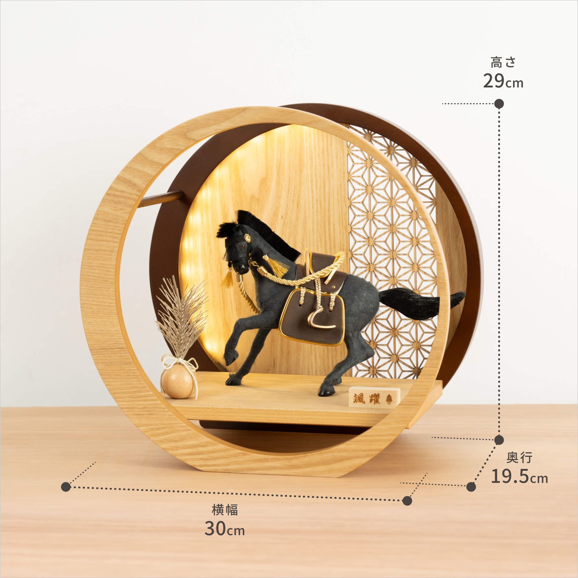 実際に手に取ると天然木の素材ならではの優しいぬくもりが伝わります。てづくり工房「木都」の職人が、伝統工芸の技術と天然木の素材を活かし、真心込めて1つ1つ丁寧につくりました。勝利や誇りの象徴でもあり、富や権力、出世の象徴のシンボルとされる馬を躍動感溢れる姿で表現した「ことの颯躍」です。※ 細かい部品が含まれています。3歳未満のお子様は、保護者の方と一緒にお遊びください。コンパクトでちょうどいいサイズコンパクトでちょうどいいサイズ今どきのおうちに合わせたコンパクトなサイズに仕上げました。飾るスペースが狭くなりがちなマンションや子ども部屋にもぴったり。子供の成長と成功を願う 馬子供の成長と成功を願う 馬戦国時代に武将を乗せて戦場を走り抜けた馬は、行動力や力の源とされる「陽」の気をもつといわれています。鞍や手綱やくつわ、あぶみなどの細部までこだわった、躍動感溢れる飾り馬です。日本の伝統柄 麻の葉日本の伝統柄 麻の葉模様は、麻の葉と呼ばれています。麻の丈夫さ・成長の早さにあやかり、子供の健やかな成長の願いが込められています。お子さまの感性を育む天然木へのこだわりお子さまの感性を育む天然木へのこだわり素材には、タモ、ブナといった天然木を使用。お子さまへの一生に一度の贈り物だから、木都は自然素材の天然木にこだわり続けています。※ 生産時期により使用する素材が一部変更になる場合がございます。熟練の職人による確かな手仕事熟練の職人による確かな手仕事伝統工芸の技術を受け継ぐ日本国内の熟練の職人が、一つひとつ丁寧に手づくりしています。おしゃれなギフト包装でお届けしますおしゃれなギフト包装でお届けします和の雰囲気を感じさせる越前和紙のギフト用ラッピングでお届け。料金がわかるものもお入れしていないので、そのまま贈り物として利用できます。商品レビュー記入でもれなくもらえる天然木のミニ名前札プレゼント商品レビュー記入でもれなくもらえる天然木のミニ名前札プレゼントミニサイズのお名前札 (通常販売価格1,980円) をプレゼント♪商品到着後、商品レビューをご記入の上、商品と同梱のチラシ記載のQRコードから応募フォームへ必要事項をご入力ください。店舗よりレビュー特典を発送いたします。※ お名前札の生年月日の表記は和暦となります。(例:令和七年)商品のご注文へ収納方法とセット内容馬・松・飾り台・電源ケーブル素材:タモ重量:1,205gサイズ:W300mm × D195mm × H290mm馬のみ:約 W210mm × D80mm × H150mm馬について本品の上には絶対に乗らないでください。本品または本品の部品は装飾品です。他の目的に使用しないで下さい。部品には小さなものがございます。お子様がお口に入れないようにご注意ください。木製品について色合いなど実際のものと写真とでは多少の誤差が生じる場合がございます。また、手作りであり天然木を使用している為、多少の仕様の変化や風合いがひとつひとつ異なります。あらかじめご了承ください。部品には小さなものがございます。お子様がお口に入れないようにご注意いください。材質により刻印の濃淡に差が生じますが不良品ではございません。木製品である限り自然なこととご承知下さいませ。保管場所は変色やカビ、サビの原因になりますので湿気の少ない場所・直射日光の当たらない場所に保管してください。ご不明点がございましたら > お問い合わせページ からご相談ください。