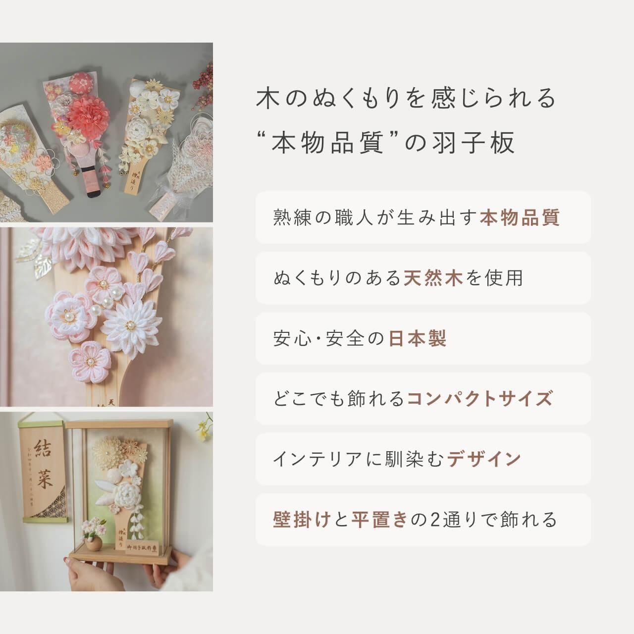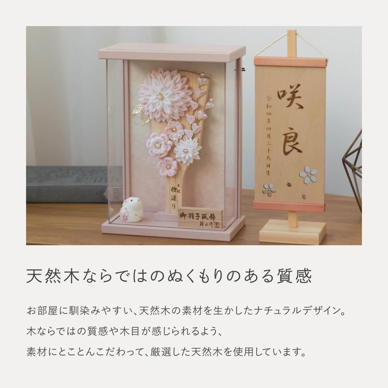女の子の無病息災のお守りとして飾られる羽子板。熟練の職人が、伝統工芸の技術と天然木の素材を活かし、心を込めて一つひとつ丁寧につくりました。コンパクトでちょうどいいサイズコンパクトでちょうどいいサイズ今どきのおうちに合わせたコンパクトなサイズに仕上げました。飾るスペースが狭くなりがちなマンションや子ども部屋にもぴったり。インテリアに溶け込むナチュラルなデザインインテリアに溶け込むナチュラルなデザイン天然木の素材を活かしたシンプルなデザインだから、お部屋の雰囲気にもピッタリ。平置きと壁掛けの2通りで飾れる平置きと壁掛けの2通りで飾れるケースの背面には紐が付属しております。そのまま置いても、壁に掛けても飾れる2WAY仕様です。取り外せる前面アクリル板取り外せる前面アクリル板お客さまの声をもとにケース前面のアクリル板を取り外し可能なデザインにリニューアル。天然木ならではのぬくもりがより伝わるようになりました。日本の伝統工芸 つまみ細工日本の伝統工芸 つまみ細工江戸時代から伝わる日本の伝統工芸で、小さな布をつまんで様々なモチーフの形を作り、装飾品として仕上げる技法です。子供の健やかな成長を願う うさぎ子供の健やかな成長を願う うさぎ力強く跳ねるうさぎは、邪気を払い、幸福を運ぶとも言われます。コロンとしたシルエットが愛らしいお子様に人気のデザインです。最高品質の越前和紙最高品質の越前和紙ケースの背面には福井県越前市の伝統工芸品『越前和紙』を採用。受け継がれる美しい質感と優れた耐久性が魅力です。お子さまの感性を育む天然木へのこだわりお子さまの感性を育む天然木へのこだわり素材には、富士山麓の無垢のヒノキやタモ、ブナといった天然木を使用。お子さまへの一生に一度の贈り物だから、木都は自然素材の天然木にこだわり続けています。※ 生産時期により使用する素材が一部変更になる場合がございます。天然木が織りなす唯一無二の風合い天然木が織りなす唯一無二の風合い様々な種類の木材を組み合わせることで、それぞれの良さを活かした羽子板に仕上げました。タモ均一で美しい木目が特徴。弾力性と強度を持ち合わせており、耐久性があります。ブナ耐久性が高く長寿のため、家具によく用いられます。明るい色調でインテリアによく馴染みます。桧ひのき特有の香りにはリラックス効果や抗菌、防虫作用があります。湿気にも強く、耐久性に優れています。桐優れた抗菌・防腐効果をもつ成分を含み、高級家具に多く用いられています。上品さのある柔らかな光沢が特徴。熟練の職人による確かな手仕事熟練の職人による確かな手仕事伝統工芸の技術を受け継ぐ日本国内の熟練の職人が、一つひとつ丁寧に手づくりしています。おしゃれなギフト包装でお届けしますおしゃれなギフト包装でお届けします和の雰囲気を感じさせる越前和紙のギフト用ラッピングでお届け。料金がわかるものもお入れしていないので、そのまま贈り物として利用できます。収納方法とセット内容羽子板素材:桧重量:660gサイズ:W180mm × D90mm × H260mm梱包時:W195mm × D100mm × H280mm※ 本商品に名前旗は付属しておりません。別途お買い求めください。注意事項色合いなど実際のものと写真とでは多少の誤差が生じる場合がございます。また、手作りであり天然木を使用している為、多少の仕様の変化や風合いがひとつひとつ異なります。あらかじめご了承ください。材質により木の刻印の濃淡に差が生じますが不良品ではございません。木製品である限り自然なこととご承知下さいませ。保管場所は変色やカビ、サビの原因になりますので湿気の少ない場所・直射日光の当たらない場所に保管してください。本商品に名前旗は付属しておりません。別途お買い求めください。ご不明点がございましたら > お問い合わせページ からご相談ください。 型番 0129 ことの羽子板 もも Pケース ¥26,900税込 送料無料(一部離島を除く) 行燈別売 ¥11,000 あわせて購入 名前旗 雛人形や五月人形とご一緒に コンパクトサイズの雛人形や五月人形と一緒に飾るのにぴったりな名前旗です。5つのカラーと3種類のデザインをお好みでお選びいただけます。 商品情報へ 行燈付き商品の場合は行燈に名入れいたします。ご注文の際は備考欄にお名前・フリガナ・生年月日をご記入ください。空欄の場合は柄のみでお作りさせて頂きます。 個 カートに追加 特定商取引法に基づく表記(返品等) レビューを見る 0 レビューを投稿 関連記事 { "pid": "188118538" }