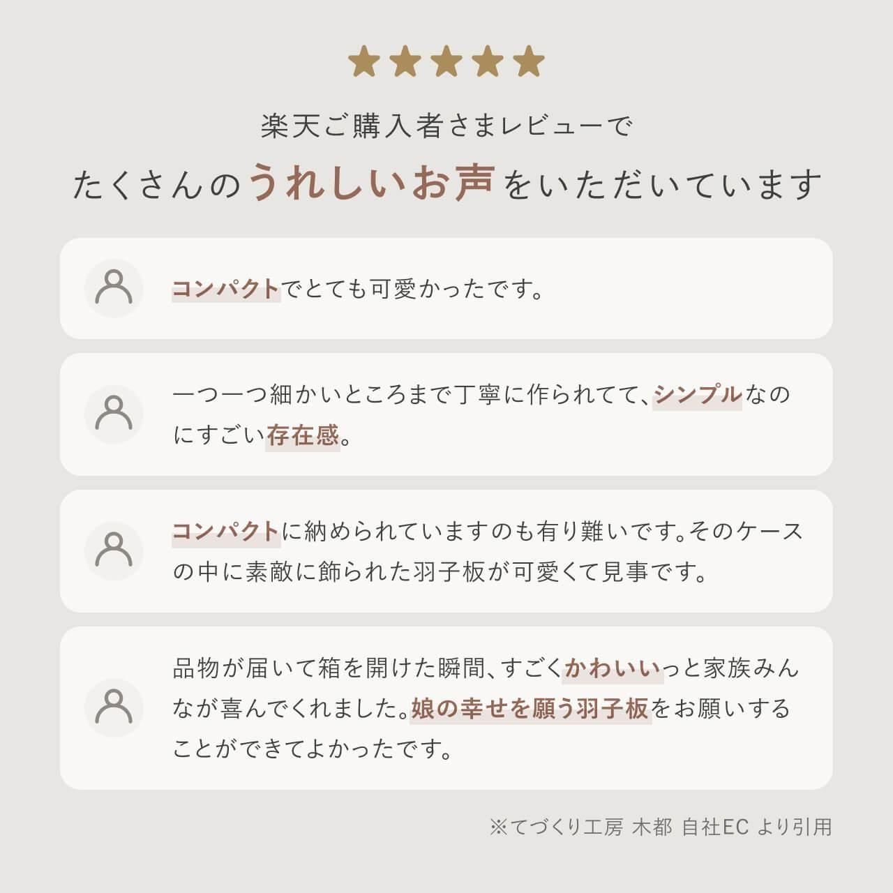 女の子の無病息災のお守りとして飾られる羽子板。熟練の職人が、伝統工芸の技術と天然木の素材を活かし、心を込めて一つひとつ丁寧につくりました。※生産時期や生地のカッティングにより、女の子の後ろのバック板の花柄は変更になる場合がございます。予めご了承ください。コンパクトでちょうどいいサイズコンパクトでちょうどいいサイズ今どきのおうちに合わせたコンパクトなサイズに仕上げました。飾るスペースが狭くなりがちなマンションや子ども部屋にもぴったり。インテリアに溶け込むナチュラルなデザインインテリアに溶け込むナチュラルなデザイン天然木の素材を活かしたシンプルなデザインだから、お部屋の雰囲気にもピッタリ。お衣装へのこだわりお衣装へのこだわり椿には長寿・厄除けの他に、「永遠の美」や「謙虚な美徳」といった意味合いもあります。凛とした美が引き立つすてきな女性に育つよう願いが込められております。日本の伝統工芸 つまみ細工日本の伝統工芸 つまみ細工江戸時代から伝わる日本の伝統工芸で、小さな布をつまんで様々なモチーフの形を作り、装飾品として仕上げる技法です。お子さまの感性を育む天然木へのこだわりお子さまの感性を育む天然木へのこだわり素材には、タモ、ブナといった天然木を使用。お子さまへの一生に一度の贈り物だから、木都は自然素材の天然木にこだわり続けています。※ 生産時期により使用する素材が一部変更になる場合がございます。天然木が織りなす唯一無二の風合い天然木が織りなす唯一無二の風合い様々な種類の木材を組み合わせることで、それぞれの良さを活かした羽子板に仕上げました。タモ均一で美しい木目が特徴。弾力性と強度を持ち合わせており、耐久性があります。ブナ耐久性が高く長寿のため、家具によく用いられます。明るい色調でインテリアによく馴染みます。桧ひのき特有の香りにはリラックス効果や抗菌、防虫作用があります。湿気にも強く、耐久性に優れています。桐優れた抗菌・防腐効果をもつ成分を含み、高級家具に多く用いられています。上品さのある柔らかな光沢が特徴。熟練の職人による確かな手仕事熟練の職人による確かな手仕事伝統工芸の技術を受け継ぐ日本国内の熟練の職人が、一つひとつ丁寧に手づくりしています。おしゃれなギフト包装でお届けしますおしゃれなギフト包装でお届けします和の雰囲気を感じさせる越前和紙のギフト用ラッピングでお届け。料金がわかるものもお入れしていないので、そのまま贈り物として利用できます。収納方法とセット内容羽子板素材:桐サイズ:W230mm × D185mm × H425mm梱包時:W270mm × D220mm × H470mm※ 本商品に名前旗は付属しておりません。別途お買い求めください。注意事項色合いなど実際のものと写真とでは多少の誤差が生じる場合がございます。また、手作りであり天然木を使用している為、多少の仕様の変化や風合いがひとつひとつ異なります。あらかじめご了承ください。材質により木の刻印の濃淡に差が生じますが不良品ではございません。木製品である限り自然なこととご承知下さいませ。保管場所は変色やカビ、サビの原因になりますので湿気の少ない場所・直射日光の当たらない場所に保管してください。本商品に名前旗は付属しておりません。別途お買い求めください。女の子の後ろのバック板の花柄は状況により変更になる場合がございます。ご了承ください。ご不明点がございましたら > お問い合わせページ からご相談ください。 型番 0190 ことのかほり羽子板 つばき Nケース ¥63,000税込 送料無料(一部離島を除く) 行燈別売 ¥11,000 あわせて購入 名前旗 雛人形や五月人形とご一緒に コンパクトサイズの雛人形や五月人形と一緒に飾るのにぴったりな名前旗です。5つのカラーと3種類のデザインをお好みでお選びいただけます。 商品情報へ 行燈付き商品の場合は行燈に名入れいたします。ご注文の際は備考欄にお名前・フリガナ・生年月日をご記入ください。空欄の場合は柄のみでお作りさせて頂きます。 個 カートに追加 特定商取引法に基づく表記(返品等) レビューを見る 0 レビューを投稿 関連記事 { "pid": "188118545" }