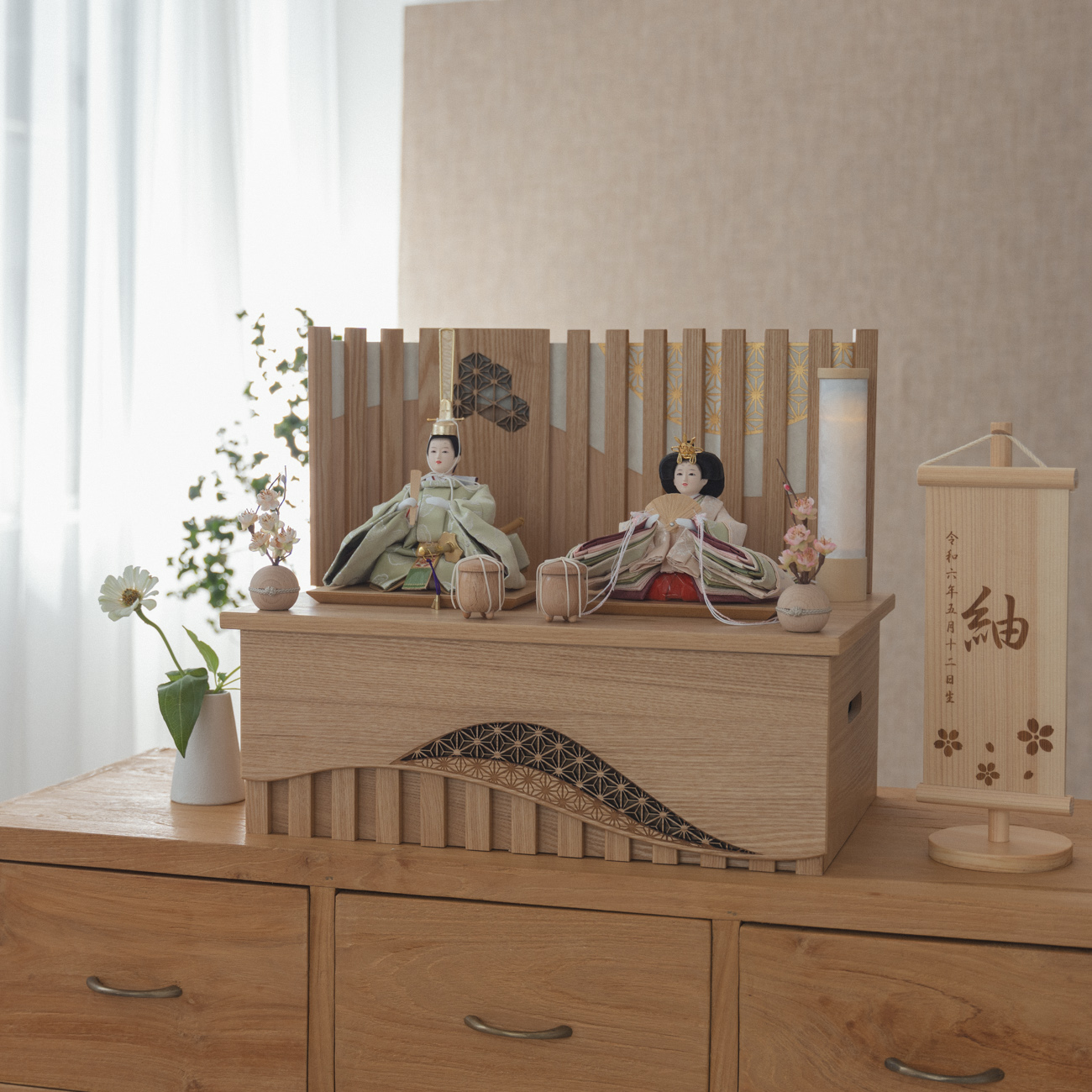 精巧な凛として美しい佇まいを天然木の優しいぬくもりが包み込む・・・まるで女の子の成長を温かく見守る家族の様に・・・そんなコンセプトから生まれた、親しみやすく、お子様と一緒に飾れる「ことの雛人形」です。コンパクトでちょうどいいサイズコンパクトでちょうどいいサイズ今どきのおうちに合わせたコンパクトなサイズに仕上げました。飾るスペースが狭くなりがちなマンションや子ども部屋にもぴったり。お部屋のイメージに調和するデザインお部屋のイメージに調和するデザイン天然木の素材を活かしたシンプルなデザインだから、お部屋の雰囲気にもピッタリ。お衣装へのこだわりお衣装へのこだわり有職裂地を使用しています。有職とは「有職故事」という宮廷の決まり事に準拠した色彩や文様で、それらで造った衣装を有職衣装と呼びます。鳳凰は中国に古くから伝わる伝説の鳥で、天命を受けて天下を治める聖天子の訪れとともにこの世に現れることから、平和と幸福のシンボルとされています。手作りへのこだわり〜裂地(きれじ)の裁断手作りへのこだわり〜裂地(きれじ)の裁断和紙で衣裳の各種型紙を作り、へり部分にのみ糊をつけ、裂地裏面に貼り付けます。型紙に沿って裁断して衣裳部品を作っていきます。手作りへのこだわり〜縫製手作りへのこだわり〜縫製姫の十二単の唐衣(からぎぬ)・五衣(いつつぎぬ)・単衣(ひとえ)・裾、殿の着物・裾・中袖等、数多くの衣裳部品をミシン、または手縫いで細やかな部分まで縫い合わせ、折り込み仕上げていきます。手作りへのこだわり〜着付け・振付け手作りへのこだわり〜着付け・振付け仕上がった衣裳は両腕を後方に曲げて羽織らせるようにして着付けます。次にそれぞれの人形の形に振付けます。腕を曲げる角度や手の位置などで全体のバランスを取ります。手作りへのこだわり〜頭差し手作りへのこだわり〜頭差し頭さしは最終の人形検品を兼ねて行われます。包まれた顔紙を外し、汚れ等無いことを確認します。頭と衣紋の中心線が一直線になるように差し込みます。ことのお雛様ことのお雛様お雛様の顔は時代とともに人気のお顔があります。ことのお雛様のお顔は時代に左右されない普遍的なシンプルで可愛らしいお顔となっています。健やかな成長への願いを込めた 麻の葉文様健やかな成長への願いを込めた 麻の葉文様古来からの日本伝統の吉祥文様である麻の葉文様。麻の丈夫さ・成長の早さにあやかり、お子さまの健やかな成長への願いが込められています。美しい曲線の木製屏風美しい曲線の木製屏風屏風はお好きな形で飾ることができます。S字や直線など、自由な形でお飾りください。お子さまの感性を育む天然木へのこだわりお子さまの感性を育む天然木へのこだわり素材には、タモ、ブナといった天然木を使用。お子さまへの一生に一度の贈り物だから、木都は自然素材の天然木にこだわり続けています。※ 生産時期により使用する素材が一部変更になる場合がございます。熟練の職人による確かな手仕事熟練の職人による確かな手仕事伝統工芸の技術を受け継ぐ日本国内の熟練の職人が、一つひとつ丁寧に手づくりしています。おしゃれなギフト包装でお届けしますおしゃれなギフト包装でお届けします和の雰囲気を感じさせる越前和紙のギフト用ラッピングでお届け。料金がわかるものもお入れしていないので、そのまま贈り物として利用できます。商品レビュー記入でもれなくもらえる天然木のミニ名前札プレゼント商品レビュー記入でもれなくもらえる天然木のミニ名前札プレゼントミニサイズのお名前札 (通常販売価格1,980円) をプレゼント♪商品到着後、商品レビューをご記入の上、商品と同梱のチラシ記載のQRコードから応募フォームへ必要事項をご入力ください。店舗よりレビュー特典を発送いたします。※ お名前札の生年月日の表記は和暦となります。(例:令和七年)商品のご注文へ収納方法とセット内容お内裏様・お雛様・屏風・収納箱・親王台・人形小道具・貝桶×2・花飾り×2・電源ケーブル屏風は収納箱の上に乗せてダンボール箱におしまい下さい。素材:タモサイズ:W455mm × D305mm × H380mm梱包時:W535mm × D340mm × H265mm殿:約 W150mm × D140mm × H195mm姫:約 W170mm × D160mm × H120mm注意事項色合いなど実際のものと写真とでは多少の誤差が生じる場合がございます。また、手作りであり天然木を使用している為、多少の仕様の変化や風合いがひとつひとつ異なります。あらかじめご了承ください。部品には小さなものがございます。お子様がお口に入れないようにご注意ください。材質により木の刻印の濃淡に差が生じますが不良品ではございません。木製品である限り自然なこととご承知下さいませ。保管場所は変色やカビ、サビの原因になりますので湿気の少ない場所・直射日光の当たらない場所に保管してください。雄雛の正面にあります飾り帯のビニールは外さないでください。本商品に行燈は付属しておりません