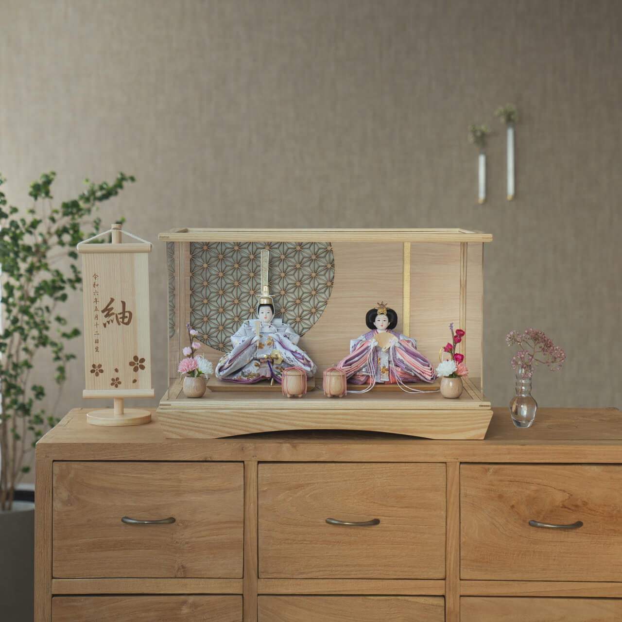 精巧な凛として美しい佇まいを天然木の優しいぬくもりが包み込む・・・まるで女の子の成長を温かく見守る家族の様に・・・そんなコンセプトから生まれた、親しみやすく、お子様と一緒に飾れる「ことの雛人形」です。コンパクトでちょうどいいサイズコンパクトでちょうどいいサイズ今どきのおうちに合わせたコンパクトなサイズに仕上げました。飾るスペースが狭くなりがちなマンションや子ども部屋にもぴったり。お部屋のイメージに調和するデザインお部屋のイメージに調和するデザイン天然木の素材を活かしたシンプルなデザインだから、お部屋の雰囲気にもピッタリ。お衣装へのこだわりお衣装へのこだわり京都西陣織金襴を使用しています。地模様には雪輪紋が入っており、桜の刺繍が施されております。その分、職人の工程も増え手間がかかっています。手作りへのこだわり〜裂地(きれじ)の裁断手作りへのこだわり〜裂地(きれじ)の裁断和紙で衣裳の各種型紙を作り、へり部分にのみ糊をつけ、裂地裏面に貼り付けます。型紙に沿って裁断して衣裳部品を作っていきます。手作りへのこだわり〜縫製手作りへのこだわり〜縫製姫の十二単の唐衣(からぎぬ)・五衣(いつつぎぬ)・単衣(ひとえ)・裾、殿の着物・裾・中袖等、数多くの衣裳部品をミシン、または手縫いで細やかな部分まで縫い合わせ、折り込み仕上げていきます。手作りへのこだわり〜着付け・振付け手作りへのこだわり〜着付け・振付け仕上がった衣裳は両腕を後方に曲げて羽織らせるようにして着付けます。次にそれぞれの人形の形に振付けます。腕を曲げる角度や手の位置などで全体のバランスを取ります。手作りへのこだわり〜頭差し手作りへのこだわり〜頭差し頭さしは最終の人形検品を兼ねて行われます。包まれた顔紙を外し、汚れ等無いことを確認します。頭と衣紋の中心線が一直線になるように差し込みます。ことのお雛様ことのお雛様お雛様の顔は時代とともに人気のお顔があります。ことのお雛様のお顔は時代に左右されない普遍的なシンプルで可愛らしいお顔となっています。健やかな成長への願いを込めた 麻の葉文様健やかな成長への願いを込めた 麻の葉文様古来からの日本伝統の吉祥文様である麻の葉文様。麻の丈夫さ・成長の早さにあやかり、お子さまの健やかな成長への願いが込められています。ケース飾りでも手に取って本物の質感を感じてほしいケース飾りでも手に取って本物の質感を感じてほしい木都のケース飾りは、本物の素材や質感を感じながら親子で一緒に手に取って飾る体験をしてほしいから、あえて飾る手間を残しています。手間はかかりますが、伝統的な技法で一つひとつ手づくりしています。お子さまの感性を育む天然木へのこだわりお子さまの感性を育む天然木へのこだわり素材には、タモ、ブナといった天然木を使用。お子さまへの一生に一度の贈り物だから、木都は自然素材の天然木にこだわり続けています。※ 生産時期により使用する素材が一部変更になる場合がございます。熟練の職人による確かな手仕事熟練の職人による確かな手仕事伝統工芸の技術を受け継ぐ日本国内の熟練の職人が、一つひとつ丁寧に手づくりしています。おしゃれなギフト包装でお届けしますおしゃれなギフト包装でお届けします和の雰囲気を感じさせる越前和紙のギフト用ラッピングでお届け。料金がわかるものもお入れしていないので、そのまま贈り物として利用できます。商品レビュー記入でもれなくもらえる天然木のミニ名前札プレゼント商品レビュー記入でもれなくもらえる天然木のミニ名前札プレゼントミニサイズのお名前札 (通常販売価格1,980円) をプレゼント♪商品到着後、商品レビューをご記入の上、商品と同梱のチラシ記載のQRコードから応募フォームへ必要事項をご入力ください。店舗よりレビュー特典を発送いたします。※ お名前札の生年月日の表記は和暦となります。(例:令和七年)商品のご注文へ収納方法とセット内容お内裏様・お雛様・ケース・下台・人形小道具・貝桶×2・花飾り×2・電源ケーブル素材:タモサイズ:W490mm × D295mm × H305mm梱包時:W550mm × D355mm × H480mm殿:約 W150mm × D140mm × H195mm姫:約 W170mm × D160mm × H120mm注意事項色合いなど実際のものと写真とでは多少の誤差が生じる場合がございます。また、手作りであり天然木を使用している為、多少の仕様の変化や風合いがひとつひとつ異なります。あらかじめご了承ください。部品には小さなものがございます。お子様がお口に入れないようにご注意ください。材質により木の刻印の濃淡に差が生じますが不良品ではございません。木製品である限り自然なこととご承知下さいませ。保管場所は変色やカビ、サビの原因になりますので湿気の少ない場所・直射日光の当たらない場所に保管してください。雄雛の正面にあります飾り帯のビニールは外さないでください。本商品に行燈は付属しておりません。別途お買い求めください。ご不