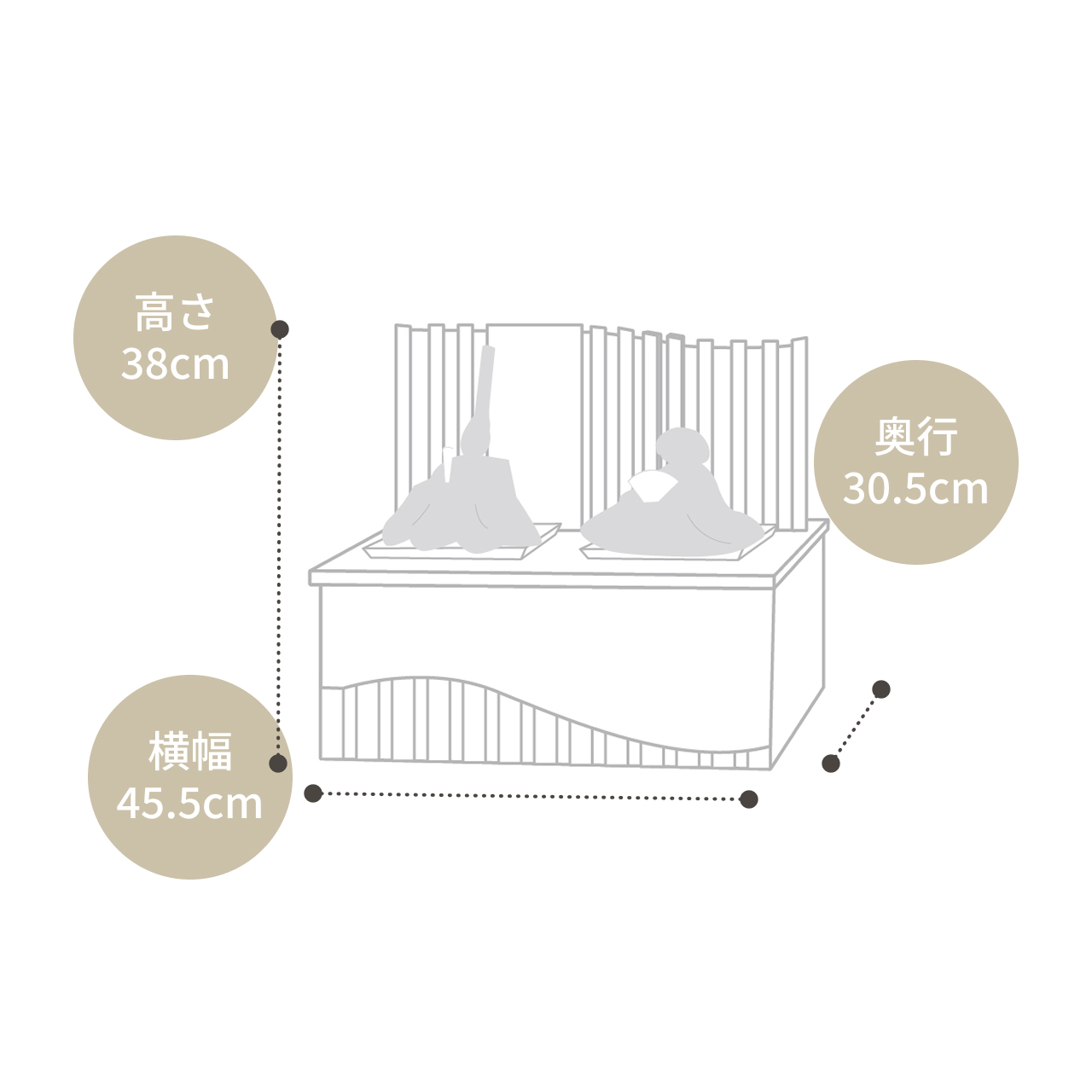 精巧な凛として美しい佇まいを天然木の優しいぬくもりが包み込む・・・まるで女の子の成長を温かく見守る家族の様に・・・そんなコンセプトから生まれた、親しみやすく、お子様と一緒に飾れる「ことの雛人形」です。コンパクトでちょうどいいサイズコンパクトでちょうどいいサイズ今どきのおうちに合わせたコンパクトなサイズに仕上げました。飾るスペースが狭くなりがちなマンションや子ども部屋にもぴったり。お部屋のイメージに調和するデザインお部屋のイメージに調和するデザイン天然木の素材を活かしたシンプルなデザインだから、お部屋の雰囲気にもピッタリ。お衣装へのこだわり 〜正絹 二重蔓牡丹文〜お衣装へのこだわり 〜正絹 二重蔓牡丹文〜日本の伝統的な文様の一つである、牡丹の花と唐草模様が組み合わさった「牡丹唐草」。牡丹には「不老不死」と「不老長寿」という意味が込められており、また、華やかで美しい牡丹の花は美と富の象徴とされています。そんな牡丹唐草の柄と小さいながらも光沢のある生地を合わせ、可愛らしさと高級感のある雛人形に仕上げました。手作りへのこだわり〜裂地(きれじ)の裁断手作りへのこだわり〜裂地(きれじ)の裁断和紙で衣裳の各種型紙を作り、へり部分にのみ糊をつけ、裂地裏面に貼り付けます。型紙に沿って裁断して衣裳部品を作っていきます。手作りへのこだわり〜縫製手作りへのこだわり〜縫製姫の十二単の唐衣(からぎぬ)・五衣(いつつぎぬ)・単衣(ひとえ)・裾、殿の着物・裾・中袖等、数多くの衣裳部品をミシン、または手縫いで細やかな部分まで縫い合わせ、折り込み仕上げていきます。手作りへのこだわり〜着付け・振付け手作りへのこだわり〜着付け・振付け仕上がった衣裳は両腕を後方に曲げて羽織らせるようにして着付けます。次にそれぞれの人形の形に振付けます。腕を曲げる角度や手の位置などで全体のバランスを取ります。手作りへのこだわり〜頭差し手作りへのこだわり〜頭差し頭さしは最終の人形検品を兼ねて行われます。包まれた顔紙を外し、汚れ等無いことを確認します。頭と衣紋の中心線が一直線になるように差し込みます。ことのお雛様ことのお雛様お雛様の顔は時代とともに人気のお顔があります。ことのお雛様のお顔は時代に左右されない普遍的なシンプルで可愛らしいお顔となっています。健やかな成長への願いを込めた 麻の葉文様健やかな成長への願いを込めた 麻の葉文様古来からの日本伝統の吉祥文様である麻の葉文様。麻の丈夫さ・成長の早さにあやかり、お子さまの健やかな成長への願いが込められています。美しい曲線の木製屏風美しい曲線の木製屏風屏風はお好きな形で飾ることができます。S字や直線など、自由な形でお飾りください。お子さまの感性を育む天然木へのこだわりお子さまの感性を育む天然木へのこだわり素材には、タモ、ブナといった天然木を使用。お子さまへの一生に一度の贈り物だから、木都は自然素材の天然木にこだわり続けています。※ 生産時期により使用する素材が一部変更になる場合がございます。熟練の職人による確かな手仕事熟練の職人による確かな手仕事伝統工芸の技術を受け継ぐ日本国内の熟練の職人が、一つひとつ丁寧に手づくりしています。おしゃれなギフト包装でお届けしますおしゃれなギフト包装でお届けします和の雰囲気を感じさせる越前和紙のギフト用ラッピングでお届け。料金がわかるものもお入れしていないので、そのまま贈り物として利用できます。商品レビュー記入でもれなくもらえる天然木のミニ名前札プレゼント商品レビュー記入でもれなくもらえる天然木のミニ名前札プレゼントミニサイズのお名前札 (通常販売価格1,980円) をプレゼント♪商品到着後、商品レビューをご記入の上、商品と同梱のチラシ記載のQRコードから応募フォームへ必要事項をご入力ください。店舗よりレビュー特典を発送いたします。※ お名前札の生年月日の表記は和暦となります。(例:令和七年)商品のご注文へ収納方法とセット内容お内裏様・お雛様・屏風・収納箱・親王台・人形小道具・貝桶×2・花飾り×2・電源ケーブル屏風は収納箱の上に乗せてダンボール箱におしまい下さい。素材:タモサイズ:W455mm × D305mm × H380mm梱包時:W535mm × D340mm × H265mm殿:約 W185mm × D165mm × H215mm姫:約 W220mm × D190mm × H125mm注意事項色合いなど実際のものと写真とでは多少の誤差が生じる場合がございます。また、手作りであり天然木を使用している為、多少の仕様の変化や風合いがひとつひとつ異なります。あらかじめご了承ください。部品には小さなものがございます。お子様がお口に入れないようにご注意ください。材質により木の刻印の濃淡に差が生じますが不良品ではございません。木製品である限り自然なこととご承知下さいませ。保管場所は変色やカビ、サビの原因になりますので湿気の少ない場所・直射日光の当たらない場所に保管してください。雄雛の正面にあり