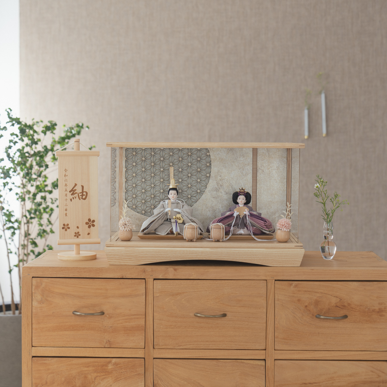 精巧な凛として美しい佇まいを天然木の優しいぬくもりが包み込む・・・まるで女の子の成長を温かく見守る家族の様に・・・そんなコンセプトから生まれた、親しみやすく、お子様と一緒に飾れる「ことの雛人形」です。コンパクトでちょうどいいサイズコンパクトでちょうどいいサイズ今どきのおうちに合わせたコンパクトなサイズに仕上げました。飾るスペースが狭くなりがちなマンションや子ども部屋にもぴったり。お部屋のイメージに調和するデザインお部屋のイメージに調和するデザイン天然木の素材を活かしたシンプルなデザインだから、お部屋の雰囲気にもピッタリ。お衣装へのこだわり(姫)お衣装へのこだわり(姫)姫の袖には野路菊とシクラメンが彩られていおり、身近にある親しみのある草花をモチーフしています。野路菊の花言葉は「真実」「高潔」「高貴」。その高貴な意味合いが、姫の優美さと純粋さを象徴しています。さらに、シクラメンの花言葉は「愛情」「絆」。寒さの中で美しい花を咲かせるため、勇気や希望を象徴する花です。お衣装へのこだわり(殿)お衣装へのこだわり(殿)殿の袖には、日本の原産種である野路菊と、春を告げる福寿草があしらわれています。福寿草の花言葉は「幸せを招く」「永久の幸福」。雪解けと共に春を知らせるように開花する花には、永遠の幸せを願う想いが込められています。手作りへのこだわり〜裂地(きれじ)の裁断手作りへのこだわり〜裂地(きれじ)の裁断和紙で衣裳の各種型紙を作り、へり部分にのみ糊をつけ、裂地裏面に貼り付けます。型紙に沿って裁断して衣裳部品を作っていきます。手作りへのこだわり〜縫製手作りへのこだわり〜縫製姫の十二単の唐衣(からぎぬ)・五衣(いつつぎぬ)・単衣(ひとえ)・裾、殿の着物・裾・中袖等、数多くの衣裳部品をミシン、または手縫いで細やかな部分まで縫い合わせ、折り込み仕上げていきます。手作りへのこだわり〜着付け・振付け手作りへのこだわり〜着付け・振付け仕上がった衣裳は両腕を後方に曲げて羽織らせるようにして着付けます。次にそれぞれの人形の形に振付けます。腕を曲げる角度や手の位置などで全体のバランスを取ります。手作りへのこだわり〜頭差し手作りへのこだわり〜頭差し頭さしは最終の人形検品を兼ねて行われます。包まれた顔紙を外し、汚れ等無いことを確認します。頭と衣紋の中心線が一直線になるように差し込みます。ことのお雛様ことのお雛様お雛様の顔は時代とともに人気のお顔があります。ことのお雛様のお顔は時代に左右されない普遍的なシンプルで可愛らしいお顔となっています。健やかな成長への願いを込めた 麻の葉文様健やかな成長への願いを込めた 麻の葉文様古来からの日本伝統の吉祥文様である麻の葉文様。麻の丈夫さ・成長の早さにあやかり、お子さまの健やかな成長への願いが込められています。ケース飾りでも手に取って本物の質感を感じてほしいケース飾りでも手に取って本物の質感を感じてほしい木都のケース飾りは、本物の素材や質感を感じながら親子で一緒に手に取って飾る体験をしてほしいから、あえて飾る手間を残しています。手間はかかりますが、伝統的な技法で一つひとつ手づくりしています。お子さまの感性を育む天然木へのこだわりお子さまの感性を育む天然木へのこだわり素材には、タモ、ブナといった天然木を使用。お子さまへの一生に一度の贈り物だから、木都は自然素材の天然木にこだわり続けています。※ 生産時期により使用する素材が一部変更になる場合がございます。熟練の職人による確かな手仕事熟練の職人による確かな手仕事伝統工芸の技術を受け継ぐ日本国内の熟練の職人が、一つひとつ丁寧に手づくりしています。おしゃれなギフト包装でお届けしますおしゃれなギフト包装でお届けします和の雰囲気を感じさせる越前和紙のギフト用ラッピングでお届け。料金がわかるものもお入れしていないので、そのまま贈り物として利用できます。商品レビュー記入でもれなくもらえる天然木のミニ名前札プレゼント商品レビュー記入でもれなくもらえる天然木のミニ名前札プレゼントミニサイズのお名前札 (通常販売価格1,980円) をプレゼント♪商品到着後、商品レビューをご記入の上、商品と同梱のチラシ記載のQRコードから応募フォームへ必要事項をご入力ください。店舗よりレビュー特典を発送いたします。※ お名前札の生年月日の表記は和暦となります。(例:令和七年)商品のご注文へ収納方法とセット内容お内裏様・お雛様・ケース・下台・人形小道具・貝桶×2・花飾り×2素材:タモサイズ:W490mm × D295mm × H305mm梱包時:W550mm × D355mm × H480mm殿:約 W160mm × D140mm × H210mm姫:約 W180mm × D160mm × H120mm注意事項色合いなど実際のものと写真とでは多少の誤差が生じる場合がございます。また、手作りであり天然木を使用している為、多少の仕様の変化や風合いがひとつひとつ異なります。あらかじめご了承ください。部品に