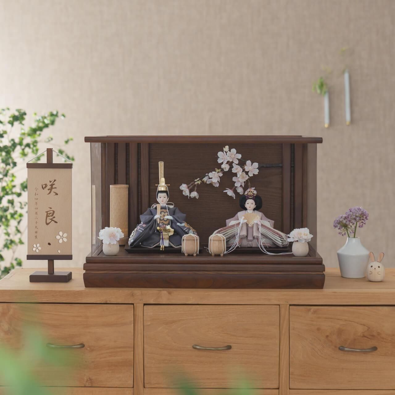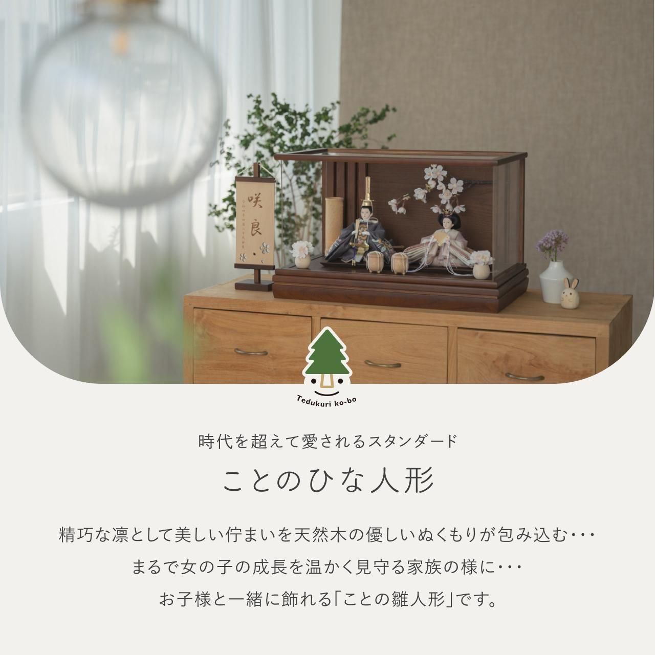 精巧な凛として美しい佇まいを天然木の優しいぬくもりが包み込む・・・まるで女の子の成長を温かく見守る家族の様に・・・そんなコンセプトから生まれた、親しみやすく、お子様と一緒に飾れる「ことの雛人形」です。コンパクトでちょうどいいサイズコンパクトでちょうどいいサイズ今どきのおうちに合わせたコンパクトなサイズに仕上げました。飾るスペースが狭くなりがちなマンションや子ども部屋にもぴったり。お部屋のイメージに調和するデザインお部屋のイメージに調和するデザイン天然木の素材を活かしたシンプルなデザインだから、お部屋の雰囲気にもピッタリ。お衣装へのこだわり(姫)お衣装へのこだわり(姫)お衣装には菊と麻の葉の刺繍を施しています。菊は、長寿や繁栄、高貴さを象徴する花であり、特に日本では天皇や皇室の象徴とされています。そのため、菊文様は格式が高いものとされ、特に公的な場や伝統的な場で使用されることが多いです。また、「不老長寿」や「不変の美」を象徴するものとして尊ばれました。お衣装へのこだわり(殿)お衣装へのこだわり(殿)麻の葉は、日本の伝統的な模様の一つです。麻の葉の形を幾何学的にデザインしたもので、成長と強さの象徴、魔除け、長寿や繁栄の象徴としても用いられています。手作りへのこだわり〜裂地(きれじ)の裁断手作りへのこだわり〜裂地(きれじ)の裁断和紙で衣裳の各種型紙を作り、へり部分にのみ糊をつけ、裂地裏面に貼り付けます。型紙に沿って裁断して衣裳部品を作っていきます。手作りへのこだわり〜縫製手作りへのこだわり〜縫製姫の十二単の唐衣(からぎぬ)・五衣(いつつぎぬ)・単衣(ひとえ)・裾、殿の着物・裾・中袖等、数多くの衣裳部品をミシン、または手縫いで細やかな部分まで縫い合わせ、折り込み仕上げていきます。手作りへのこだわり〜着付け・振付け手作りへのこだわり〜着付け・振付け仕上がった衣裳は両腕を後方に曲げて羽織らせるようにして着付けます。次にそれぞれの人形の形に振付けます。腕を曲げる角度や手の位置などで全体のバランスを取ります。手作りへのこだわり〜頭差し手作りへのこだわり〜頭差し頭さしは最終の人形検品を兼ねて行われます。包まれた顔紙を外し、汚れ等無いことを確認します。頭と衣紋の中心線が一直線になるように差し込みます。ことのお雛様ことのお雛様お雛様の顔は時代とともに人気のお顔があります。ことのお雛様のお顔は時代に左右されない普遍的なシンプルで可愛らしいお顔となっています。満開の枝桜が彩るケース満開の枝桜が彩るケース桜には縁起の良いことのはじまりや豊かさという意味があります。「お殿様とお雛様が桜の下で未来を誓う」そんなイメージから出来上がりました。ケース飾りでも手に取って本物の質感を感じてほしいケース飾りでも手に取って本物の質感を感じてほしい木都のケース飾りは、本物の素材や質感を感じながら親子で一緒に手に取って飾る体験をしてほしいから、あえて飾る手間を残しています。手間はかかりますが、伝統的な技法で一つひとつ手づくりしています。お子さまの感性を育む天然木へのこだわりお子さまの感性を育む天然木へのこだわり素材には、タモ、ブナといった天然木を使用。お子さまへの一生に一度の贈り物だから、木都は自然素材の天然木にこだわり続けています。※ 生産時期により使用する素材が一部変更になる場合がございます。熟練の職人による確かな手仕事熟練の職人による確かな手仕事伝統工芸の技術を受け継ぐ日本国内の熟練の職人が、一つひとつ丁寧に手づくりしています。おしゃれなギフト包装でお届けしますおしゃれなギフト包装でお届けします和の雰囲気を感じさせる越前和紙のギフト用ラッピングでお届け。料金がわかるものもお入れしていないので、そのまま贈り物として利用できます。商品レビュー記入でもれなくもらえる天然木のミニ名前札プレゼント商品レビュー記入でもれなくもらえる天然木のミニ名前札プレゼントミニサイズのお名前札 (通常販売価格1,980円) をプレゼント♪商品到着後、商品レビューをご記入の上、商品と同梱のチラシ記載のQRコードから応募フォームへ必要事項をご入力ください。店舗よりレビュー特典を発送いたします。※ お名前札の生年月日の表記は和暦となります。(例:令和七年)商品のご注文へ収納方法とセット内容お内裏様・お雛様・ケース・下台・人形小道具・貝桶×2・花飾り×2素材:タモサイズ:W490mm × D295mm × H305mm梱包時:W550mm × D355mm × H480mm殿:約 W150mm × D120mm × H210mm姫:約 W180mm × D170mm × H130mm注意事項色合いなど実際のものと写真とでは多少の誤差が生じる場合がございます。また、手作りであり天然木を使用している為、多少の仕様の変化や風合いがひとつひとつ異なります。あらかじめご了承ください。部品には小さなものがございます。お子様がお口に入れないようにご注意ください。材質により木の刻印の濃淡に差が