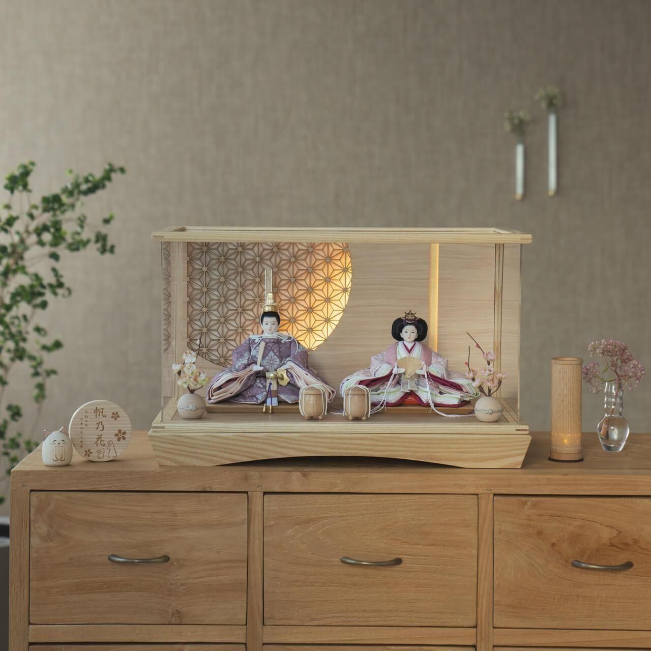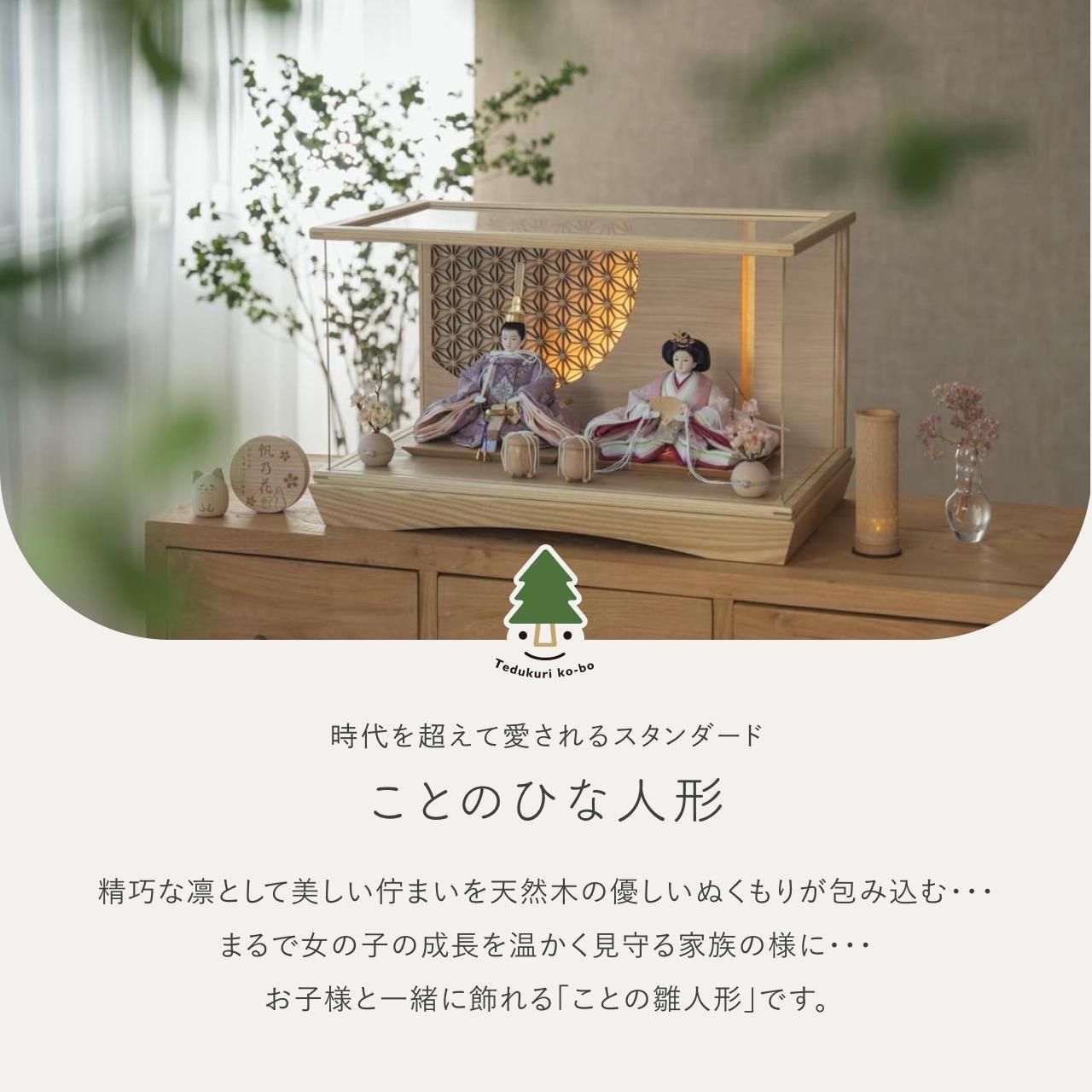 精巧な凛として美しい佇まいを天然木の優しいぬくもりが包み込む・・・まるで女の子の成長を温かく見守る家族の様に・・・そんなコンセプトから生まれた、親しみやすく、お子様と一緒に飾れる「ことの雛人形」です。コンパクトでちょうどいいサイズコンパクトでちょうどいいサイズ今どきのおうちに合わせたコンパクトなサイズに仕上げました。飾るスペースが狭くなりがちなマンションや子ども部屋にもぴったり。お部屋のイメージに調和するデザインお部屋のイメージに調和するデザイン天然木の素材を活かしたシンプルなデザインだから、お部屋の雰囲気にもピッタリ。お衣装へのこだわり(姫)お衣装へのこだわり(姫)小葵紋様は、平安時代に広く使用された伝統的な紋様です。天皇の下襲 (したがさね) や皇族の五衣 (いつつぎぬ) といった装束や調度品にも用いられました。この紋様は冬葵の花と葉を象ったもので、花の周りを4枚の葉が囲む連続模様が特徴です。お衣装へのこだわり(殿)お衣装へのこだわり(殿)葵 (あおい) は古くから「アフヒ」とも呼ばれており、「アフヒ」には「神をもてなす日」という意味が込められているとされています。葵の花には、長寿や繁栄、高貴さを象徴する花であり、子供の成長を願う想いが込められています。手作りへのこだわり〜裂地(きれじ)の裁断手作りへのこだわり〜裂地(きれじ)の裁断和紙で衣裳の各種型紙を作り、へり部分にのみ糊をつけ、裂地裏面に貼り付けます。型紙に沿って裁断して衣裳部品を作っていきます。手作りへのこだわり〜縫製手作りへのこだわり〜縫製姫の十二単の唐衣(からぎぬ)・五衣(いつつぎぬ)・単衣(ひとえ)・裾、殿の着物・裾・中袖等、数多くの衣裳部品をミシン、または手縫いで細やかな部分まで縫い合わせ、折り込み仕上げていきます。手作りへのこだわり〜着付け・振付け手作りへのこだわり〜着付け・振付け仕上がった衣裳は両腕を後方に曲げて羽織らせるようにして着付けます。次にそれぞれの人形の形に振付けます。腕を曲げる角度や手の位置などで全体のバランスを取ります。手作りへのこだわり〜頭差し手作りへのこだわり〜頭差し頭さしは最終の人形検品を兼ねて行われます。包まれた顔紙を外し、汚れ等無いことを確認します。頭と衣紋の中心線が一直線になるように差し込みます。ことのお雛様ことのお雛様お雛様の顔は時代とともに人気のお顔があります。ことのお雛様のお顔は時代に左右されない普遍的なシンプルで可愛らしいお顔となっています。健やかな成長への願いを込めた 麻の葉文様健やかな成長への願いを込めた 麻の葉文様古来からの日本伝統の吉祥文様である麻の葉文様。麻の丈夫さ・成長の早さにあやかり、お子さまの健やかな成長への願いが込められています。ケース飾りでも手に取って本物の質感を感じてほしいケース飾りでも手に取って本物の質感を感じてほしい木都のケース飾りは、本物の素材や質感を感じながら親子で一緒に手に取って飾る体験をしてほしいから、あえて飾る手間を残しています。手間はかかりますが、伝統的な技法で一つひとつ手づくりしています。お子さまの感性を育む天然木へのこだわりお子さまの感性を育む天然木へのこだわり素材には、タモ、ブナといった天然木を使用。お子さまへの一生に一度の贈り物だから、木都は自然素材の天然木にこだわり続けています。※ 生産時期により使用する素材が一部変更になる場合がございます。熟練の職人による確かな手仕事熟練の職人による確かな手仕事伝統工芸の技術を受け継ぐ日本国内の熟練の職人が、一つひとつ丁寧に手づくりしています。おしゃれなギフト包装でお届けしますおしゃれなギフト包装でお届けします和の雰囲気を感じさせる越前和紙のギフト用ラッピングでお届け。料金がわかるものもお入れしていないので、そのまま贈り物として利用できます。商品レビュー記入でもれなくもらえる天然木のミニ名前札プレゼント商品レビュー記入でもれなくもらえる天然木のミニ名前札プレゼントミニサイズのお名前札 (通常販売価格1,980円) をプレゼント♪商品到着後、商品レビューをご記入の上、商品と同梱のチラシ記載のQRコードから応募フォームへ必要事項をご入力ください。店舗よりレビュー特典を発送いたします。※ お名前札の生年月日の表記は和暦となります。(例:令和七年)商品のご注文へ収納方法とセット内容お内裏様・お雛様・ケース・下台・人形小道具・貝桶×2・花飾り×2・電源ケーブル素材:タモサイズ:W490mm × D295mm × H305mm梱包時:W550mm × D355mm × H480mm殿:約 W160mm × D150mm × H210mm姫:約 W200mm × D170mm × H140mm注意事項色合いなど実際のものと写真とでは多少の誤差が生じる場合がございます。また、手作りであり天然木を使用している為、多少の仕様の変化や風合いがひとつひとつ異なります。あらかじめご了承ください。部品には小さなものがございます。お子様がお口に入れないようにご注意