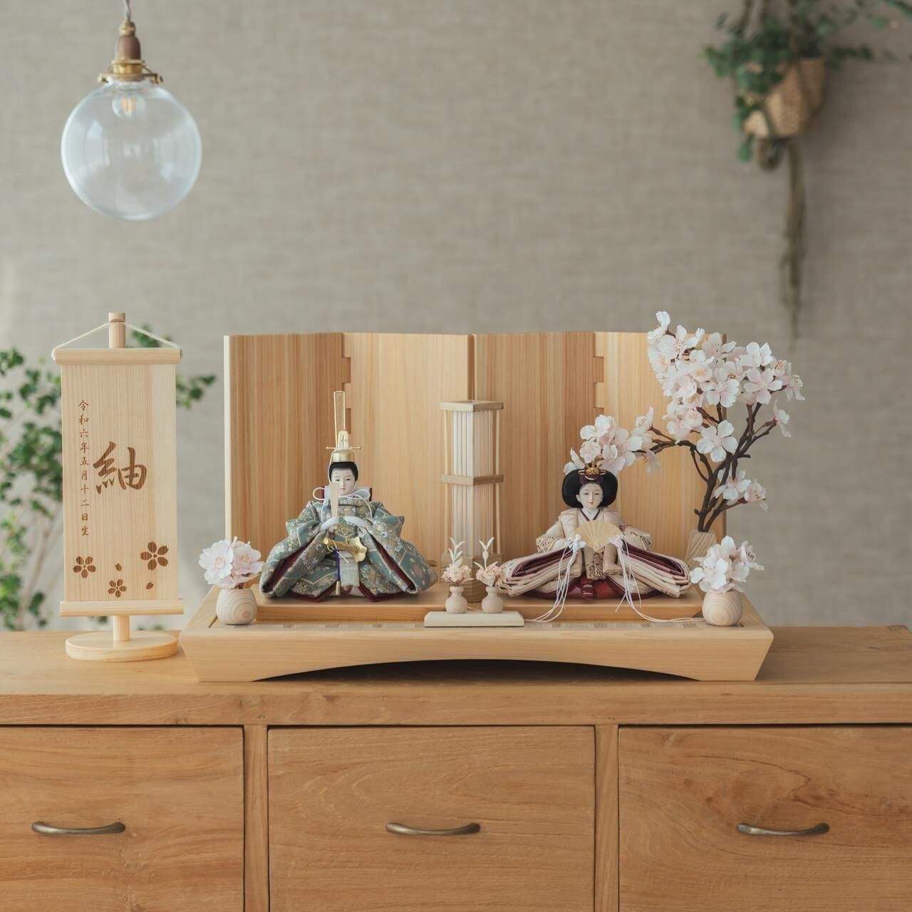 精巧な凛として美しい佇まいを天然木の優しいぬくもりが包み込む・・・まるで女の子の成長を温かく見守る家族の様に・・・そんなコンセプトから生まれた、親しみやすく、お子様と一緒に飾れる「ことの雛人形」です。コンパクトでちょうどいいサイズコンパクトでちょうどいいサイズ今どきのおうちに合わせたコンパクトなサイズに仕上げました。飾るスペースが狭くなりがちなマンションや子ども部屋にもぴったり。お部屋のイメージに調和するデザインお部屋のイメージに調和するデザイン天然木の素材を活かしたシンプルなデザインだから、お部屋の雰囲気にもピッタリ。手作りへのこだわり〜裂地(きれじ)の裁断手作りへのこだわり〜裂地(きれじ)の裁断和紙で衣裳の各種型紙を作り、へり部分にのみ糊をつけ、裂地裏面に貼り付けます。型紙に沿って裁断して衣裳部品を作っていきます。手作りへのこだわり〜縫製手作りへのこだわり〜縫製姫の十二単の唐衣(からぎぬ)・五衣(いつつぎぬ)・単衣(ひとえ)・裾、殿の着物・裾・中袖等、数多くの衣裳部品をミシン、または手縫いで細やかな部分まで縫い合わせ、折り込み仕上げていきます。手作りへのこだわり〜着付け・振付け手作りへのこだわり〜着付け・振付け仕上がった衣裳は両腕を後方に曲げて羽織らせるようにして着付けます。次にそれぞれの人形の形に振付けます。腕を曲げる角度や手の位置などで全体のバランスを取ります。手作りへのこだわり〜頭差し手作りへのこだわり〜頭差し頭さしは最終の人形検品を兼ねて行われます。包まれた顔紙を外し、汚れ等無いことを確認します。頭と衣紋の中心線が一直線になるように差し込みます。ことのお雛様ことのお雛様お雛様の顔は時代とともに人気のお顔があります。ことのお雛様のお顔は時代に左右されない普遍的なシンプルで可愛らしいお顔となっています。お子さまの感性を育む天然木へのこだわりお子さまの感性を育む天然木へのこだわり素材には、富士山麓の無垢のヒノキやタモ、ブナといった天然木を使用。お子さまへの一生に一度の贈り物だから、木都は自然素材の天然木にこだわり続けています。※ 生産時期により使用する素材が一部変更になる場合がございます。熟練の職人による確かな手仕事熟練の職人による確かな手仕事伝統工芸の技術を受け継ぐ日本国内の熟練の職人が、一つひとつ丁寧に手づくりしています。おしゃれなギフト包装でお届けしますおしゃれなギフト包装でお届けします和の雰囲気を感じさせる越前和紙のギフト用ラッピングでお届け。料金がわかるものもお入れしていないので、そのまま贈り物として利用できます。商品レビュー記入でもれなくもらえる天然木のミニ名前札プレゼント商品レビュー記入でもれなくもらえる天然木のミニ名前札プレゼントミニサイズのお名前札 (通常販売価格1,980円) をプレゼント♪商品到着後、商品レビューをご記入の上、商品と同梱のチラシ記載のQRコードから応募フォームへ必要事項をご入力ください。店舗よりレビュー特典を発送いたします。※ お名前札の生年月日の表記は和暦となります。(例:令和七年)商品のご注文へ収納方法とセット内容お内裏様・お雛様・屏風・平台・親王台・人形小道具・前飾り・花飾り×2・桜飾り・行燈屏風は平台と同様に個別でダンボール箱におしまい下さい。親王台は屏風のダンボールに入れます。素材:ヒノキサイズ:W495mm × D305mm × H230mm梱包時:W535mm × D340mm × H265mm殿:W155mm × D120mm × H200mm姫:W180mm × D160mm × H120mm注意事項色合いなど実際のものと写真とでは多少の誤差が生じる場合がございます。また、手作りであり天然木を使用している為、多少の仕様の変化や風合いがひとつひとつ異なります。あらかじめご了承ください。部品には小さなものがございます。お子様がお口に入れないようにご注意ください。材質により木の刻印の濃淡に差が生じますが不良品ではございません。木製品である限り自然なこととご承知下さいませ。保管場所は変色やカビ、サビの原因になりますので湿気の少ない場所・直射日光の当たらない場所に保管してください。雄雛の正面にあります飾り帯のビニールは外さないでください。本商品に行燈は付属しておりません。別途お買い求めください。ご不明点がございましたら > お問い合わせページ からご相談ください。