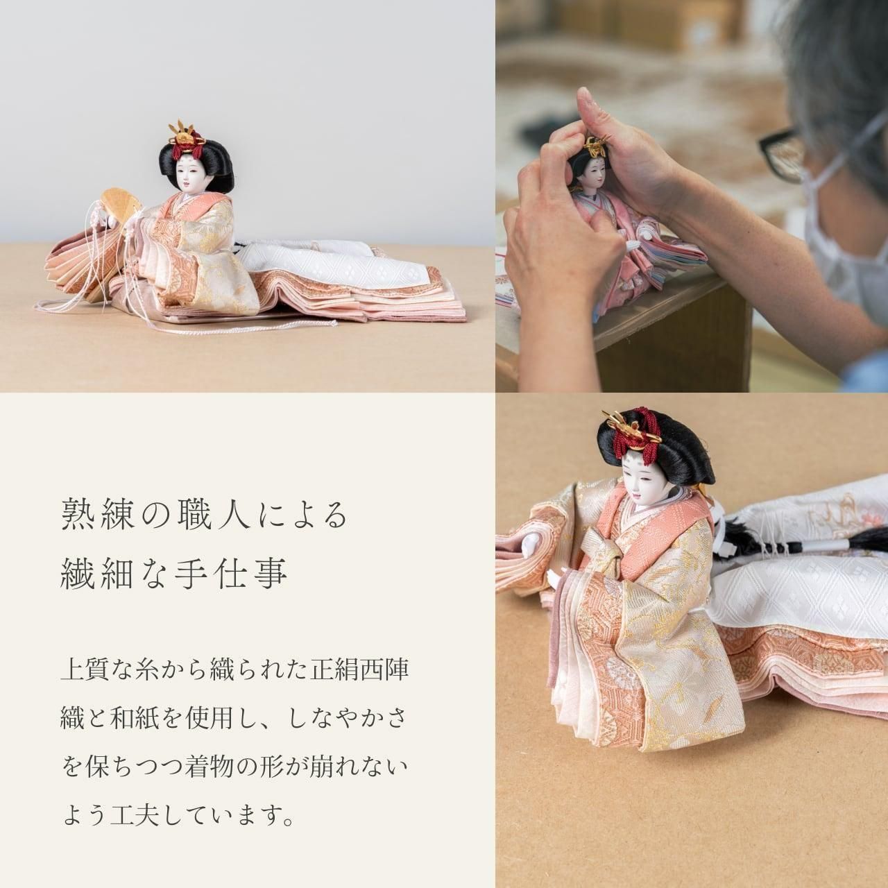 お衣装へのこだわり 〜小菊唐草小葵文〜衣装には、不老長寿を象徴する菊と、途切れることなく蔓を伸ばすことから子孫繁栄の意味をもつ唐草に、好機好転を表す「葵」の紋様を組み込んだ、縁起の良い小菊唐草小葵文が描かれています。一般的な親王の形とは違い、お姫様の着物の裾を長くし、平安絵巻のような流れる動きをつけました。横向きに飾ることで、衣装と裾重ねの色の美しさを同時に楽しんでいただけます。上質な糸から織られた正絹西陣織と和紙を使用し、しなやかさを保ちつつ着物の形が崩れないよう工夫しました。
