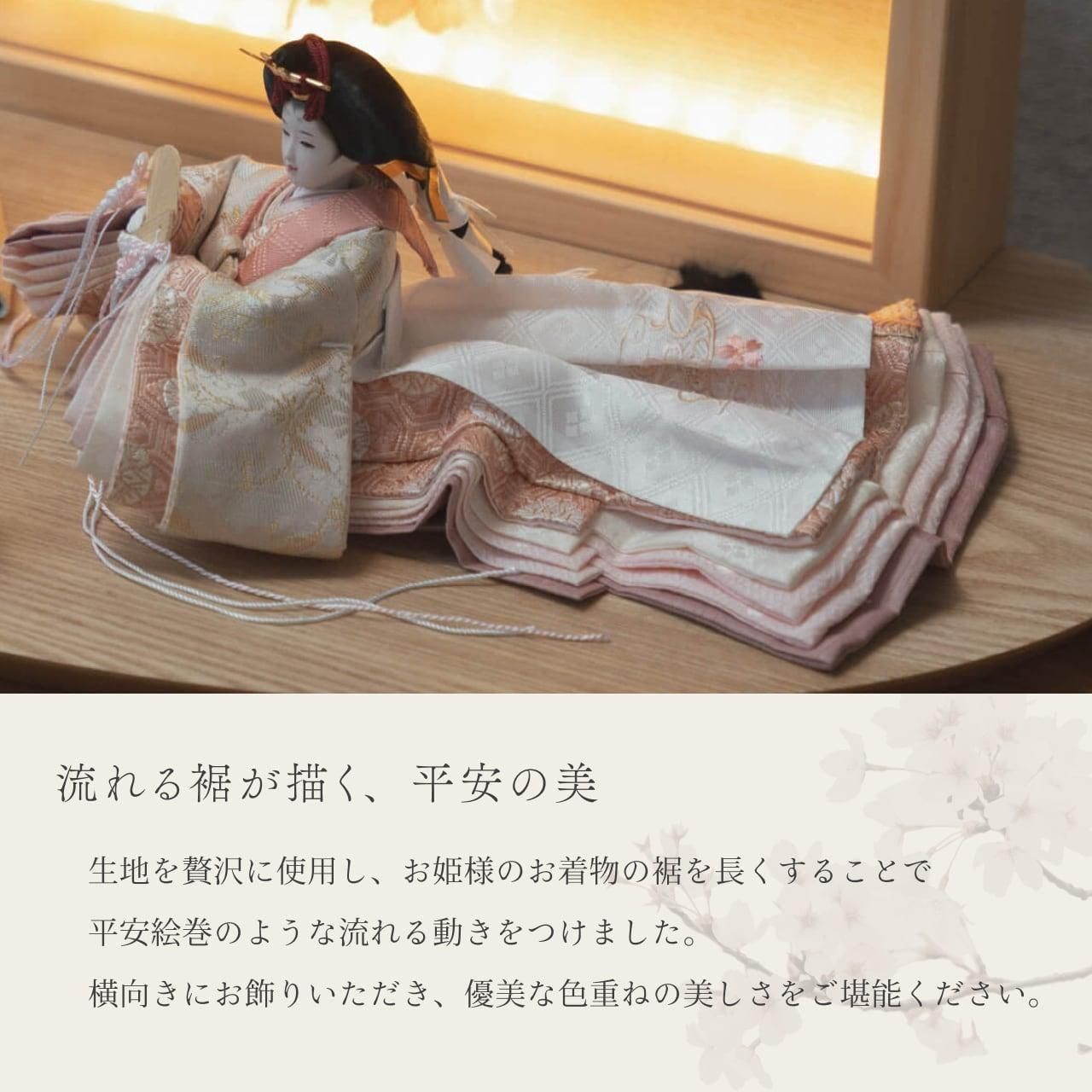 一般的な親王の形とは違い、お姫様の着物の裾を長くし、平安絵巻のような流れる動きをつけました。横向きに飾ることで、衣装と裾重ねの色の美しさを同時に楽しんでいただけます。