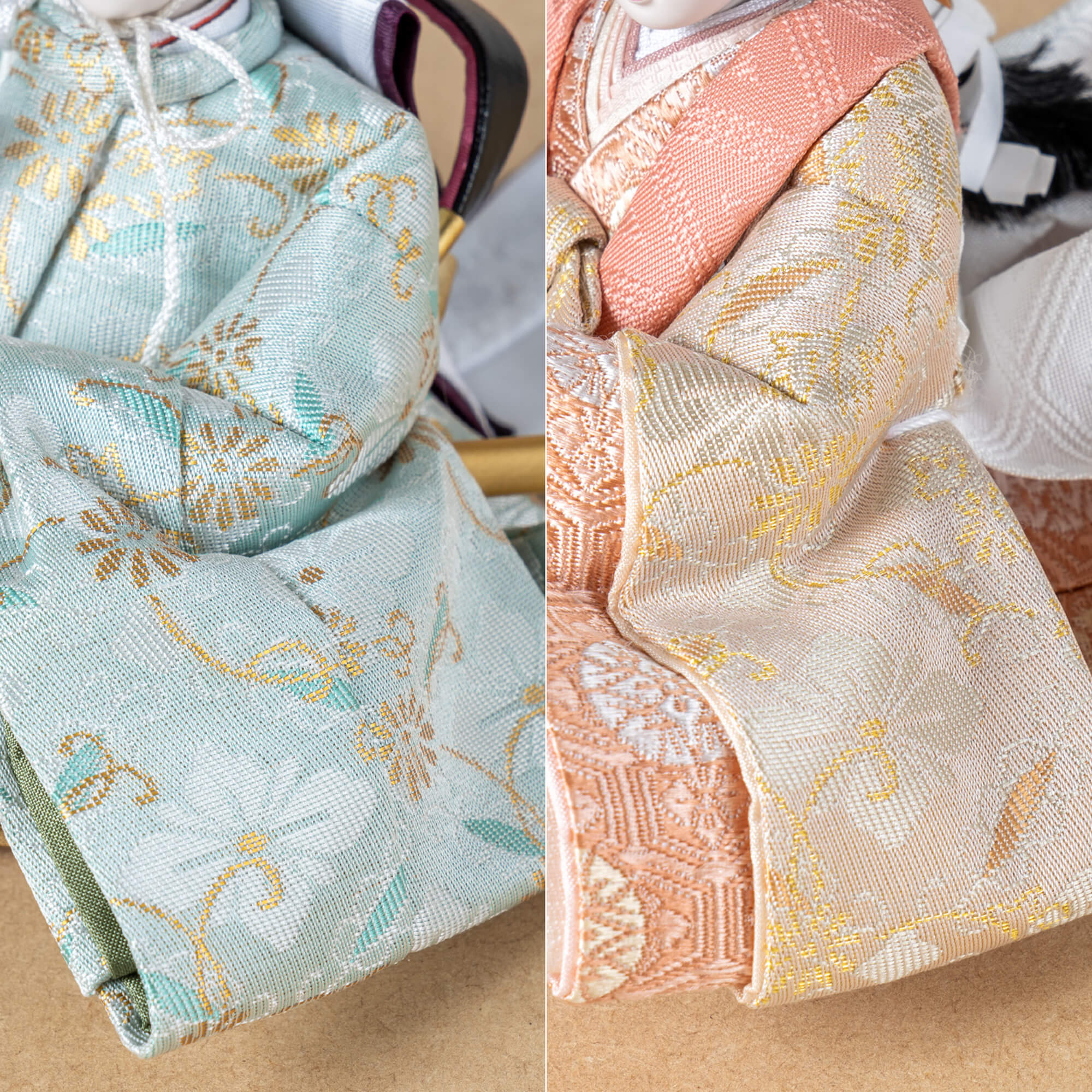 お衣装へのこだわり 〜小菊唐草小葵文〜衣装には、不老長寿を象徴する菊と、途切れることなく蔓を伸ばすことから子孫繁栄の意味をもつ唐草に、好機好転を表す「葵」の紋様を組み込んだ、縁起の良い小菊唐草小葵文が描かれています。一般的な親王の形とは違い、お姫様の着物の裾を長くし、平安絵巻のような流れる動きをつけました。横向きに飾ることで、衣装と裾重ねの色の美しさを同時に楽しんでいただけます。上質な糸から織られた正絹西陣織と和紙を使用し、しなやかさを保ちつつ着物の形が崩れないよう工夫しました。