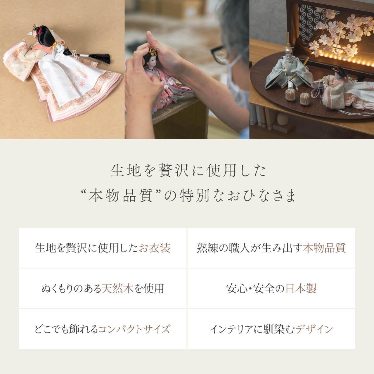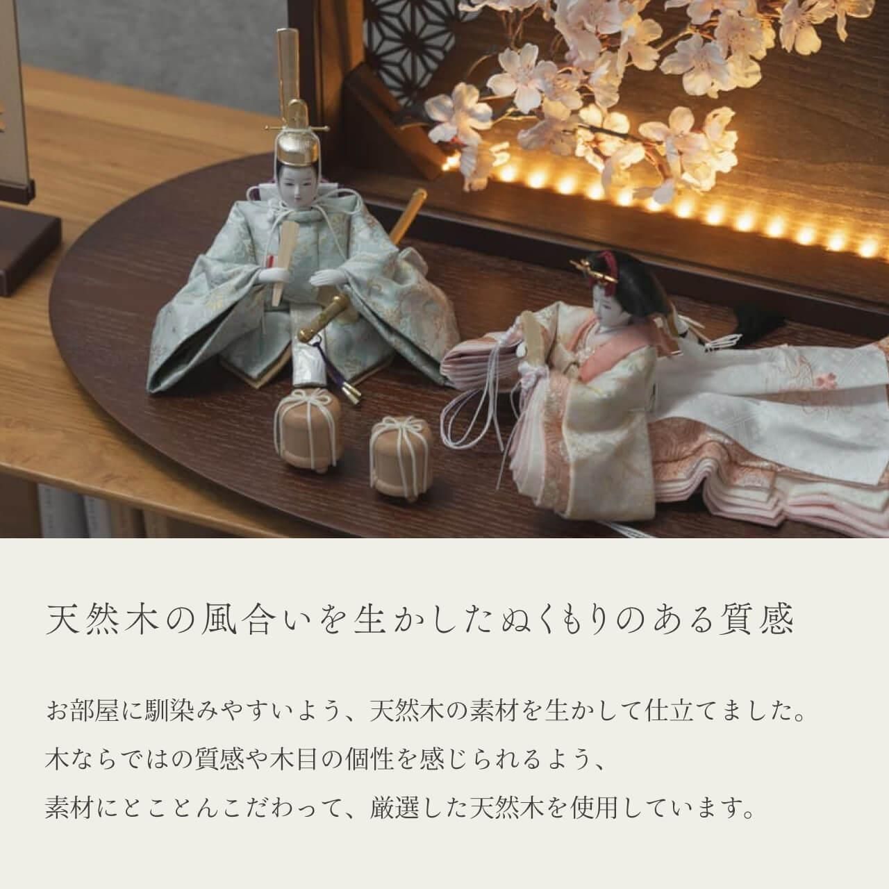 平安という言葉は平安京に由来しており、「穏やか」「安泰」といった願いが込められております。ことの平安ひなとは、お子様の成長や未来が穏やかで無事であるよう祈りを込めたお雛様です。そんな雛人形をてづくり工房「木都」の職人が、伝統工芸の技術と天然木の素材を活かし、真心込めて1つ1つ丁寧につくりました。コンパクトでちょうどいいサイズコンパクトでちょうどいいサイズ今どきのおうちに合わせたコンパクトなサイズに仕上げました。飾るスペースが狭くなりがちなマンションや子ども部屋にもぴったり。お部屋のイメージに調和するデザインお部屋のイメージに調和するデザイン天然木の素材を活かしたシンプルなデザインだから、お部屋の雰囲気にもピッタリ。お衣装へのこだわり 〜小菊唐草小葵文〜お衣装へのこだわり 〜小菊唐草小葵文〜衣装には、不老長寿を象徴する菊と、途切れることなく蔓を伸ばすことから子孫繁栄の意味をもつ唐草に、好機好転を表す「葵」の紋様を組み込んだ、縁起の良い小菊唐草小葵文が描かれています。一般的な親王の形とは違い、お姫様の着物の裾を長くし、平安絵巻のような流れる動きをつけました。横向きに飾ることで、衣装と裾重ねの色の美しさを同時に楽しんでいただけます。上質な糸から織られた正絹西陣織と和紙を使用し、しなやかさを保ちつつ着物の形が崩れないよう工夫しました。手作りへのこだわり 〜裂地(きれじ)の裁断手作りへのこだわり 〜裂地(きれじ)の裁断和紙で衣裳の各種型紙を作り、へり部分にのみ糊をつけ、裂地裏面に貼り付けます。型紙に沿って裁断して衣裳部品を作っていきます。手作りへのこだわり 〜縫製手作りへのこだわり 〜縫製姫の十二単の唐衣(からぎぬ)・五衣(いつつぎぬ)・単衣(ひとえ)・裾、殿の着物・裾・中袖等、数多くの衣裳部品をミシン、または手縫いで細やかな部分まで縫い合わせ、折り込み仕上げていきます。手作りへのこだわり 〜着付け・振付け手作りへのこだわり 〜着付け・振付け仕上がった衣裳は両腕を後方に曲げて羽織らせるようにして着付けます。次にそれぞれの人形の形に振付けます。腕を曲げる角度や手の位置などで全体のバランスを取ります。手作りへのこだわり 〜頭差し手作りへのこだわり 〜頭差し頭さしは最終の人形検品を兼ねて行われます。包まれた顔紙を外し、汚れ等無いことを確認します。頭と衣紋の中心線が一直線になるように差し込みます。ことのお雛様ことのお雛様お雛様の顔は時代とともに人気のお顔があります。ことのお雛様のお顔は時代に左右されない普遍的なシンプルで可愛らしいお顔となっています。健やかな成長への願いを込めた 麻の葉文様健やかな成長への願いを込めた 麻の葉文様古来からの日本伝統の吉祥文様である麻の葉文様。麻の丈夫さ・成長の早さにあやかり、お子さまの健やかな成長への願いが込められています。お子さまの感性を育む天然木へのこだわりお子さまの感性を育む天然木へのこだわり素材には、タモ、ブナといった天然木を使用。お子さまへの一生に一度の贈り物だから、木都は自然素材の天然木にこだわり続けています。※ 生産時期により使用する素材が一部変更になる場合がございます。熟練の職人による確かな手仕事熟練の職人による確かな手仕事伝統工芸の技術を受け継ぐ日本国内の熟練の職人が、一つひとつ丁寧に手づくりしています。おしゃれなギフト包装でお届けしますおしゃれなギフト包装でお届けします和の雰囲気を感じさせる越前和紙のギフト用ラッピングでお届け。料金がわかるものもお入れしていないので、そのまま贈り物として利用できます。商品レビュー記入でもれなくもらえる天然木のミニ名前札プレゼント商品レビュー記入でもれなくもらえる天然木のミニ名前札プレゼントミニサイズのお名前札 (通常販売価格1,980円) をプレゼント♪商品到着後、商品レビューをご記入の上、商品と同梱のチラシ記載のQRコードから応募フォームへ必要事項をご入力ください。店舗よりレビュー特典を発送いたします。※ お名前札の生年月日の表記は和暦となります。(例:令和七年)商品のご注文へ収納方法とセット内容お内裏様・お雛様・衝立・平台・人形小道具・貝桶×2・電源ケーブル素材:タモサイズ:W530mm × D335mm × H250mm梱包時:W560mm × D200mm × H400mm殿:約 W155mm × D160mm × H165mm姫:約 W140mm × D440mm × H110mm注意事項色合いなど実際のものと写真とでは多少の誤差が生じる場合がございます。また、手作りであり天然木を使用している為、多少の仕様の変化や風合いがひとつひとつ異なります。あらかじめご了承ください。部品には小さなものがございます。お子様がお口に入れないようにご注意ください。材質により木の刻印の濃淡に差が生じますが不良品ではございません。木製品である限り自然なこととご承知下さいませ。保管場所は変色やカビ、サビの原因になりますので湿気の少ない場所・直射日光の当たら