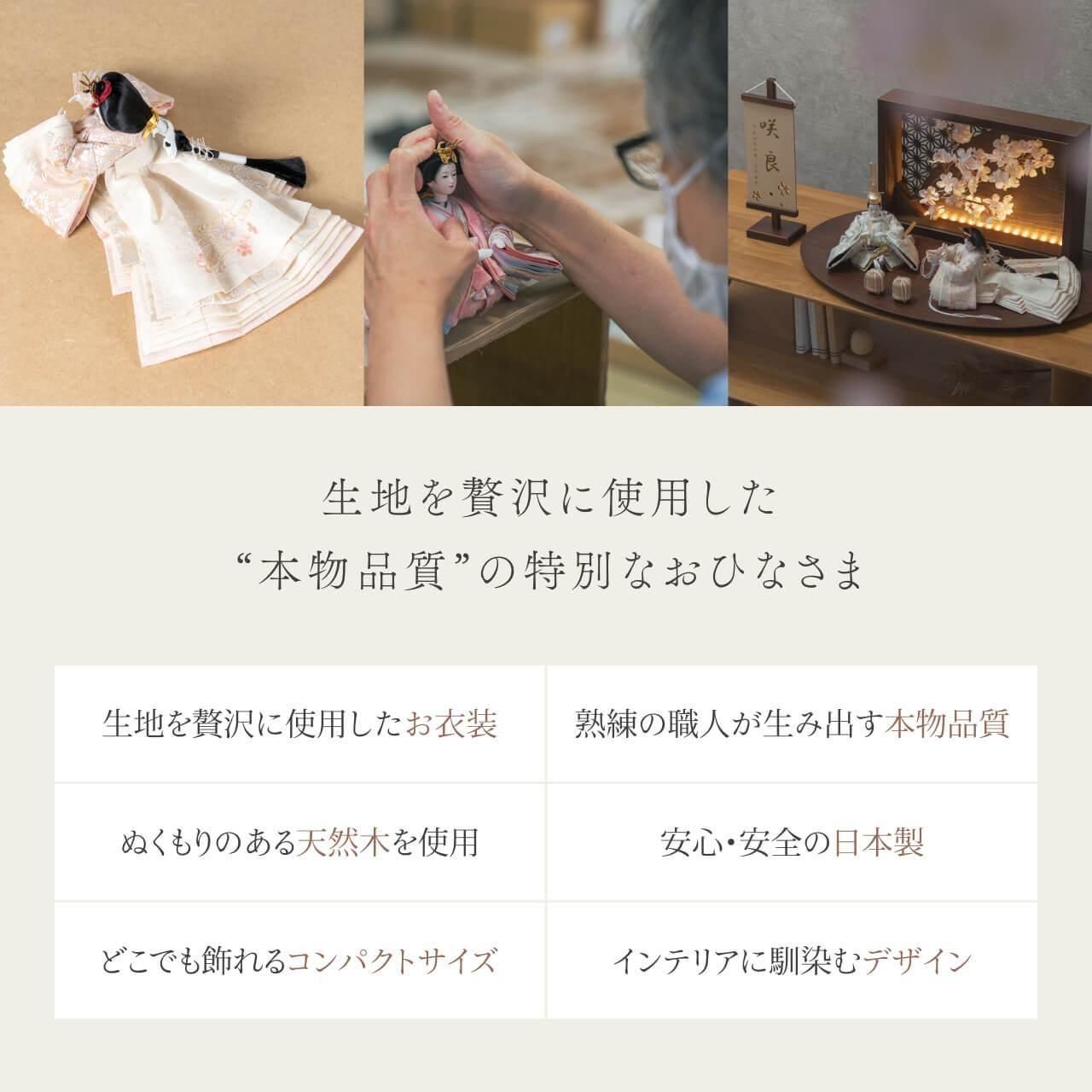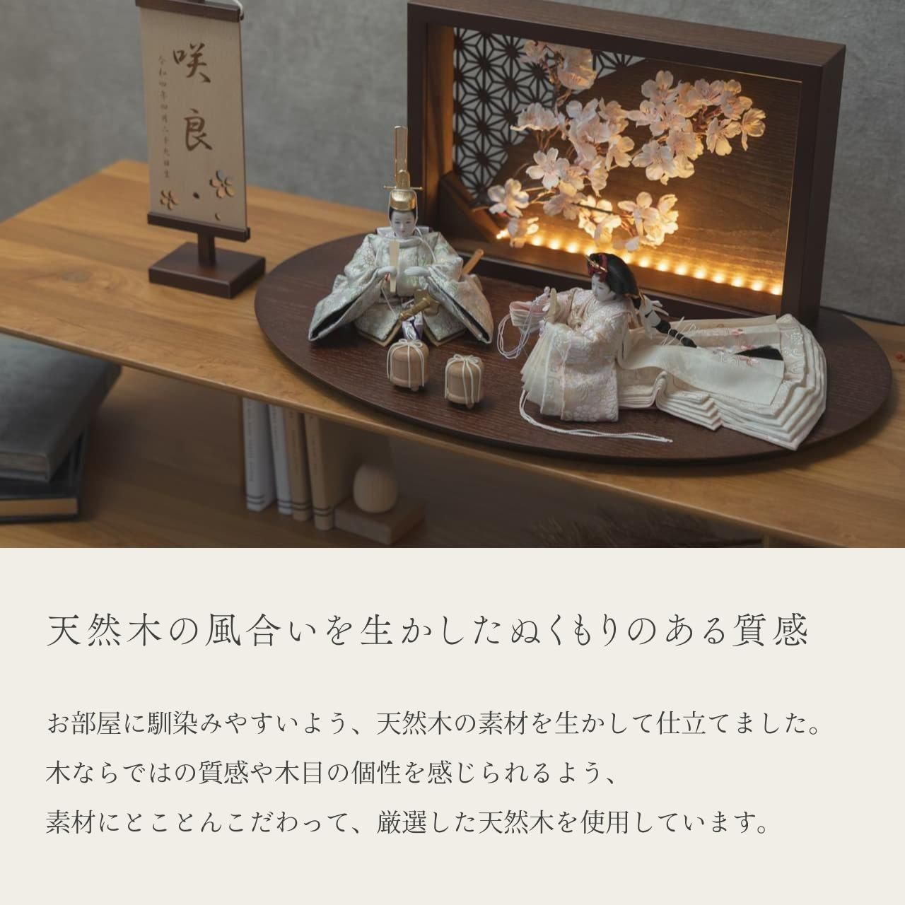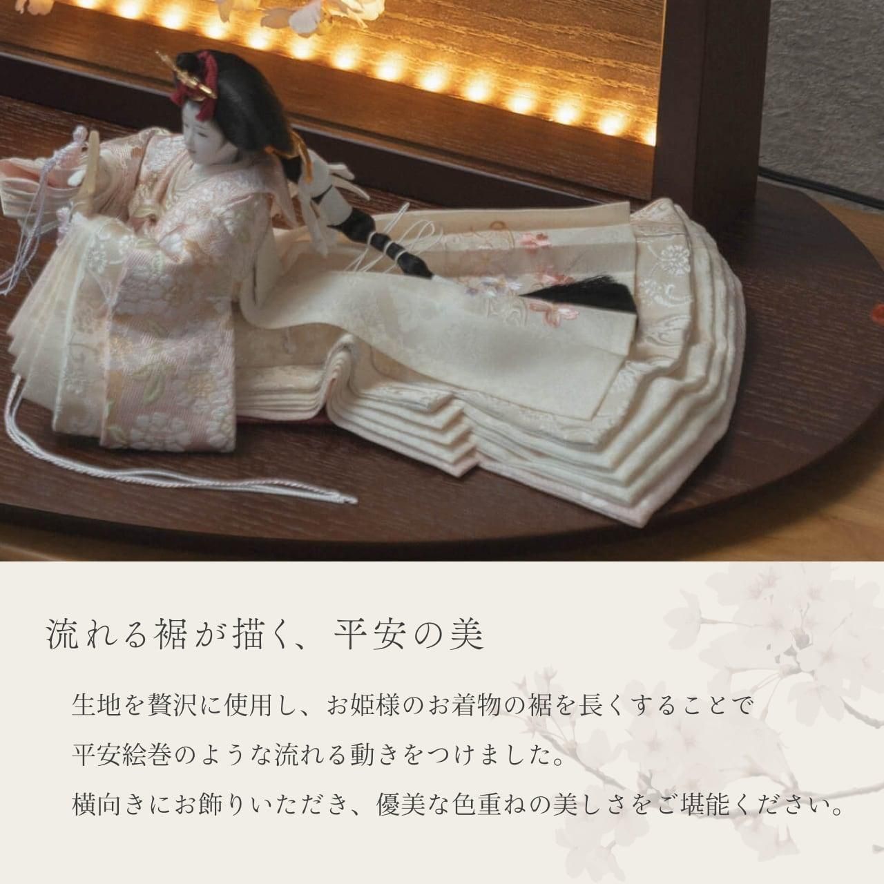 平安という言葉は平安京に由来しており、「穏やか」「安泰」といった願いが込められております。ことの平安ひなとは、お子様の成長や未来が穏やかで無事であるよう祈りを込めたお雛様です。そんな雛人形をてづくり工房「木都」の職人が、伝統工芸の技術と天然木の素材を活かし、真心込めて1つ1つ丁寧につくりました。コンパクトでちょうどいいサイズコンパクトでちょうどいいサイズ今どきのおうちに合わせたコンパクトなサイズに仕上げました。飾るスペースが狭くなりがちなマンションや子ども部屋にもぴったり。お部屋のイメージに調和するデザインお部屋のイメージに調和するデザイン天然木の素材を活かしたシンプルなデザインだから、お部屋の雰囲気にもピッタリ。お衣装へのこだわり 〜八重桜文〜お衣装へのこだわり 〜八重桜文〜衣装には、「しとやか」の意味をもつ八重桜が描かれています。また、幾重にも重なる花びらを積み重ねた知識に見立てて「理知に富んだ教育」などという意味があり、人の見た目の美しさだけでなく、内面の美しさを表しています。手作りへのこだわり 〜裂地(きれじ)の裁断手作りへのこだわり 〜裂地(きれじ)の裁断和紙で衣裳の各種型紙を作り、へり部分にのみ糊をつけ、裂地裏面に貼り付けます。型紙に沿って裁断して衣裳部品を作っていきます。手作りへのこだわり 〜縫製手作りへのこだわり 〜縫製姫の十二単の唐衣(からぎぬ)・五衣(いつつぎぬ)・単衣(ひとえ)・裾、殿の着物・裾・中袖等、数多くの衣裳部品をミシン、または手縫いで細やかな部分まで縫い合わせ、折り込み仕上げていきます。手作りへのこだわり 〜着付け・振付け手作りへのこだわり 〜着付け・振付け仕上がった衣裳は両腕を後方に曲げて羽織らせるようにして着付けます。次にそれぞれの人形の形に振付けます。腕を曲げる角度や手の位置などで全体のバランスを取ります。手作りへのこだわり 〜頭差し手作りへのこだわり 〜頭差し頭さしは最終の人形検品を兼ねて行われます。包まれた顔紙を外し、汚れ等無いことを確認します。頭と衣紋の中心線が一直線になるように差し込みます。ことのお雛様ことのお雛様お雛様の顔は時代とともに人気のお顔があります。ことのお雛様のお顔は時代に左右されない普遍的なシンプルで可愛らしいお顔となっています。健やかな成長への願いを込めた 麻の葉文様健やかな成長への願いを込めた 麻の葉文様古来からの日本伝統の吉祥文様である麻の葉文様。麻の丈夫さ・成長の早さにあやかり、お子さまの健やかな成長への願いが込められています。お子さまの感性を育む天然木へのこだわりお子さまの感性を育む天然木へのこだわり素材には、タモ、ブナといった天然木を使用。お子さまへの一生に一度の贈り物だから、木都は自然素材の天然木にこだわり続けています。※ 生産時期により使用する素材が一部変更になる場合がございます。熟練の職人による確かな手仕事熟練の職人による確かな手仕事伝統工芸の技術を受け継ぐ日本国内の熟練の職人が、一つひとつ丁寧に手づくりしています。おしゃれなギフト包装でお届けしますおしゃれなギフト包装でお届けします和の雰囲気を感じさせる越前和紙のギフト用ラッピングでお届け。料金がわかるものもお入れしていないので、そのまま贈り物として利用できます。商品レビュー記入でもれなくもらえる天然木のミニ名前札プレゼント商品レビュー記入でもれなくもらえる天然木のミニ名前札プレゼントミニサイズのお名前札 (通常販売価格1,980円) をプレゼント♪商品到着後、商品レビューをご記入の上、商品と同梱のチラシ記載のQRコードから応募フォームへ必要事項をご入力ください。店舗よりレビュー特典を発送いたします。※ お名前札の生年月日の表記は和暦となります。(例:令和七年)商品のご注文へ収納方法とセット内容お内裏様・お雛様・衝立・平台・人形小道具・貝桶×2・電源ケーブル素材:タモサイズ:W530mm × D335mm × H250mm梱包時:W560mm × D200mm × H400mm殿:約 W155mm × D160mm × H165mm姫:約 W140mm × D440mm × H110mm注意事項色合いなど実際のものと写真とでは多少の誤差が生じる場合がございます。また、手作りであり天然木を使用している為、多少の仕様の変化や風合いがひとつひとつ異なります。あらかじめご了承ください。部品には小さなものがございます。お子様がお口に入れないようにご注意ください。材質により木の刻印の濃淡に差が生じますが不良品ではございません。木製品である限り自然なこととご承知下さいませ。保管場所は変色やカビ、サビの原因になりますので湿気の少ない場所・直射日光の当たらない場所に保管してください。雄雛の正面にあります飾り帯のビニールは外さないでください。本商品に行燈は付属しておりません。別途お買い求めください。ご不明点がございましたら > お問い合わせページ からご相談ください。