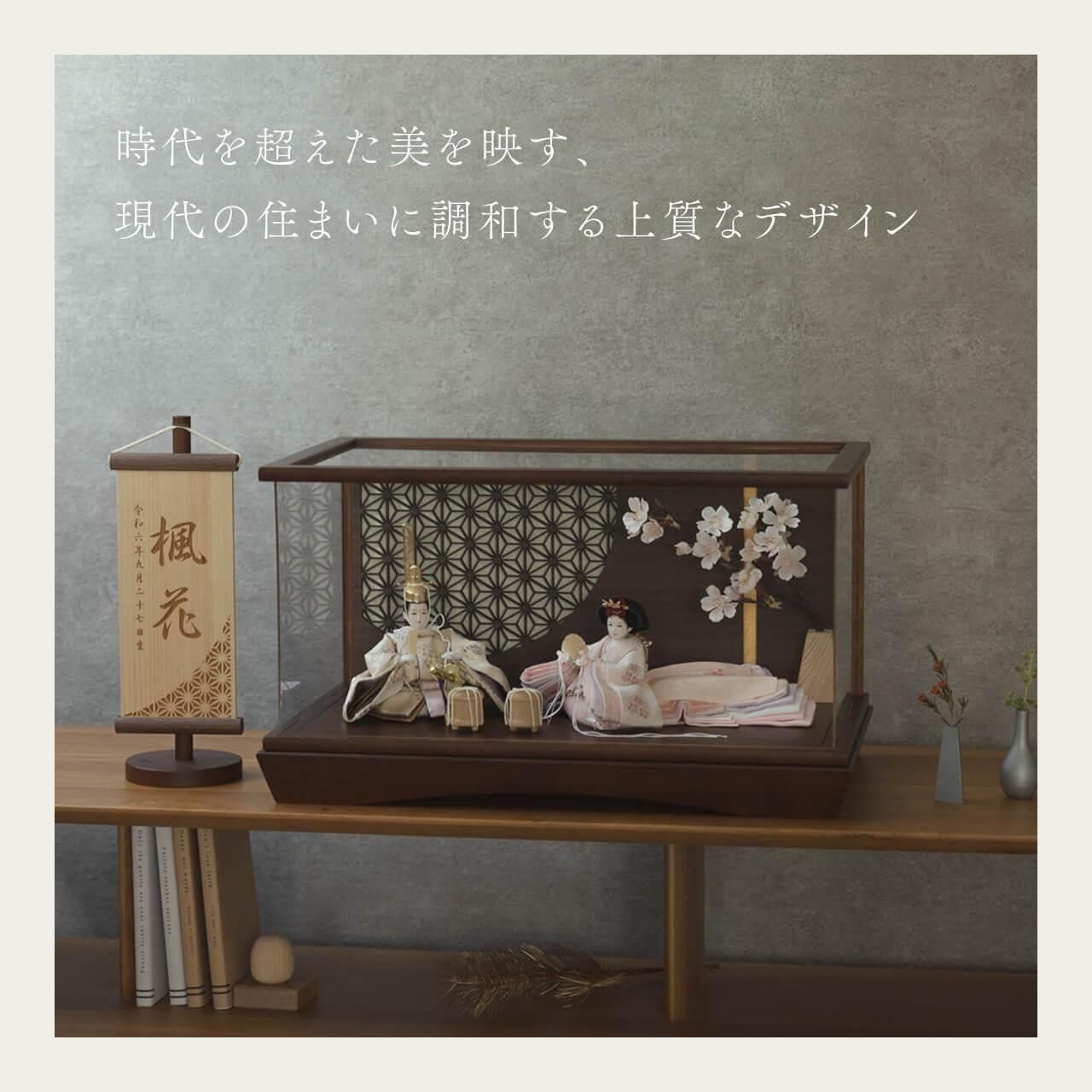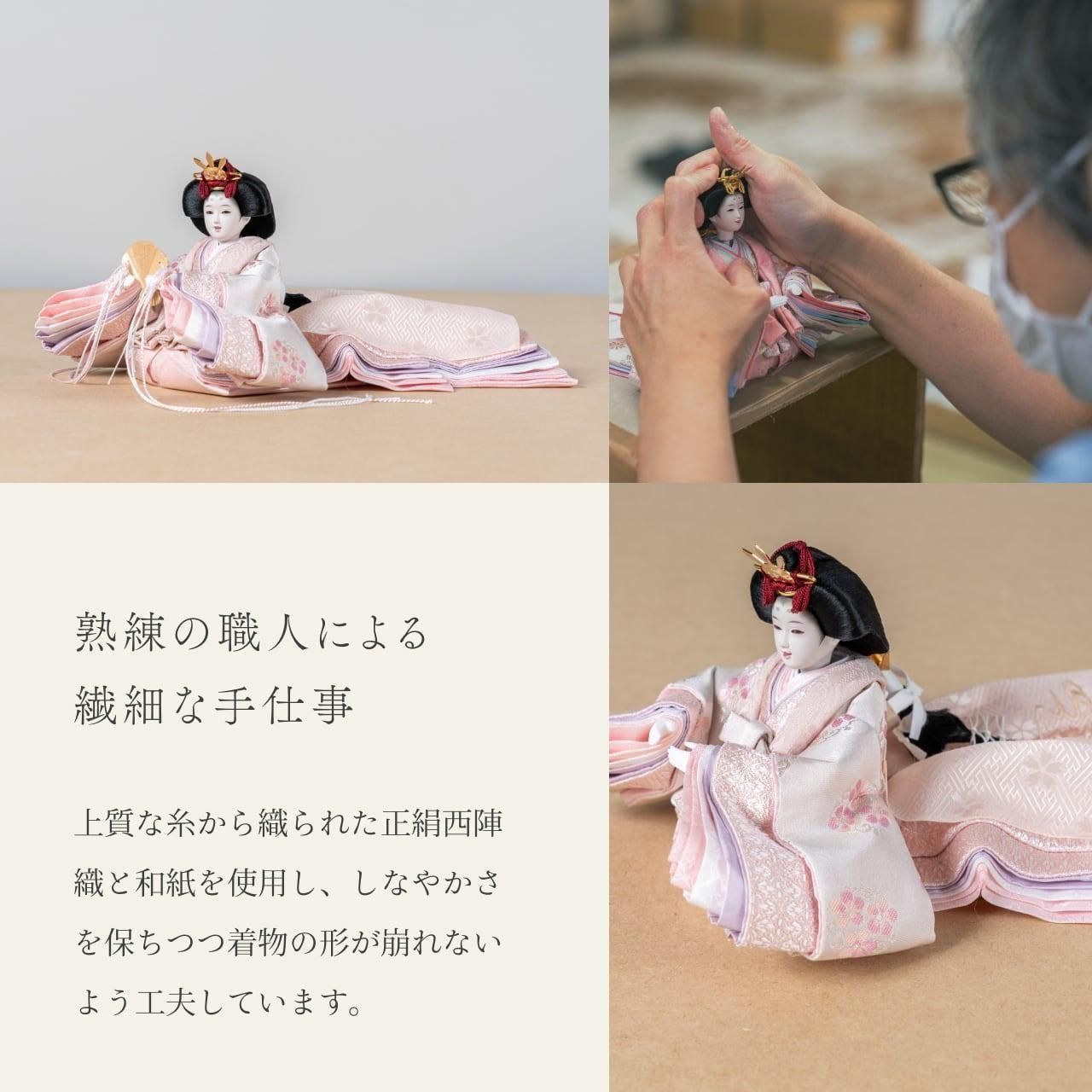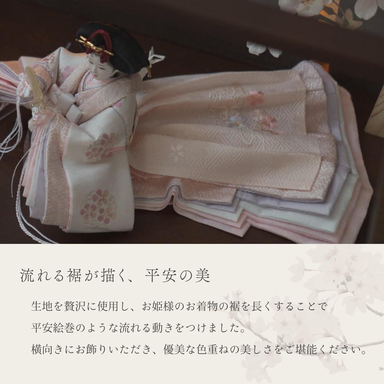 一般的な親王の形とは違い、お姫様の着物の裾を長くし、平安絵巻のような流れる動きをつけました。横向きに飾ることで、衣装と裾重ねの色の美しさを同時に楽しんでいただけます。