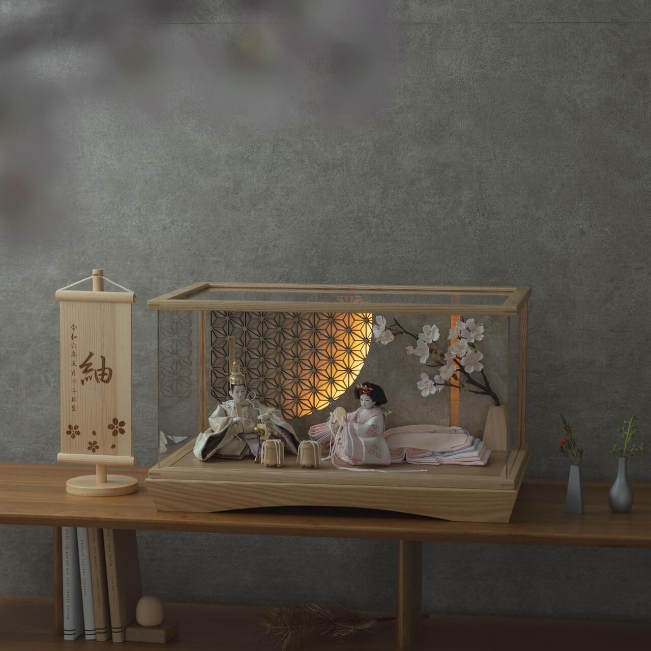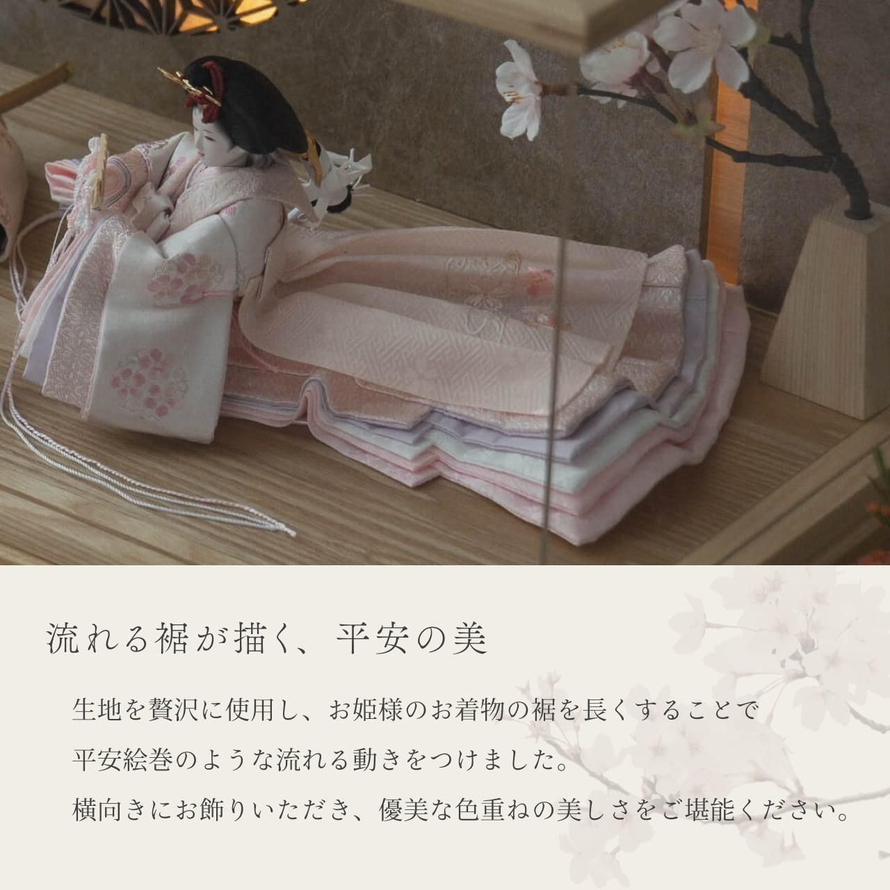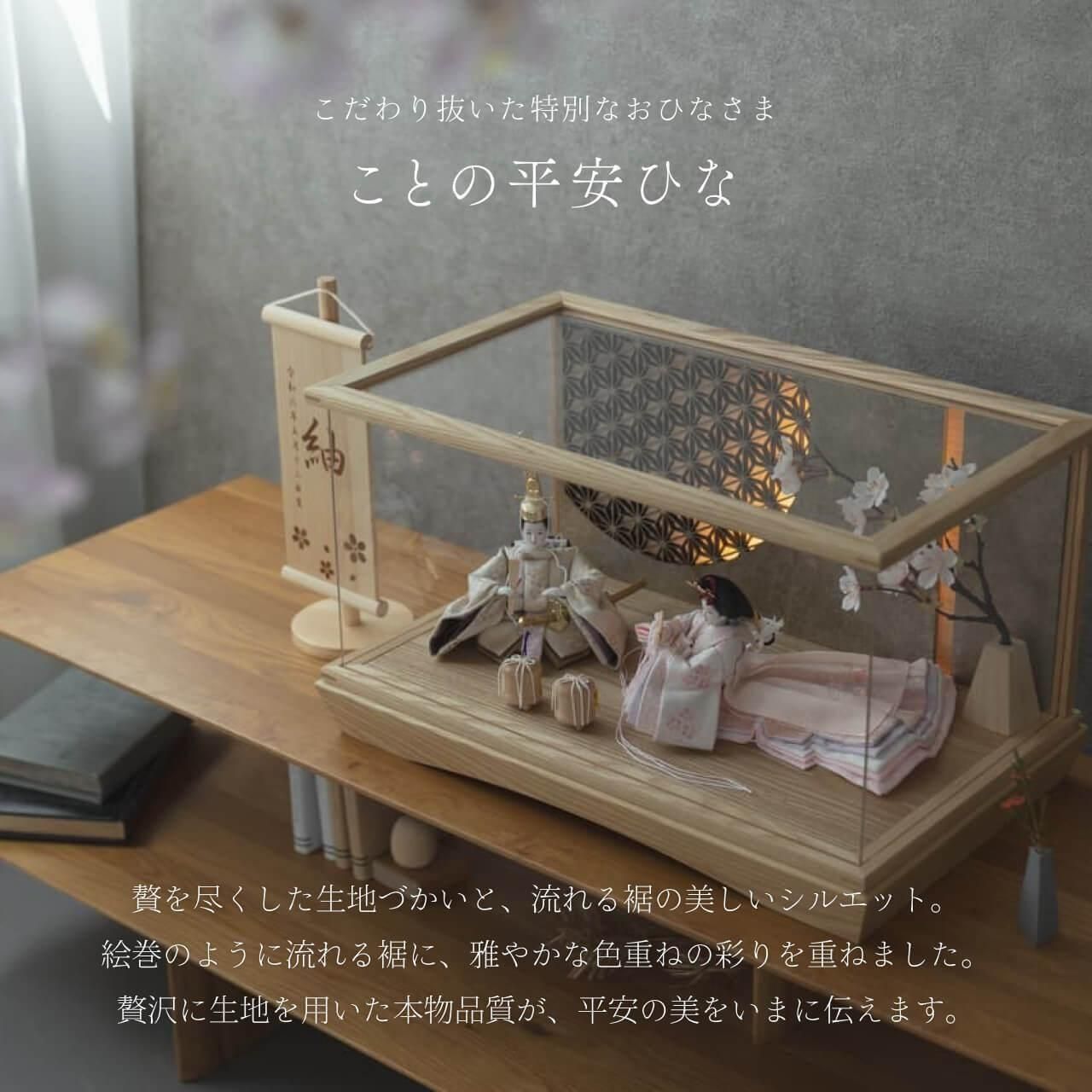 平安という言葉は平安京に由来しており、「穏やか」「安泰」といった願いが込められております。ことの平安ひなとは、お子様の成長や未来が穏やかで無事であるよう祈りを込めたお雛様です。そんな雛人形をてづくり工房「木都」の職人が、伝統工芸の技術と天然木の素材を活かし、真心込めて1つ1つ丁寧につくりました。コンパクトでちょうどいいサイズコンパクトでちょうどいいサイズ今どきのおうちに合わせたコンパクトなサイズに仕上げました。飾るスペースが狭くなりがちなマンションや子ども部屋にもぴったり。お部屋のイメージに調和するデザインお部屋のイメージに調和するデザイン天然木の素材を活かしたシンプルなデザインだから、お部屋の雰囲気にもピッタリ。お衣装へのこだわり 〜花の丸藤文〜お衣装へのこだわり 〜花の丸藤文〜高貴な花とされている藤は、「不死」と同じ響きから「不老長寿や子孫繁栄」の意味を持つ縁起の良い花です。一般的な親王の形とは違い、お姫様の着物の裾を長くし、平安絵巻のような流れる動きをつけました。横向きに飾ることで、衣装と裾重ねの色の美しさを同時に楽しんでいただけます。上質な糸から織られた正絹西陣織と和紙を使用し、しなやかさを保ちつつ着物の形が崩れないよう工夫しました。手作りへのこだわり 〜裂地(きれじ)の裁断手作りへのこだわり 〜裂地(きれじ)の裁断和紙で衣裳の各種型紙を作り、へり部分にのみ糊をつけ、裂地裏面に貼り付けます。型紙に沿って裁断して衣裳部品を作っていきます。手作りへのこだわり 〜縫製手作りへのこだわり 〜縫製姫の十二単の唐衣(からぎぬ)・五衣(いつつぎぬ)・単衣(ひとえ)・裾、殿の着物・裾・中袖等、数多くの衣裳部品をミシン、または手縫いで細やかな部分まで縫い合わせ、折り込み仕上げていきます。手作りへのこだわり 〜着付け・振付け手作りへのこだわり 〜着付け・振付け仕上がった衣裳は両腕を後方に曲げて羽織らせるようにして着付けます。次にそれぞれの人形の形に振付けます。腕を曲げる角度や手の位置などで全体のバランスを取ります。手作りへのこだわり 〜頭差し手作りへのこだわり 〜頭差し頭さしは最終の人形検品を兼ねて行われます。包まれた顔紙を外し、汚れ等無いことを確認します。頭と衣紋の中心線が一直線になるように差し込みます。ことのお雛様ことのお雛様お雛様の顔は時代とともに人気のお顔があります。ことのお雛様のお顔は時代に左右されない普遍的なシンプルで可愛らしいお顔となっています。健やかな成長への願いを込めた 麻の葉文様健やかな成長への願いを込めた 麻の葉文様古来からの日本伝統の吉祥文様である麻の葉文様。麻の丈夫さ・成長の早さにあやかり、お子さまの健やかな成長への願いが込められています。ケース飾りでも手に取って本物の質感を感じてほしいケース飾りでも手に取って本物の質感を感じてほしい木都のケース飾りは、本物の素材や質感を感じながら親子で一緒に手に取って飾る体験をしてほしいから、あえて飾る手間を残しています。手間はかかりますが、伝統的な技法で一つひとつ手づくりしています。お子さまの感性を育む天然木へのこだわりお子さまの感性を育む天然木へのこだわり素材には、タモ、ブナといった天然木を使用。お子さまへの一生に一度の贈り物だから、木都は自然素材の天然木にこだわり続けています。※ 生産時期により使用する素材が一部変更になる場合がございます。熟練の職人による確かな手仕事熟練の職人による確かな手仕事伝統工芸の技術を受け継ぐ日本国内の熟練の職人が、一つひとつ丁寧に手づくりしています。おしゃれなギフト包装でお届けしますおしゃれなギフト包装でお届けします和の雰囲気を感じさせる越前和紙のギフト用ラッピングでお届け。料金がわかるものもお入れしていないので、そのまま贈り物として利用できます。商品レビュー記入でもれなくもらえる天然木のミニ名前札プレゼント商品レビュー記入でもれなくもらえる天然木のミニ名前札プレゼントミニサイズのお名前札 (通常販売価格1,980円) をプレゼント♪商品到着後、商品レビューをご記入の上、商品と同梱のチラシ記載のQRコードから応募フォームへ必要事項をご入力ください。店舗よりレビュー特典を発送いたします。※ お名前札の生年月日の表記は和暦となります。(例:令和七年)商品のご注文へ収納方法とセット内容お内裏様・お雛様・ケース・下台・人形小道具・貝桶×2・桜飾り・電源ケーブル素材:タモサイズ:W485mm × D290mm × H285mm梱包時:W550mm × D355mm × H480mm殿:約 W155mm × D160mm × H165mm姫:約 W140mm × D440mm × H110mm注意事項色合いなど実際のものと写真とでは多少の誤差が生じる場合がございます。また、手作りであり天然木を使用している為、多少の仕様の変化や風合いがひとつひとつ異なります。あらかじめご了承ください。部品には小さなものがございます。お子様がお口に入れないよ