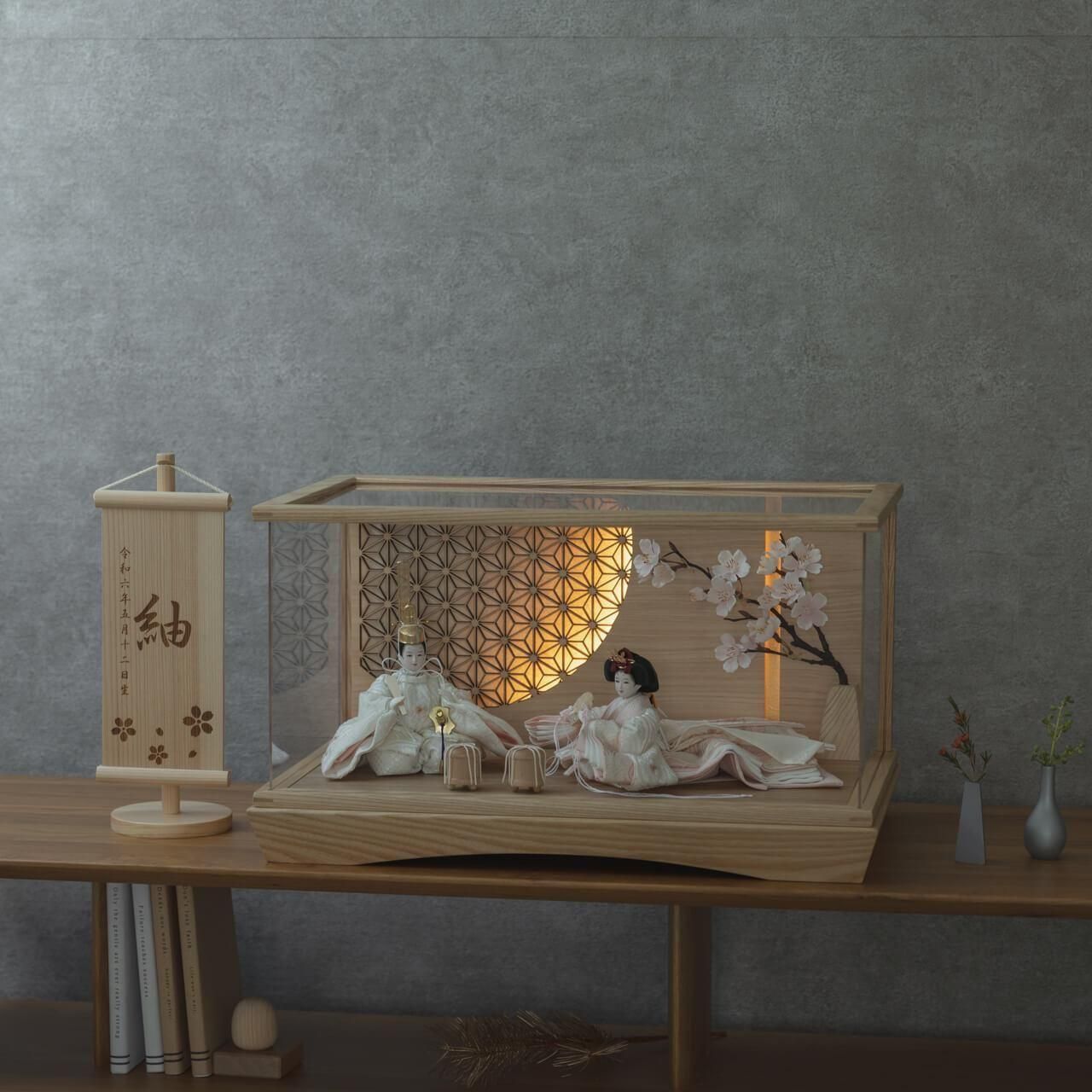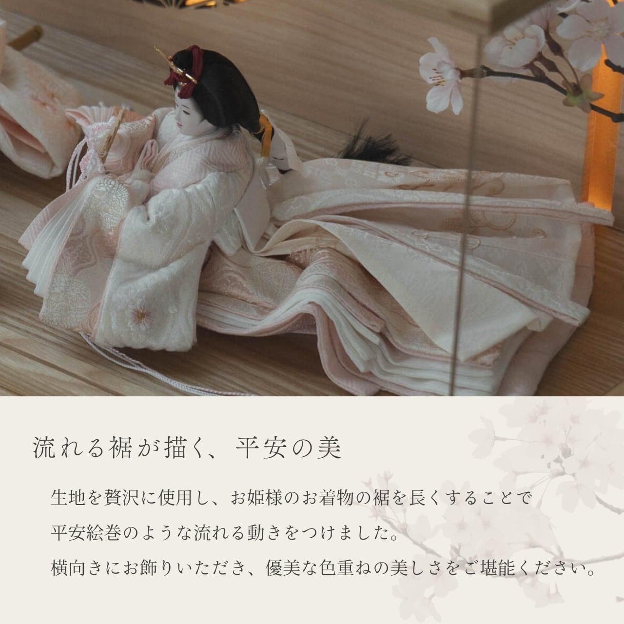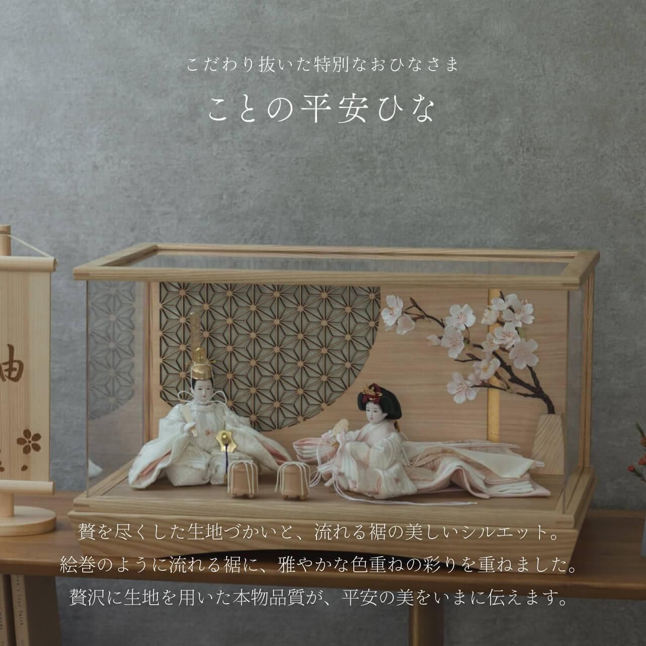平安という言葉は平安京に由来しており、「穏やか」「安泰」といった願いが込められております。ことの平安ひなとは、お子様の成長や未来が穏やかで無事であるよう祈りを込めたお雛様です。そんな雛人形をてづくり工房「木都」の職人が、伝統工芸の技術と天然木の素材を活かし、真心込めて1つ1つ丁寧につくりました。コンパクトでちょうどいいサイズコンパクトでちょうどいいサイズ今どきのおうちに合わせたコンパクトなサイズに仕上げました。飾るスペースが狭くなりがちなマンションや子ども部屋にもぴったり。お部屋のイメージに調和するデザインお部屋のイメージに調和するデザイン天然木の素材を活かしたシンプルなデザインだから、お部屋の雰囲気にもピッタリ。お衣装へのこだわり 〜雲立涌文様に小花刺繍〜お衣装へのこだわり 〜雲立涌文様に小花刺繍〜柄は雲立涌といい、雲や蒸気が立ち昇る様で子供の運気上昇を願う、縁起が良い格式ある有職文様です。唐衣 (姫袖) から重ねに掛けてグラデーションの配色にし、さりげなくデザインされた小花が落ち着いた印象を与える、上品なデザインに仕上げました。手作りへのこだわり 〜裂地(きれじ)の裁断手作りへのこだわり 〜裂地(きれじ)の裁断和紙で衣裳の各種型紙を作り、へり部分にのみ糊をつけ、裂地裏面に貼り付けます。型紙に沿って裁断して衣裳部品を作っていきます。手作りへのこだわり 〜縫製手作りへのこだわり 〜縫製姫の十二単の唐衣(からぎぬ)・五衣(いつつぎぬ)・単衣(ひとえ)・裾、殿の着物・裾・中袖等、数多くの衣裳部品をミシン、または手縫いで細やかな部分まで縫い合わせ、折り込み仕上げていきます。手作りへのこだわり 〜着付け・振付け手作りへのこだわり 〜着付け・振付け仕上がった衣裳は両腕を後方に曲げて羽織らせるようにして着付けます。次にそれぞれの人形の形に振付けます。腕を曲げる角度や手の位置などで全体のバランスを取ります。手作りへのこだわり 〜頭差し手作りへのこだわり 〜頭差し頭さしは最終の人形検品を兼ねて行われます。包まれた顔紙を外し、汚れ等無いことを確認します。頭と衣紋の中心線が一直線になるように差し込みます。ことのお雛様ことのお雛様お雛様の顔は時代とともに人気のお顔があります。ことのお雛様のお顔は時代に左右されない普遍的なシンプルで可愛らしいお顔となっています。健やかな成長への願いを込めた 麻の葉文様健やかな成長への願いを込めた 麻の葉文様古来からの日本伝統の吉祥文様である麻の葉文様。麻の丈夫さ・成長の早さにあやかり、お子さまの健やかな成長への願いが込められています。ケース飾りでも手に取って本物の質感を感じてほしいケース飾りでも手に取って本物の質感を感じてほしい木都のケース飾りは、本物の素材や質感を感じながら親子で一緒に手に取って飾る体験をしてほしいから、あえて飾る手間を残しています。手間はかかりますが、伝統的な技法で一つひとつ手づくりしています。お子さまの感性を育む天然木へのこだわりお子さまの感性を育む天然木へのこだわり素材には、タモ、ブナといった天然木を使用。お子さまへの一生に一度の贈り物だから、木都は自然素材の天然木にこだわり続けています。※ 生産時期により使用する素材が一部変更になる場合がございます。熟練の職人による確かな手仕事熟練の職人による確かな手仕事伝統工芸の技術を受け継ぐ日本国内の熟練の職人が、一つひとつ丁寧に手づくりしています。おしゃれなギフト包装でお届けしますおしゃれなギフト包装でお届けします和の雰囲気を感じさせる越前和紙のギフト用ラッピングでお届け。料金がわかるものもお入れしていないので、そのまま贈り物として利用できます。商品レビュー記入でもれなくもらえる天然木のミニ名前札プレゼント商品レビュー記入でもれなくもらえる天然木のミニ名前札プレゼントミニサイズのお名前札 (通常販売価格1,980円) をプレゼント♪商品到着後、商品レビューをご記入の上、商品と同梱のチラシ記載のQRコードから応募フォームへ必要事項をご入力ください。店舗よりレビュー特典を発送いたします。※ お名前札の生年月日の表記は和暦となります。(例:令和七年)商品のご注文へ収納方法とセット内容お内裏様・お雛様・ケース・下台・人形小道具・貝桶×2・桜飾り・電源ケーブル素材:タモサイズ:W485mm × D290mm × H285mm梱包時:W550mm × D355mm × H480mm殿:約 W155mm × D160mm × H165mm姫:約 W140mm × D440mm × H110mm注意事項色合いなど実際のものと写真とでは多少の誤差が生じる場合がございます。また、手作りであり天然木を使用している為、多少の仕様の変化や風合いがひとつひとつ異なります。あらかじめご了承ください。部品には小さなものがございます。お子様がお口に入れないようにご注意ください。材質により木の刻印の濃淡に差が生じますが不良品ではございません。木製品である限り自然なこととご承知