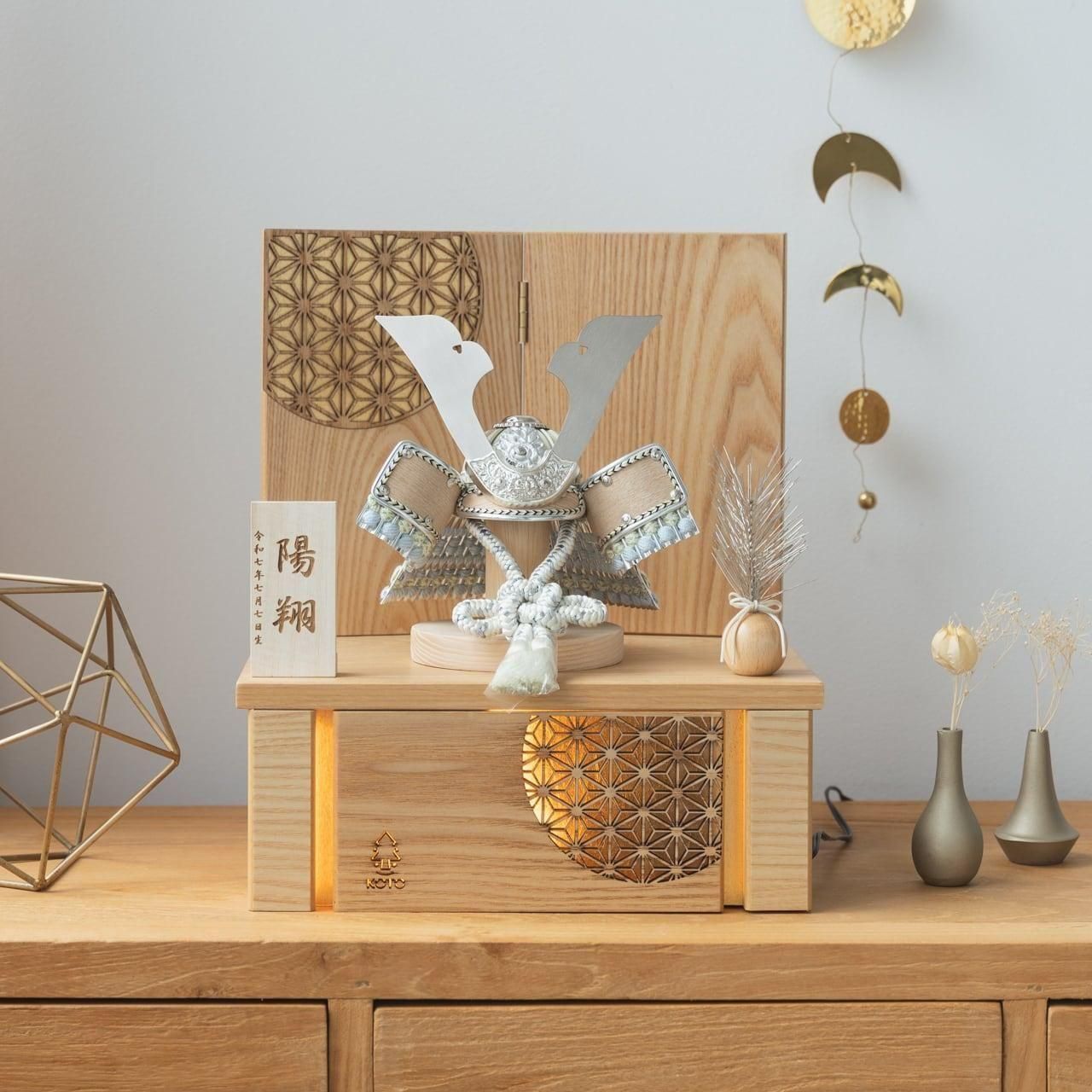 実際に手に取ると天然木の素材ならではの優しいぬくもりが伝わります。てづくり工房「木都」の職人が、伝統工芸の技術と天然木の素材を活かし、真心込めて1つ1つ丁寧につくりました。親しみやすく、お子様と一緒に飾れることのオリジナル兜です。※ 細かい部品が含まれています。3歳未満のお子様は、保護者の方と一緒にお遊びください。コンパクトでちょうどいいサイズコンパクトでちょうどいいサイズ今どきのおうちに合わせたコンパクトなサイズに仕上げました。飾るスペースが狭くなりがちなマンションや子ども部屋にもぴったり。伝統的な兜をモダンに仕上げたシンプルなデザイン伝統的な兜をモダンに仕上げたシンプルなデザイン伝統的な製法で作られた兜に天然木の素材を活かしたシンプルなデザインの兜です。モダンでシンプルなデザインは、どんなお部屋の雰囲気にもピッタリ。選び抜いた素材と手間をかけた技法でつくる兜鉢選び抜いた素材と手間をかけた技法でつくる兜鉢ことのオリジナル兜の兜鉢は、伝統的な本式の合せ鉢という技法でつくられています。本式の合せ鉢とは、戦国時代に頭部を守るために考案され、三角状の鉢部品を重ね合わせ、多数の星鋲をカシメる事で強度を高める技法です。健やかな成長への願いを込めた麻の葉文様健やかな成長への願いを込めた麻の葉文様古来からの日本伝統の吉祥文様である麻の葉文様。麻の丈夫さ・成長の早さにあやかり、お子さまの健やかな成長への願いが込められています。お子さまの感性を育む天然木へのこだわりお子さまの感性を育む天然木へのこだわり素材には、タモ、ブナといった天然木を使用。お子さまへの一生に一度の贈り物だから、木都は自然素材の天然木にこだわり続けています。※ 生産時期により使用する素材が一部変更になる場合がございます。熟練の職人による確かな手仕事熟練の職人による確かな手仕事伝統工芸の技術を受け継ぐ日本国内の熟練の職人が、一つひとつ丁寧に手づくりしています。おしゃれなギフト包装でお届けしますおしゃれなギフト包装でお届けします和の雰囲気を感じさせる越前和紙のギフト用ラッピングでお届け。料金がわかるものもお入れしていないので、そのまま贈り物として利用できます。商品レビュー記入でもれなくもらえる天然木のミニ名前札プレゼント商品レビュー記入でもれなくもらえる天然木のミニ名前札プレゼントミニサイズのお名前札 (通常販売価格1,980円) をプレゼント♪商品到着後、商品レビューをご記入の上、商品と同梱のチラシ記載のQRコードから応募フォームへ必要事項をご入力ください。店舗よりレビュー特典を発送いたします。※ お名前札の生年月日の表記は和暦となります。(例:令和七年)商品のご注文へ収納方法とセット内容兜・鍬形・芯木・松・屏風・収納箱・電源ケーブル屏風は収納箱の上に乗せてダンボール箱におしまい下さい。素材:タモサイズ:W250mm × D200mm × H305mm梱包時:W310mm × D240mm × H160mm兜のみ:約 W150mm × D110mm × H150mm注意事項本品は、金属をふんだんに使用しております。取り扱われる方の人体にすり傷、切り傷、刺傷を及ぼす場合がございますので、左記注意事項をよく読んでお取り扱い下さい。甲冑について飾り付ける際に必ず手袋をご使用ください。錆や変色などの予防にもなります。本品の上には絶対に乗らないでください。本品または本品の部品は装飾品です。他の目的に使用しないで下さい。部品には小さなものがございます。お子様がお口に入れないようにご注意いください。木製品について色合いなど実際のものと写真とでは多少の誤差が生じる場合がございます。また、手作りであり天然木を使用している為、多少の仕様の変化や風合いがひとつひとつ異なります。あらかじめご了承ください。部品には小さなものがございます。お子様がお口に入れないようにご注意いください。菖蒲には針金が入っております。お好みで角度を調整して下さい。材質により刻印の濃淡に差が生じますが不良品ではございません。木製品である限り自然なこととご承知下さいませ。保管場所は変色やカビ、サビの原因になりますので湿気の少ない場所・直射日光の当たらない場所に保管してください。ご不明点がございましたら > お問い合わせページ からご相談ください。