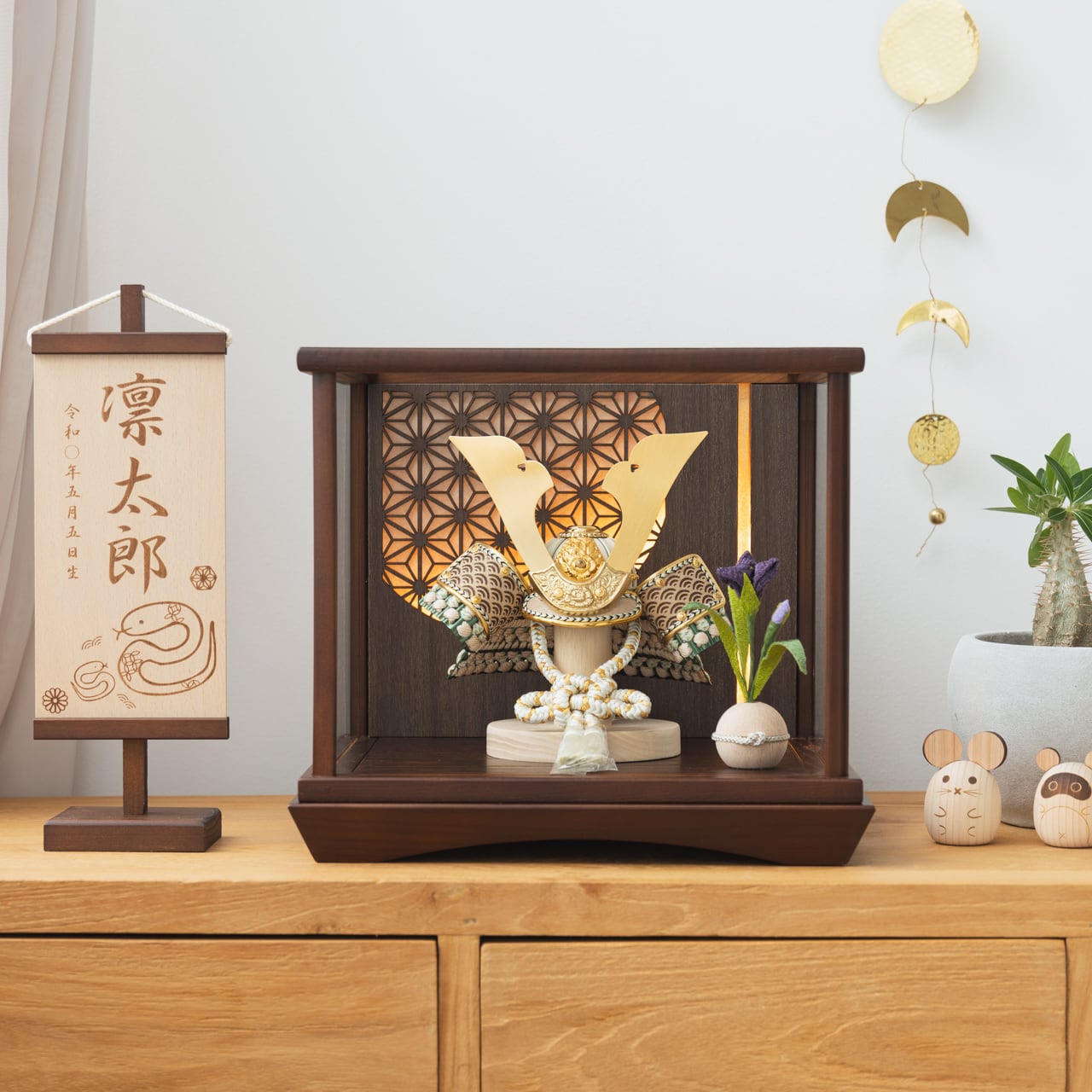 実際に手に取ると天然木の素材ならではの優しいぬくもりが伝わります。てづくり工房「木都」の職人が、伝統工芸の技術と天然木の素材を活かし、真心込めて1つ1つ丁寧につくりました。親しみやすく、お子様と一緒に飾れることのオリジナル兜です。※ 細かい部品が含まれています。3歳未満のお子様は、保護者の方と一緒にお遊びください。コンパクトでちょうどいいサイズコンパクトでちょうどいいサイズ今どきのおうちに合わせたコンパクトなサイズに仕上げました。飾るスペースが狭くなりがちなマンションや子ども部屋にもぴったり。伝統的な兜をモダンに仕上げたシンプルなデザイン伝統的な兜をモダンに仕上げたシンプルなデザイン伝統的な製法で作られた兜に天然木の素材を活かしたシンプルなデザインの兜です。モダンでシンプルなデザインは、どんなお部屋の雰囲気にもピッタリ。選び抜いた素材と手間をかけた技法でつくる兜鉢選び抜いた素材と手間をかけた技法でつくる兜鉢ことのオリジナル兜の兜鉢は、伝統的な本式の合せ鉢という技法でつくられています。本式の合せ鉢とは、戦国時代に頭部を守るために考案され、三角状の鉢部品を重ね合わせ、多数の星鋲をカシメる事で強度を高める技法です。こだわりの素材と手間をかけた技法でつくる「兜」こだわりの素材と手間をかけた技法でつくる「兜」従来の取り付け型のケース兜は、鉢の素材がプラスチックなど作りが安価な兜が多いのですが、当社の本兜は、デザイン性を有しながらも本来の伝統的な手間をかけた「兜」となっています。健やかな成長への願いを込めた麻の葉文様健やかな成長への願いを込めた麻の葉文様古来からの日本伝統の吉祥文様である麻の葉文様。麻の丈夫さ・成長の早さにあやかり、お子さまの健やかな成長への願いが込められています。ケースでも手にとって欲しいこだわりの兜ケースでも手にとって欲しいこだわりの兜角をなくし丸みをつけた円柱型のケースは従来のケースにある柱がない為、中に飾る兜がより見やすくなっております。お子さまの感性を育む天然木へのこだわりお子さまの感性を育む天然木へのこだわり素材には、タモ、ブナといった天然木を使用。お子さまへの一生に一度の贈り物だから、木都は自然素材の天然木にこだわり続けています。※ 生産時期により使用する素材が一部変更になる場合がございます。熟練の職人による確かな手仕事熟練の職人による確かな手仕事伝統工芸の技術を受け継ぐ日本国内の熟練の職人が、一つひとつ丁寧に手づくりしています。おしゃれなギフト包装でお届けしますおしゃれなギフト包装でお届けします和の雰囲気を感じさせる越前和紙のギフト用ラッピングでお届け。料金がわかるものもお入れしていないので、そのまま贈り物として利用できます。商品レビュー記入でもれなくもらえる天然木のミニ名前札プレゼント商品レビュー記入でもれなくもらえる天然木のミニ名前札プレゼントミニサイズのお名前札 (通常販売価格1,980円) をプレゼント♪商品到着後、商品レビューをご記入の上、商品と同梱のチラシ記載のQRコードから応募フォームへ必要事項をご入力ください。店舗よりレビュー特典を発送いたします。※ お名前札の生年月日の表記は和暦となります。(例:令和七年)商品のご注文へ収納方法とセット内容兜・鍬形・芯木・菖蒲・ケース・電源ケーブル素材:タモサイズ:W280mm × D240mm × H250mm梱包時:W340mm × D280mm × H275mm兜のみ:約 W150mm × D110mm × H150mm注意事項本品は、金属をふんだんに使用しております。取り扱われる方の人体にすり傷、切り傷、刺傷を及ぼす場合がございますので、左記注意事項をよく読んでお取り扱い下さい。甲冑について飾り付ける際に必ず手袋をご使用ください。錆や変色などの予防にもなります。本品の上には絶対に乗らないでください。本品または本品の部品は装飾品です。他の目的に使用しないで下さい。部品には小さなものがございます。お子様がお口に入れないようにご注意いください。木製品について色合いなど実際のものと写真とでは多少の誤差が生じる場合がございます。また、手作りであり天然木を使用している為、多少の仕様の変化や風合いがひとつひとつ異なります。あらかじめご了承ください。部品には小さなものがございます。お子様がお口に入れないようにご注意いください。菖蒲には針金が入っております。お好みで角度を調整して下さい。材質により刻印の濃淡に差が生じますが不良品ではございません。木製品である限り自然なこととご承知下さいませ。保管場所は変色やカビ、サビの原因になりますので湿気の少ない場所・直射日光の当たらない場所に保管してください。ご不明点がございましたら > お問い合わせページ からご相談ください。