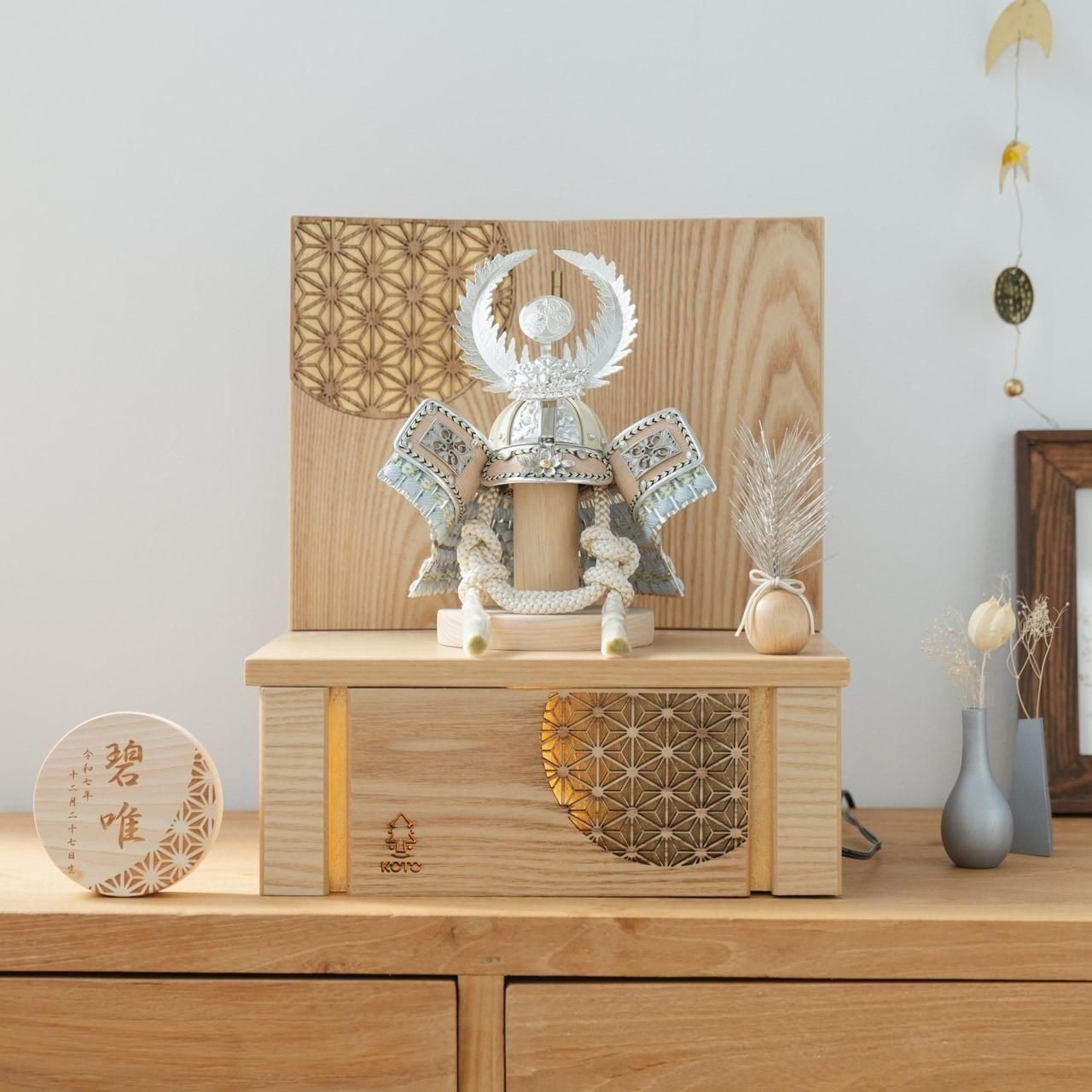 実際に手に取ると天然木の素材ならではの優しいぬくもりが伝わります。てづくり工房「木都」の職人が、伝統工芸の技術と天然木の素材を活かし、真心込めて1つ1つ丁寧につくりました。親しみやすく、お子様と一緒に飾れることのオリジナル兜です。※ 細かい部品が含まれています。3歳未満のお子様は、保護者の方と一緒にお遊びください。コンパクトでちょうどいいサイズコンパクトでちょうどいいサイズ今どきのおうちに合わせたコンパクトなサイズに仕上げました。飾るスペースが狭くなりがちなマンションや子ども部屋にもぴったり。伝統的な兜をモダンに仕上げたシンプルなデザイン伝統的な兜をモダンに仕上げたシンプルなデザイン伝統的な製法で作られた兜に天然木の素材を活かしたシンプルなデザインの兜です。モダンでシンプルなデザインは、どんなお部屋の雰囲気にもピッタリ。選び抜いた素材と手間をかけた技法でつくる兜鉢選び抜いた素材と手間をかけた技法でつくる兜鉢ことのオリジナル兜の兜鉢は、伝統的な本式の合せ鉢という技法でつくられています。本式の合せ鉢とは、戦国時代に頭部を守るために考案され、三角状の鉢部品を重ね合わせ、多数の星鋲をカシメる事で強度を高める技法です。健やかな成長への願いを込めた麻の葉文様健やかな成長への願いを込めた麻の葉文様古来からの日本伝統の吉祥文様である麻の葉文様。麻の丈夫さ・成長の早さにあやかり、お子さまの健やかな成長への願いが込められています。お子さまの感性を育む天然木へのこだわりお子さまの感性を育む天然木へのこだわり素材には、タモ、ブナといった天然木を使用。お子さまへの一生に一度の贈り物だから、木都は自然素材の天然木にこだわり続けています。※ 生産時期により使用する素材が一部変更になる場合がございます。熟練の職人による確かな手仕事熟練の職人による確かな手仕事伝統工芸の技術を受け継ぐ日本国内の熟練の職人が、一つひとつ丁寧に手づくりしています。おしゃれなギフト包装でお届けしますおしゃれなギフト包装でお届けします和の雰囲気を感じさせる越前和紙のギフト用ラッピングでお届け。料金がわかるものもお入れしていないので、そのまま贈り物として利用できます。商品レビュー記入でもれなくもらえる天然木のミニ名前札プレゼント商品レビュー記入でもれなくもらえる天然木のミニ名前札プレゼントミニサイズのお名前札 (通常販売価格1,980円) をプレゼント♪商品到着後、商品レビューをご記入の上、商品と同梱のチラシ記載のQRコードから応募フォームへ必要事項をご入力ください。店舗よりレビュー特典を発送いたします。※ お名前札の生年月日の表記は和暦となります。(例:令和七年)商品のご注文へ収納方法とセット内容兜・鍬形・芯木・松・屏風・収納箱・電源ケーブル屏風は収納箱の上に乗せてダンボール箱におしまい下さい。素材:タモサイズ:W250mm × D200mm × H305mm梱包時:W310mm × D310mm × H200mm兜のみ:約 W150mm × D110mm × H150mm注意事項本品は、金属をふんだんに使用しております。取り扱われる方の人体にすり傷、切り傷、刺傷を及ぼす場合がございますので、左記注意事項をよく読んでお取り扱い下さい。甲冑について飾り付ける際に必ず手袋をご使用ください。錆や変色などの予防にもなります。本品の上には絶対に乗らないでください。本品または本品の部品は装飾品です。他の目的に使用しないで下さい。部品には小さなものがございます。お子様がお口に入れないようにご注意いください。木製品について色合いなど実際のものと写真とでは多少の誤差が生じる場合がございます。また、手作りであり天然木を使用している為、多少の仕様の変化や風合いがひとつひとつ異なります。あらかじめご了承ください。部品には小さなものがございます。お子様がお口に入れないようにご注意いください。菖蒲には針金が入っております。お好みで角度を調整して下さい。材質により刻印の濃淡に差が生じますが不良品ではございません。木製品である限り自然なこととご承知下さいませ。保管場所は変色やカビ、サビの原因になりますので湿気の少ない場所・直射日光の当たらない場所に保管してください。ご不明点がございましたら > お問い合わせページ からご相談ください。