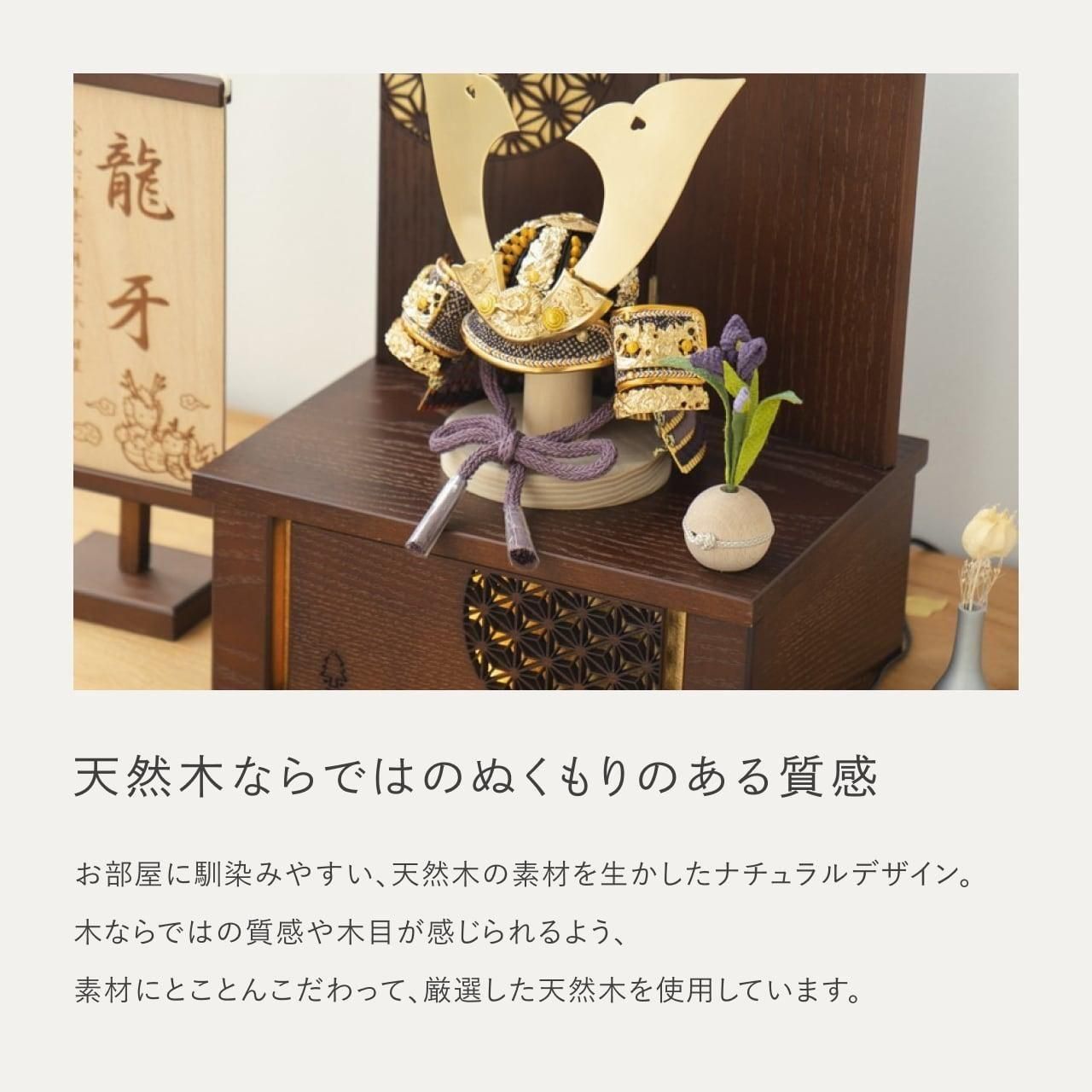精巧な戦国兜の凛として強く美しい佇まいを天然木の優しいぬくもりが包み込む・・・