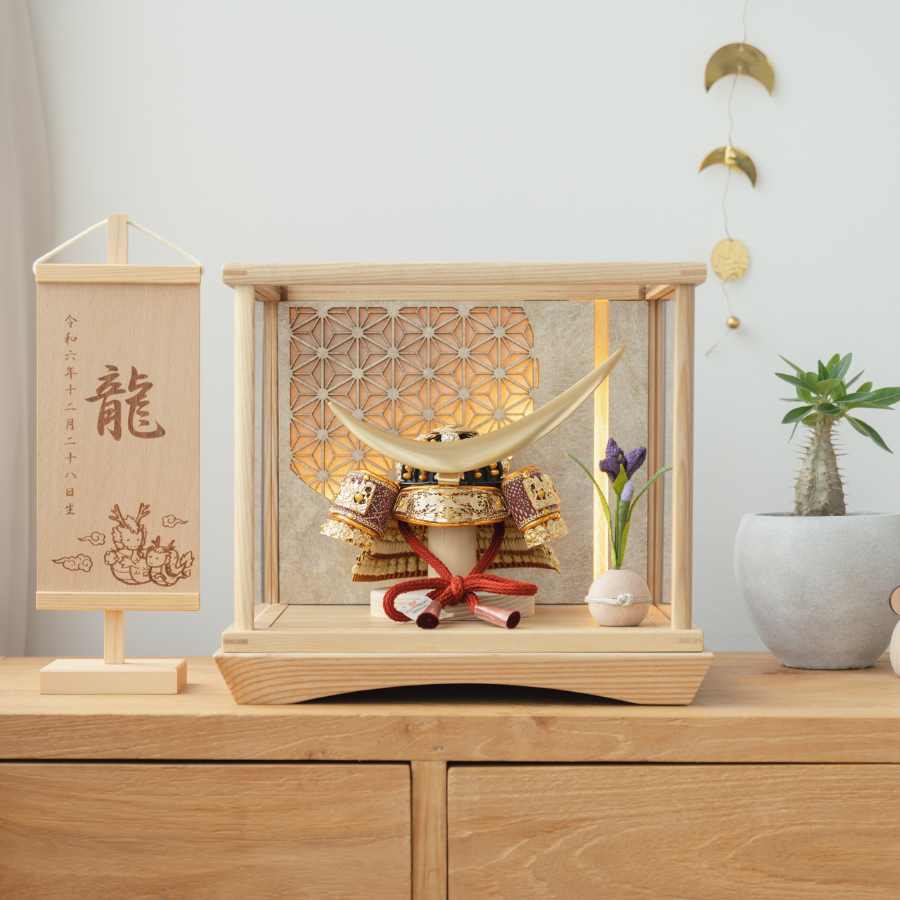 精巧な戦国兜の凛として強く美しい佇まいを天然木の優しいぬくもりが包み込む・・・まるで男の子の成長を温かく見守る家族の様に・・・そんなコンセプトから生まれた兜は、てづくり工房「木都」と甲冑工房「悠雅」のコラボレーションから生まれました。親しみやすく、お子様と一緒に飾れるKOTO×悠雅コラボ兜です。※ 細かい部品が含まれています。3歳未満のお子様は、保護者の方と一緒にお遊びください。選び抜いた素材と手間をかけた技法でつくる兜鉢選び抜いた素材と手間をかけた技法でつくる兜鉢KOTO×悠雅コラボ兜の兜鉢は、伝統的な本式の合せ鉢という技法でつくられています。本式の合せ鉢とは、戦国時代に頭部を守るために考案され、三角状の鉢部品を重ね合わせ、多数の星鋲をカシメる事で強度を高める技法です。選び抜いた素材と手間をかけた技法でつくる「庇」選び抜いた素材と手間をかけた技法でつくる「庇」兜の裏側にあたる庇は、甲州印伝革を使用し伝統的な技術で1つ1つ手作りで丁寧に作られています。選び抜いた素材と手間をかけた技法でつくる「小札」選び抜いた素材と手間をかけた技法でつくる「小札」小札は、細かい天然繊維である本物の絹糸を使用した正絹で結び合わせ繋げております。伝統的な兜をモダンに仕上げたシンプルなデザイン伝統的な兜をモダンに仕上げたシンプルなデザイン伝統的な製法で作られた兜に天然木の素材を活かしたシンプルなデザインの兜です。モダンでシンプルなデザインは、どんなお部屋の雰囲気にもピッタリ。コンパクトでちょうどいいサイズコンパクトでちょうどいいサイズ今どきのおうちに合わせたコンパクトなサイズに仕上げました。飾るスペースが狭くなりがちなマンションや子ども部屋にもぴったり。健やかな成長への願いを込めた麻の葉文様健やかな成長への願いを込めた麻の葉文様古来からの日本伝統の吉祥文様である麻の葉文様。麻の丈夫さ・成長の早さにあやかり、お子さまの健やかな成長への願いが込められています。兜の由来〜伊達正宗兜の由来〜伊達正宗妙見信仰という宗教は星や月、太陽などを神とあがめていました。伊達はその中でも月派で三日月にした理由は戦の邪魔にならないようにといわれています。ケースでも手にとって欲しいこだわりの兜ケースでも手にとって欲しいこだわりの兜木都のケース飾りは、本物の素材や質感を感じながら親子で一緒に手に取って飾る体験をしてほしいから、あえて飾る手間を残しています。手間はかかりますが、伝統的な技法で一つひとつ手づくりしています。お子さまの感性を育む天然木へのこだわりお子さまの感性を育む天然木へのこだわり素材には、タモ、ブナといった天然木を使用。お子さまへの一生に一度の贈り物だから、木都は自然素材の天然木にこだわり続けています。※ 生産時期により使用する素材が一部変更になる場合がございます。熟練の職人による確かな手仕事熟練の職人による確かな手仕事伝統工芸の技術を受け継ぐ日本国内の熟練の職人が、一つひとつ丁寧に手づくりしています。おしゃれなギフト包装でお届けしますおしゃれなギフト包装でお届けします和の雰囲気を感じさせる越前和紙のギフト用ラッピングでお届け。料金がわかるものもお入れしていないので、そのまま贈り物として利用できます。商品レビュー記入でもれなくもらえる天然木のミニ名前札プレゼント商品レビュー記入でもれなくもらえる天然木のミニ名前札プレゼントミニサイズのお名前札 (通常販売価格1,980円) をプレゼント♪商品到着後、商品レビューをご記入の上、商品と同梱のチラシ記載のQRコードから応募フォームへ必要事項をご入力ください。店舗よりレビュー特典を発送いたします。※ お名前札の生年月日の表記は和暦となります。(例:令和七年)商品のご注文へ収納方法とセット内容兜・鍬形・芯木・菖蒲・ケース・電源ケーブル素材:タモサイズ:W280mm × D240mm × H250mm梱包時:W340mm × D280mm × H275mm兜のみ:約 W150mm × D110mm × H150mm収納方法鍬形は専用袋に入れ、兜は風呂敷に包みます。その他の部品は不織布に入れ収納してください。兜置きの下台とポールは組み立ててご利用ください。兜などを保管する箱は木のケースに入れて収納することが出来ます。注意事項甲冑について飾り付ける際に必ず手袋をご使用ください。錆や変色などの予防にもなります。本品の上には絶対に乗らないでください。本品または本品の部品は装飾品です。他の目的に使用しないで下さい。部品には小さなものがございます。お子様がお口に入れないようにご注意いください。木製品について色合いなど実際のものと写真とでは多少の誤差が生じる場合がございます。また、手作りであり天然木を使用している為、多少の仕様の変化や風合いがひとつひとつ異なります。あらかじめご了承ください。部品には小さなものがございます。お子様がお口に入れないようにご注意いください。菖蒲に