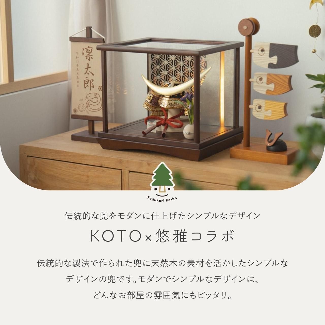 精巧な戦国兜の凛として強く美しい佇まいを天然木の優しいぬくもりが包み込むてづくり工房「木都」の兜ケース。伝統工芸の技術、裏側や後ろ側、内部の見えない箇所、素材にまでこだわり抜いた甲冑工房「悠雅」の兜飾り。ケースでも手にとって欲しい、お子様と一緒に飾れるKOTO×悠雅コラボ兜です。※ 細かい部品が含まれています。3歳未満のお子様は、保護者の方と一緒にお遊びください。選び抜いた素材と手間をかけた技法でつくる兜鉢選び抜いた素材と手間をかけた技法でつくる兜鉢KOTO×悠雅コラボ兜の兜鉢は、伝統的な本式の合せ鉢という技法でつくられています。本式の合せ鉢とは、戦国時代に頭部を守るために考案され、三角状の鉢部品を重ね合わせ、多数の星鋲をカシメる事で強度を高める技法です。選び抜いた素材と手間をかけた技法でつくる「庇」選び抜いた素材と手間をかけた技法でつくる「庇」兜の裏側にあたる庇は、甲州印伝革を使用し伝統的な技術で1つ1つ手作りで丁寧に作られています。選び抜いた素材と手間をかけた技法でつくる「小札」選び抜いた素材と手間をかけた技法でつくる「小札」小札は、細かい天然繊維である本物の絹糸を使用した正絹で結び合わせ繋げております。伝統的な兜をモダンに仕上げたシンプルなデザイン伝統的な兜をモダンに仕上げたシンプルなデザイン伝統的な製法で作られた兜に天然木の素材を活かしたシンプルなデザインの兜です。モダンでシンプルなデザインは、どんなお部屋の雰囲気にもピッタリ。コンパクトでちょうどいいサイズコンパクトでちょうどいいサイズ今どきのおうちに合わせたコンパクトなサイズに仕上げました。飾るスペースが狭くなりがちなマンションや子ども部屋にもぴったり。日本の伝統柄 麻の葉日本の伝統柄 麻の葉模様は、麻の葉と呼ばれています。麻の丈夫さ・成長の早さにあやかり、子供の健やかな成長の願いが込められています。兜の由来〜伊達正宗兜の由来〜伊達正宗妙見信仰という宗教は星や月、太陽などを神とあがめていました。伊達はその中でも月派で三日月にした理由は戦の邪魔にならないようにといわれています。ケースでも手にとって欲しいこだわりの兜ケースでも手にとって欲しいこだわりの兜通常ケースタイプの商品は「取り付け型」と言われ飾る手間を省くために設置箇所が固定されています。本兜は、あえて飾る手間を残し本物の素材や質感をお子様とご一緒に手にとって飾る体験をしてもらいたい為、設置箇所は固定されておりません。また、上部、前、左右にはガラスではなくアクリル板が設置されていますので、万が一の際も安心です。お子さまの感性を育む天然木へのこだわりお子さまの感性を育む天然木へのこだわり素材には、タモ、ブナといった天然木を使用。お子さまへの一生に一度の贈り物だから、木都は自然素材の天然木にこだわり続けています。※ 生産時期により使用する素材が一部変更になる場合がございます。熟練の職人による確かな手仕事熟練の職人による確かな手仕事伝統工芸の技術を受け継ぐ日本国内の熟練の職人が、一つひとつ丁寧に手づくりしています。おしゃれなギフト包装でお届けしますおしゃれなギフト包装でお届けします和の雰囲気を感じさせる越前和紙のギフト用ラッピングでお届け。料金がわかるものもお入れしていないので、そのまま贈り物として利用できます。商品レビュー記入でもれなくもらえる天然木のミニ名前札プレゼント商品レビュー記入でもれなくもらえる天然木のミニ名前札プレゼントミニサイズのお名前札 (通常販売価格1,980円) をプレゼント♪商品到着後、商品レビューをご記入の上、商品と同梱のチラシ記載のQRコードから応募フォームへ必要事項をご入力ください。店舗よりレビュー特典を発送いたします。※ お名前札の生年月日の表記は和暦となります。(例:令和七年)商品のご注文へ収納方法とセット内容兜・鍬形・芯木・菖蒲・ケース・電源ケーブル素材:タモサイズ:W280mm × D240mm × H250mm梱包時:W340mm × D280mm × H275mm兜のみ:約 W150mm × D110mm × H150mm収納方法鍬形は専用袋に入れ、兜は風呂敷に包みます。その他の部品は不織布に入れ収納してください。兜置きの下台とポールは組み立ててご利用ください。兜などを保管する箱は木のケースに入れて収納することが出来ます。注意事項甲冑について飾り付ける際に必ず手袋をご使用ください。錆や変色などの予防にもなります。本品の上には絶対に乗らないでください。本品または本品の部品は装飾品です。他の目的に使用しないで下さい。部品には小さなものがございます。お子様がお口に入れないようにご注意いください。木製品について色合いなど実際のものと写真とでは多少の誤差が生じる場合がございます。また、手作りであり天然木を使用している為、多少の仕様の変化や風合いがひとつひとつ異なります。あらかじめご了承ください。部品には小さなものがございます