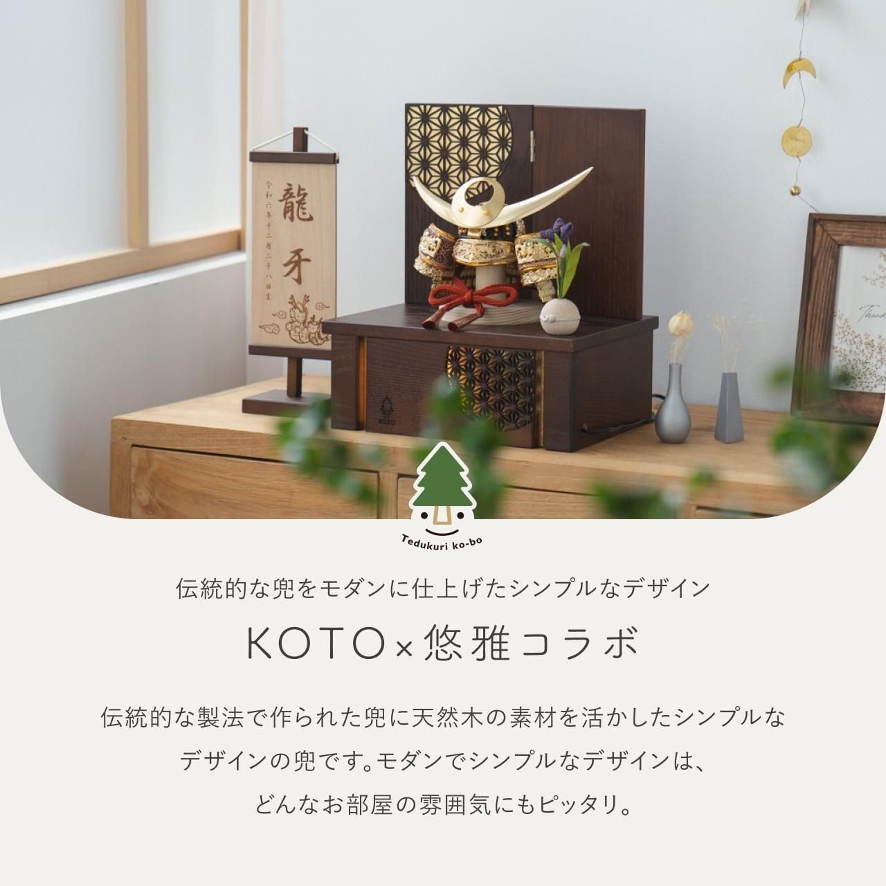 精巧な戦国兜の凛として強く美しい佇まいを天然木の優しいぬくもりが包み込む・・・まるで男の子の成長を温かく見守る家族の様に・・・そんなコンセプトから生まれた兜は、てづくり工房「木都」と甲冑工房「悠雅」のコラボレーションから生まれました。親しみやすく、お子様と一緒に飾れるKOTO×悠雅コラボ兜です。※ 細かい部品が含まれています。3歳未満のお子様は、保護者の方と一緒にお遊びください。選び抜いた素材と手間をかけた技法でつくる兜鉢選び抜いた素材と手間をかけた技法でつくる兜鉢KOTO×悠雅コラボ兜の兜鉢は、伝統的な本式の合せ鉢という技法でつくられています。本式の合せ鉢とは、戦国時代に頭部を守るために考案され、三角状の鉢部品を重ね合わせ、多数の星鋲をカシメる事で強度を高める技法です。選び抜いた素材と手間をかけた技法でつくる「庇」選び抜いた素材と手間をかけた技法でつくる「庇」兜の裏側にあたる庇は、甲州印伝革を使用し伝統的な技術で1つ1つ手作りで丁寧に作られています。選び抜いた素材と手間をかけた技法でつくる「小札」選び抜いた素材と手間をかけた技法でつくる「小札」小札は、細かい天然繊維である本物の絹糸を使用した正絹で結び合わせ繋げております。伝統的な兜をモダンに仕上げたシンプルなデザイン伝統的な兜をモダンに仕上げたシンプルなデザイン伝統的な製法で作られた兜に天然木の素材を活かしたシンプルなデザインの兜です。モダンでシンプルなデザインは、どんなお部屋の雰囲気にもピッタリ。コンパクトでちょうどいいサイズコンパクトでちょうどいいサイズ今どきのおうちに合わせたコンパクトなサイズに仕上げました。飾るスペースが狭くなりがちなマンションや子ども部屋にもぴったり。健やかな成長への願いを込めた麻の葉文様健やかな成長への願いを込めた麻の葉文様古来からの日本伝統の吉祥文様である麻の葉文様。麻の丈夫さ・成長の早さにあやかり、お子さまの健やかな成長への願いが込められています。兜の由来〜上杉謙信兜の由来〜上杉謙信生涯で70回の戦に出陣し、うち敗北が2回のみという勝率の高さから「軍神」とも呼ばれる上杉謙信の兜は日輪と三日月です。伊達と同じく妙見信仰の影響を受け上杉は太陽と月の二つを信仰していました。お子さまの感性を育む天然木へのこだわりお子さまの感性を育む天然木へのこだわり素材には、タモ、ブナといった天然木を使用。お子さまへの一生に一度の贈り物だから、木都は自然素材の天然木にこだわり続けています。※ 生産時期により使用する素材が一部変更になる場合がございます。熟練の職人による確かな手仕事熟練の職人による確かな手仕事伝統工芸の技術を受け継ぐ日本国内の熟練の職人が、一つひとつ丁寧に手づくりしています。おしゃれなギフト包装でお届けしますおしゃれなギフト包装でお届けします和の雰囲気を感じさせる越前和紙のギフト用ラッピングでお届け。料金がわかるものもお入れしていないので、そのまま贈り物として利用できます。商品レビュー記入でもれなくもらえる天然木のミニ名前札プレゼント商品レビュー記入でもれなくもらえる天然木のミニ名前札プレゼントミニサイズのお名前札 (通常販売価格1,980円) をプレゼント♪商品到着後、商品レビューをご記入の上、商品と同梱のチラシ記載のQRコードから応募フォームへ必要事項をご入力ください。店舗よりレビュー特典を発送いたします。※ お名前札の生年月日の表記は和暦となります。(例:令和七年)商品のご注文へ収納方法とセット内容兜・鍬形・芯木・菖蒲・屏風・収納箱・電源ケーブル屏風は収納箱の上に乗せてダンボール箱におしまい下さい。素材:タモサイズ:W250mm × D200mm × H305mm梱包時:W310mm × D240mm × H160mm兜のみ:約 W150mm × D110mm × H150mm収納方法鍬形は専用袋に入れ、兜は風呂敷に包みます。その他の部品は不織布に入れ収納してください。兜置きの下台とポールは組み立ててご利用ください。注意事項甲冑について飾り付ける際に必ず手袋をご使用ください。錆や変色などの予防にもなります。本品の上には絶対に乗らないでください。本品または本品の部品は装飾品です。他の目的に使用しないで下さい。部品には小さなものがございます。お子様がお口に入れないようにご注意いください。木製品について色合いなど実際のものと写真とでは多少の誤差が生じる場合がございます。また、手作りであり天然木を使用している為、多少の仕様の変化や風合いがひとつひとつ異なります。あらかじめご了承ください。部品には小さなものがございます。お子様がお口に入れないようにご注意いください。菖蒲には針金が入っております。お好みで角度を調整して下さい。材質により刻印の濃淡に差が生じますが不良品ではございません。木製品である限り自然なこととご承知下さいませ。保管場所は変色やカビ、サビの原因になりますので湿気の少ない場所・直