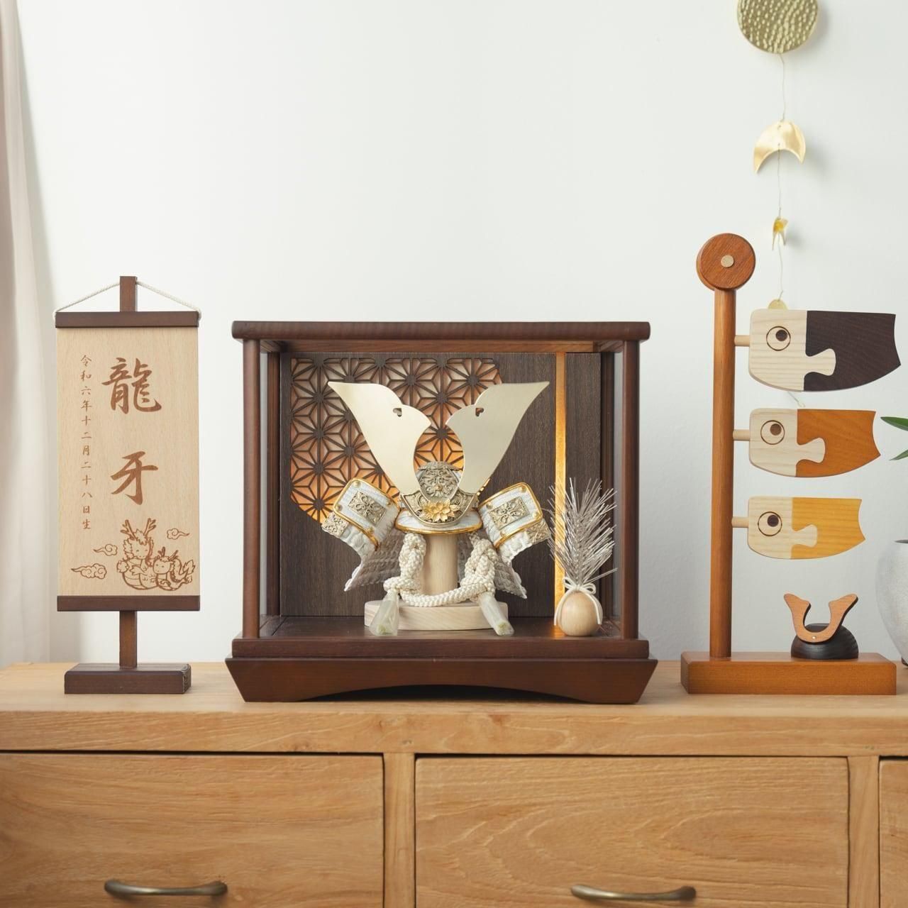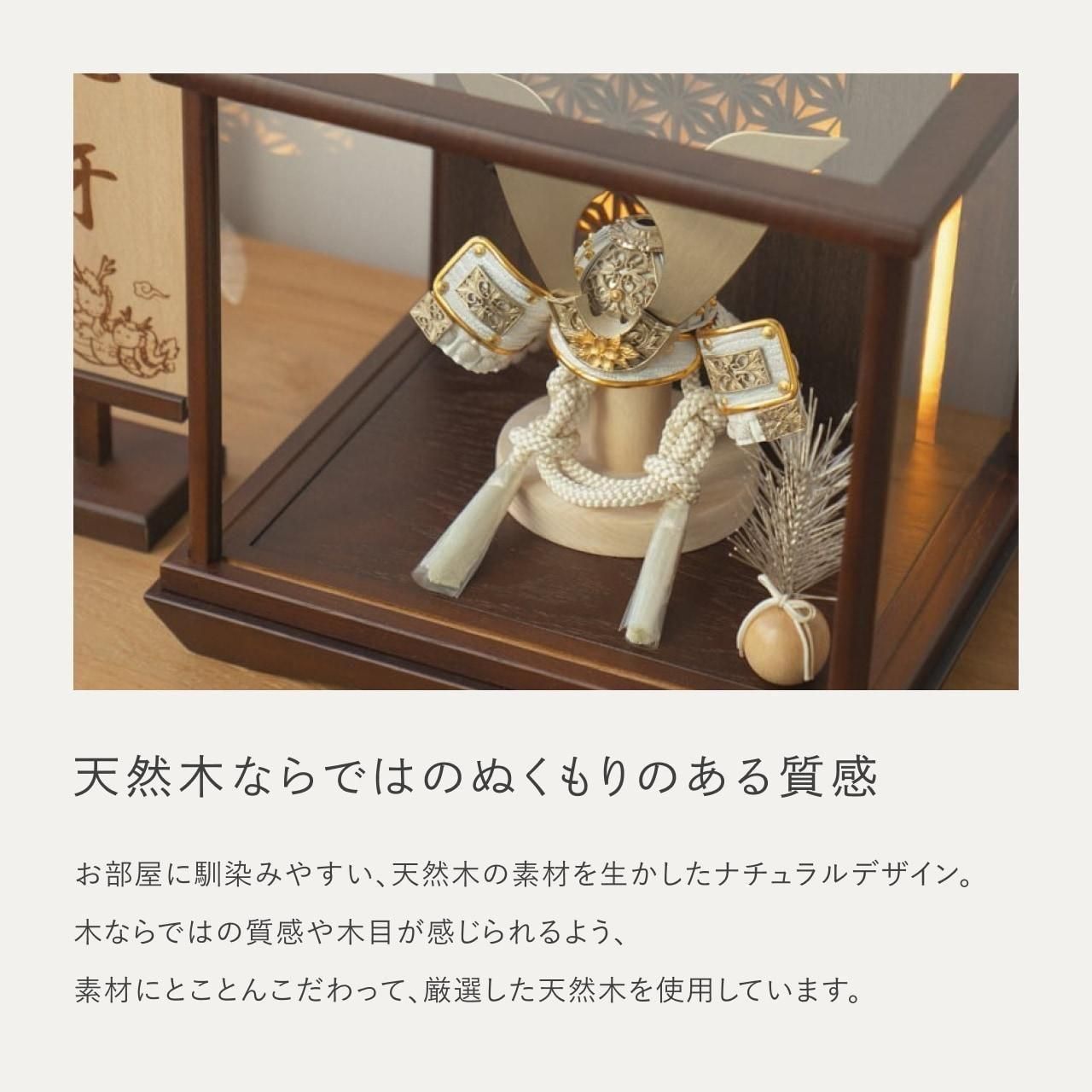 ケースでも手にとって欲しいこだわりの兜ケース伝統工芸の技術、裏側や後ろ側、内部の見えない箇所、素材にまでこだわり抜いた兜飾り。道具も木のぬくもりを感じて頂くために無垢材を使用しております。あえて飾る手間を残し、お子様とご一緒に手にとっていただき本物の素材、質感を感じてほしい「ことの兜」です。※ 細かい部品が含まれています。3歳未満のお子様は、保護者の方と一緒にお遊びください。コンパクトでちょうどいいサイズコンパクトでちょうどいいサイズ今どきのおうちに合わせたコンパクトなサイズに仕上げました。飾るスペースが狭くなりがちなマンションや子ども部屋にもぴったり。伝統的な兜をモダンに仕上げ白で統一されたシンプルなデザイン伝統的な兜をモダンに仕上げ白で統一されたシンプルなデザイン伝統的な製法で作られた兜に天然木の素材を活かしたシンプルなデザインの兜です。モダンで白に統一されたシンプルなデザインは、どんなお部屋の雰囲気にもピッタリ。選び抜いた素材と手間をかけた技法でつくる兜鉢選び抜いた素材と手間をかけた技法でつくる兜鉢ことの兜の兜鉢は、伝統的な本式の合せ鉢という技法でつくられています。本式の合せ鉢とは、戦国時代に頭部を守るために考案され、三角状の鉢部品を重ね合わせ、多数の星鋲をカシメる事で強度を高める技法です。古来からの日本伝統の吉祥文様である麻の葉文様。麻の丈夫さ・成長の早さにあやかり、お子さまの健やかな成長への願いが込められています。古来からの日本伝統の吉祥文様である麻の葉文様。麻の丈夫さ・成長の早さにあやかり、お子さまの健やかな成長への願いが込められています。古来からの日本伝統の吉祥文様である麻の葉文様。麻の丈夫さ・成長の早さにあやかり、お子さまの健やかな成長への願いが込められています。ケースでも手にとって欲しいこだわりの兜ケースでも手にとって欲しいこだわりの兜通常ケースタイプの商品は「取り付け型」と言われ飾る手間を省くために設置箇所が固定されています。本兜は、あえて飾る手間を残し本物の素材や質感をお子様とご一緒に手にとって飾る体験をしてもらいたい為、設置箇所は固定されておりません。また、上部、前、左右にはガラスではなくアクリル板が設置されていますので、万が一の際も安心です。お子さまの感性を育む天然木へのこだわりお子さまの感性を育む天然木へのこだわり素材には、タモ、ブナといった天然木を使用。お子さまへの一生に一度の贈り物だから、木都は自然素材の天然木にこだわり続けています。※ 生産時期により使用する素材が一部変更になる場合がございます。熟練の職人による確かな手仕事熟練の職人による確かな手仕事伝統工芸の技術を受け継ぐ日本国内の熟練の職人が、一つひとつ丁寧に手づくりしています。おしゃれなギフト包装でお届けしますおしゃれなギフト包装でお届けします和の雰囲気を感じさせる越前和紙のギフト用ラッピングでお届け。料金がわかるものもお入れしていないので、そのまま贈り物として利用できます。商品レビュー記入でもれなくもらえる天然木のミニ名前札プレゼント商品レビュー記入でもれなくもらえる天然木のミニ名前札プレゼントミニサイズのお名前札 (通常販売価格1,980円) をプレゼント♪商品到着後、商品レビューをご記入の上、商品と同梱のチラシ記載のQRコードから応募フォームへ必要事項をご入力ください。店舗よりレビュー特典を発送いたします。※ お名前札の生年月日の表記は和暦となります。(例:令和七年)商品のご注文へ収納方法とセット内容兜・鍬形・芯木・松・ケース・電源ケーブル素材:タモサイズ:W280mm × D240mm × H250mm梱包時:W340mm × D280mm × H275mm兜のみ:約 W200mm × D160mm × H150mm注意事項本品は、金属をふんだんに使用しております。取り扱われる方の人体にすり傷、切り傷、刺傷を及ぼす場合がございますので、左記注意事項をよく読んでお取り扱い下さい。甲冑について飾り付ける際に必ず手袋をご使用ください。錆や変色などの予防にもなります。本品の上には絶対に乗らないでください。本品または本品の部品は装飾品です。他の目的に使用しないで下さい。部品には小さなものがございます。お子様がお口に入れないようにご注意いください。木製品について色合いなど実際のものと写真とでは多少の誤差が生じる場合がございます。また、手作りであり天然木を使用している為、多少の仕様の変化や風合いがひとつひとつ異なります。あらかじめご了承ください。部品には小さなものがございます。お子様がお口に入れないようにご注意いください。菖蒲には針金が入っております。お好みで角度を調整して下さい。材質により刻印の濃淡に差が生じますが不良品ではございません。木製品である限り自然なこととご承知下さいませ。保管場所は変色やカビ、サビの原因になりますので湿気の少ない場所・直射日光の当たら
