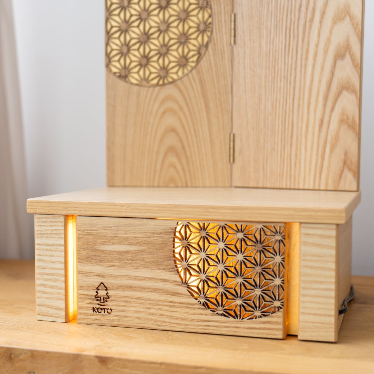 実際に手に取ると天然木の素材ならではの優しいぬくもりが伝わります。てづくり工房「木都」の職人が、伝統工芸の技術と天然木の素材を活かし、真心込めて1つ1つ丁寧につくりました。親しみやすく、お子様と一緒に飾れる「ことの兜」です。細かい部品が含まれています。3歳未満のお子様は、保護者の方と一緒にお遊びください。兜の忍び緒の房に巻いておりますビニールは外さずにお飾り下さい。コンパクトでちょうどいいサイズコンパクトでちょうどいいサイズ今どきのおうちに合わせたコンパクトなサイズに仕上げました。飾るスペースが狭くなりがちなマンションや子ども部屋にもぴったり。伝統的な兜をモダンに仕上げ白で統一されたシンプルなデザイン伝統的な兜をモダンに仕上げ白で統一されたシンプルなデザイン伝統的な製法で作られた兜に天然木の素材を活かしたシンプルなデザインの兜です。モダンで白に統一されたシンプルなデザインは、どんなお部屋の雰囲気にもピッタリ。選び抜いた素材と手間をかけた技法でつくる兜鉢選び抜いた素材と手間をかけた技法でつくる兜鉢ことの兜の兜鉢は、伝統的な本式の合せ鉢という技法でつくられています。本式の合せ鉢とは、戦国時代に頭部を守るために考案され、三角状の鉢部品を重ね合わせ、多数の星鋲をカシメる事で強度を高める技法です。健やかな成長への願いを込めた麻の葉文様健やかな成長への願いを込めた麻の葉文様古来からの日本伝統の吉祥文様である麻の葉文様。麻の丈夫さ・成長の早さにあやかり、お子さまの健やかな成長への願いが込められています。お子さまの感性を育む天然木へのこだわりお子さまの感性を育む天然木へのこだわり素材には、タモ、ブナといった天然木を使用。お子さまへの一生に一度の贈り物だから、木都は自然素材の天然木にこだわり続けています。※ 生産時期により使用する素材が一部変更になる場合がございます。熟練の職人による確かな手仕事熟練の職人による確かな手仕事伝統工芸の技術を受け継ぐ日本国内の熟練の職人が、一つひとつ丁寧に手づくりしています。越前和紙のギフト包装でお届けします越前和紙のギフト包装でお届けします和の雰囲気を感じさせる越前和紙のギフト用ラッピングでお届け。料金がわかるものもお入れしていないので、そのまま贈り物として利用できます。商品レビュー記入でもれなくもらえる天然木のミニ名前札プレゼント商品レビュー記入でもれなくもらえる天然木のミニ名前札プレゼントミニサイズのお名前札 (通常販売価格1,980円) をプレゼント♪商品到着後、商品レビューをご記入の上、商品と同梱のチラシ記載のQRコードから応募フォームへ必要事項をご入力ください。店舗よりレビュー特典を発送いたします。※ レビューの投稿後、特典の発送は2週間ほどかかります。節句に間に合わせたい方は単品でのご購入をおすすめいたします。※ お名前札の生年月日の表記は和暦となります。(例:令和八年)商品のご注文へ収納方法とセット内容兜・鍬形・芯木・菖蒲・屏風・収納箱・電源ケーブル屏風は収納箱の上に乗せてダンボール箱におしまい下さい。素材:タモサイズ:W250mm × D200mm × H305mm梱包時:W310mm × D240mm × H160mm兜のみ:約 W150mm × D160mm × H150mm注意事項本品は、金属をふんだんに使用しております。取り扱われる方の人体にすり傷、切り傷、刺傷を及ぼす場合がございますので、左記注意事項をよく読んでお取り扱い下さい。甲冑について飾り付ける際に必ず手袋をご使用ください。錆や変色などの予防にもなります。本品の上には絶対に乗らないでください。本品または本品の部品は装飾品です。他の目的に使用しないで下さい。部品には小さなものがございます。お子様がお口に入れないようにご注意いください。木製品について色合いなど実際のものと写真とでは多少の誤差が生じる場合がございます。また、手作りであり天然木を使用している為、多少の仕様の変化や風合いがひとつひとつ異なります。あらかじめご了承ください。部品には小さなものがございます。お子様がお口に入れないようにご注意いください。菖蒲には針金が入っております。お好みで角度を調整して下さい。材質により刻印の濃淡に差が生じますが不良品ではございません。木製品である限り自然なこととご承知下さいませ。保管場所は変色やカビ、サビの原因になりますので湿気の少ない場所・直射日光の当たらない場所に保管してください。ご不明点がございましたら > お問い合わせページ からご相談ください。