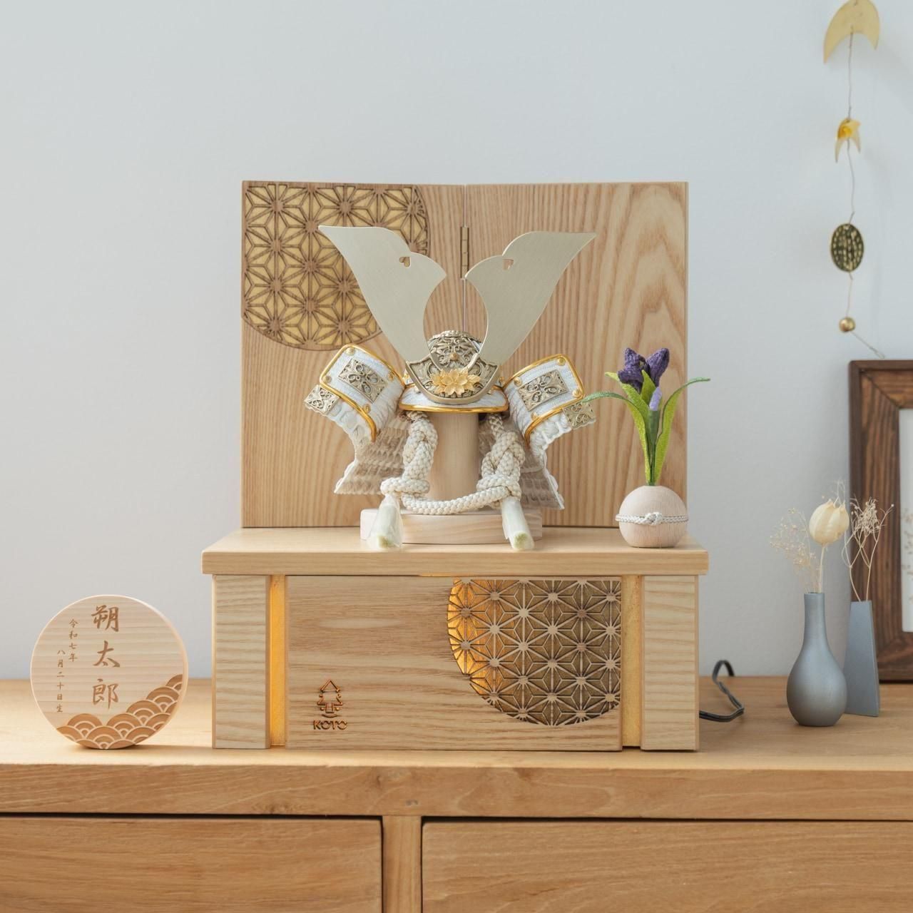 伝統的な兜をモダンに仕上げ白で統一されたシンプルなデザイン伝統的な製法で作られた兜に天然木の素材を活かしたシンプルなデザインの兜です。モダンで白に統一されたシンプルなデザインは、どんなお部屋の雰囲気にもピッタリ。