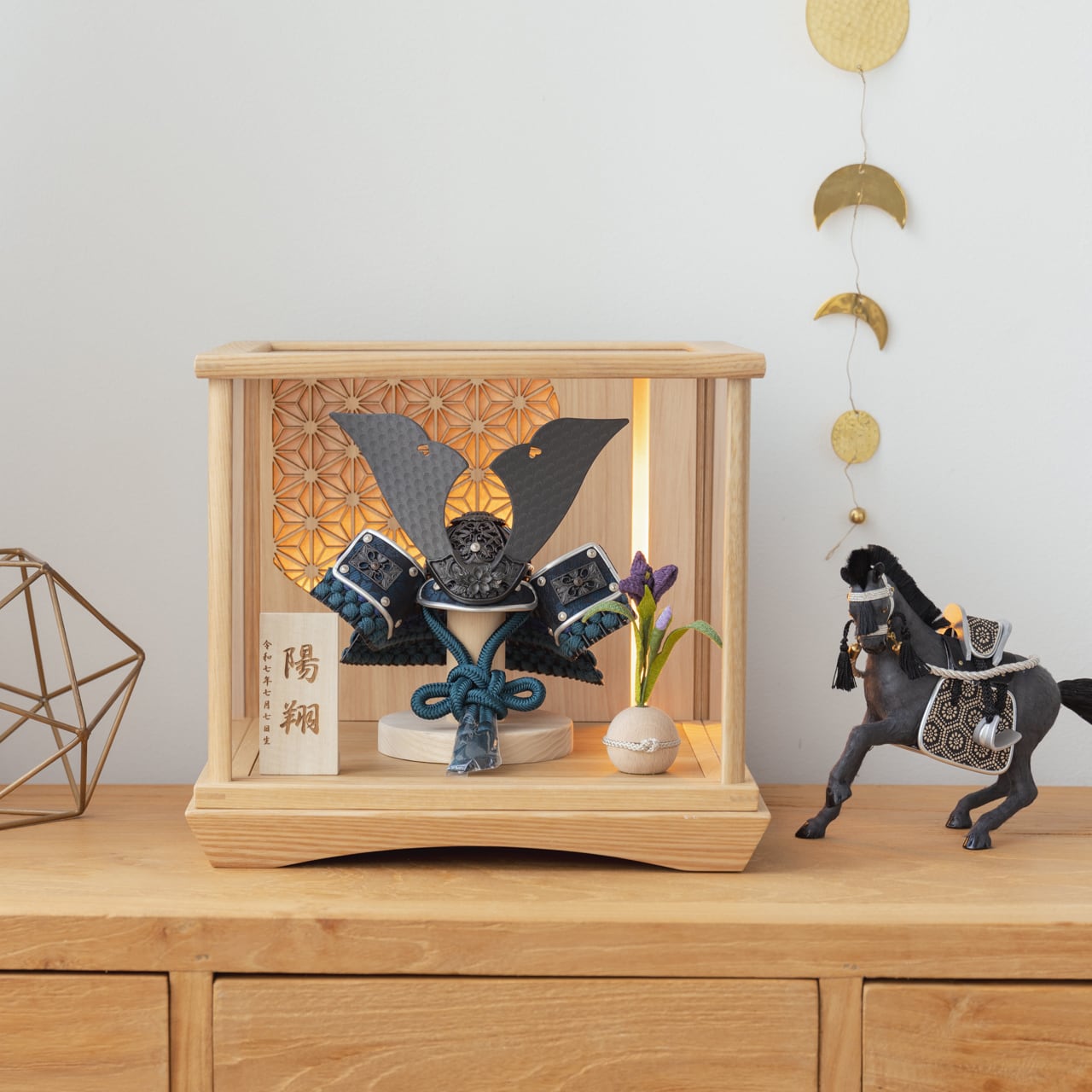 実際に手に取ると天然木の素材ならではの優しいぬくもりが伝わります。てづくり工房「木都」の職人が、伝統工芸の技術と天然木の素材を活かし、真心込めて1つ1つ丁寧につくりました。親しみやすく、お子様と一緒に飾れる「ことの兜」です。※ 細かい部品が含まれています。3歳未満のお子様は、保護者の方と一緒にお遊びください。コンパクトでちょうどいいサイズコンパクトでちょうどいいサイズ今どきのおうちに合わせたコンパクトなサイズに仕上げました。飾るスペースが狭くなりがちなマンションや子ども部屋にもぴったり。伝統的な兜をモダンに仕上げたシンプルなデザイン伝統的な兜をモダンに仕上げたシンプルなデザイン伝統的な製法で作られた兜に天然木の素材を活かしたシンプルなデザインの兜です。モダンでシンプルなデザインは、どんなお部屋の雰囲気にもピッタリ。選び抜いた素材と手間をかけた技法でつくる兜鉢選び抜いた素材と手間をかけた技法でつくる兜鉢ことの兜の兜鉢は、伝統的な本式の合せ鉢という技法でつくられています。本式の合せ鉢とは、戦国時代に頭部を守るために考案され、三角状の鉢部品を重ね合わせ、多数の星鋲をカシメる事で強度を高める技法です。健やかな成長への願いを込めた麻の葉文様健やかな成長への願いを込めた麻の葉文様古来からの日本伝統の吉祥文様である麻の葉文様。麻の丈夫さ・成長の早さにあやかり、お子さまの健やかな成長への願いが込められています。ケースでも手にとって欲しいこだわりの兜ケースでも手にとって欲しいこだわりの兜木都のケース飾りは、本物の素材や質感を感じながら親子で一緒に手に取って飾る体験をしてほしいから、あえて飾る手間を残しています。手間はかかりますが、伝統的な技法で一つひとつ手づくりしています。お子さまの感性を育む天然木へのこだわりお子さまの感性を育む天然木へのこだわり素材には、タモ、ブナといった天然木を使用。お子さまへの一生に一度の贈り物だから、木都は自然素材の天然木にこだわり続けています。※ 生産時期により使用する素材が一部変更になる場合がございます。熟練の職人による確かな手仕事熟練の職人による確かな手仕事伝統工芸の技術を受け継ぐ日本国内の熟練の職人が、一つひとつ丁寧に手づくりしています。おしゃれなギフト包装でお届けしますおしゃれなギフト包装でお届けします和の雰囲気を感じさせる越前和紙のギフト用ラッピングでお届け。料金がわかるものもお入れしていないので、そのまま贈り物として利用できます。商品レビュー記入でもれなくもらえる天然木のミニ名前札プレゼント商品レビュー記入でもれなくもらえる天然木のミニ名前札プレゼントミニサイズのお名前札 (通常販売価格1,980円) をプレゼント♪商品到着後、商品レビューをご記入の上、商品と同梱のチラシ記載のQRコードから応募フォームへ必要事項をご入力ください。店舗よりレビュー特典を発送いたします。※ お名前札の生年月日の表記は和暦となります。(例:令和七年)商品のご注文へ収納方法とセット内容兜・鍬形・芯木・菖蒲・ケース・電源ケーブル素材:タモサイズ:W280mm × D240mm × H250mm梱包時:W340mm × D280mm × H275mm兜のみ:約 W175mm × D125mm × H130mm注意事項本品は、金属をふんだんに使用しております。取り扱われる方の人体にすり傷、切り傷、刺傷を及ぼす場合がございますので、左記注意事項をよく読んでお取り扱い下さい。甲冑について飾り付ける際に必ず手袋をご使用ください。錆や変色などの予防にもなります。本品の上には絶対に乗らないでください。本品または本品の部品は装飾品です。他の目的に使用しないで下さい。部品には小さなものがございます。お子様がお口に入れないようにご注意いください。木製品について色合いなど実際のものと写真とでは多少の誤差が生じる場合がございます。また、手作りであり天然木を使用している為、多少の仕様の変化や風合いがひとつひとつ異なります。あらかじめご了承ください。部品には小さなものがございます。お子様がお口に入れないようにご注意いください。菖蒲には針金が入っております。お好みで角度を調整して下さい。材質により刻印の濃淡に差が生じますが不良品ではございません。木製品である限り自然なこととご承知下さいませ。保管場所は変色やカビ、サビの原因になりますので湿気の少ない場所・直射日光の当たらない場所に保管してください。ご不明点がございましたら > お問い合わせページ からご相談ください。