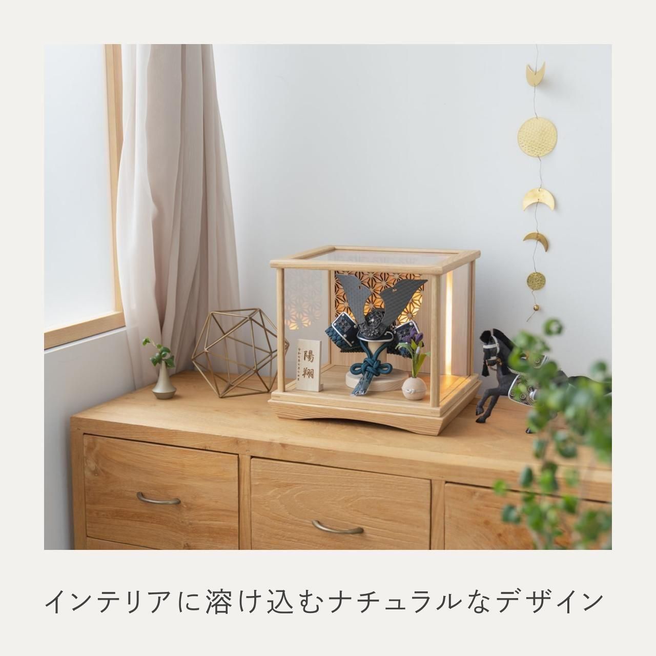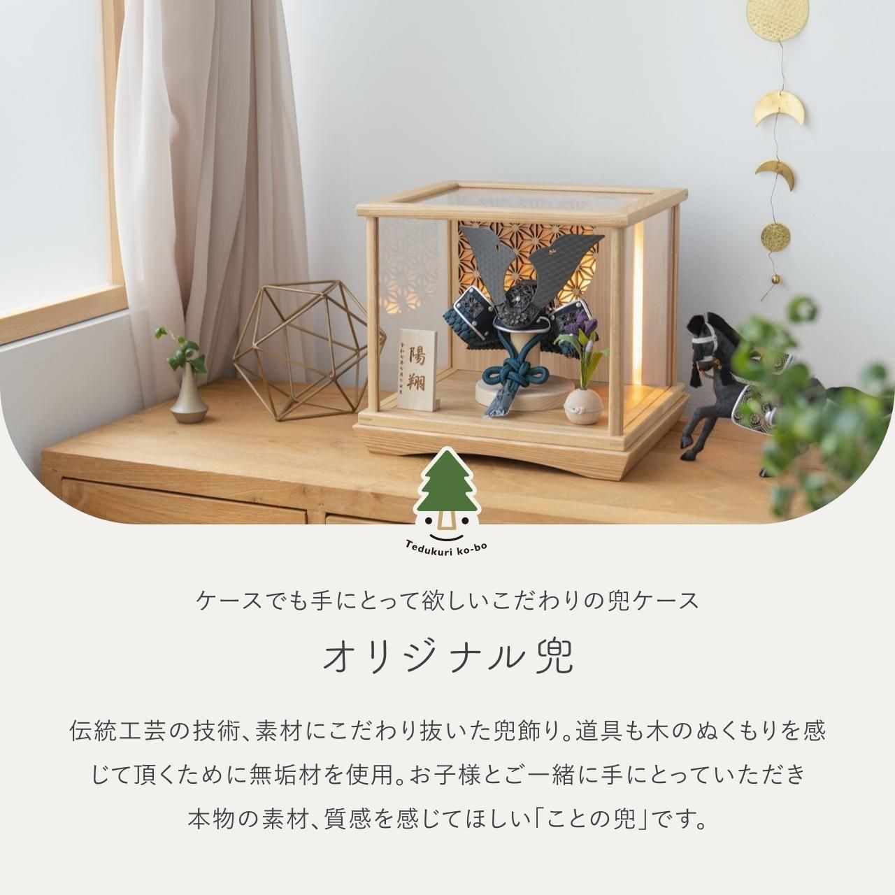 ケースでも手にとって欲しいこだわりの兜ケース伝統工芸の技術、裏側や後ろ側、内部の見えない箇所、素材にまでこだわり抜いた兜飾り。道具も木のぬくもりを感じて頂くために無垢材を使用しております。あえて飾る手間を残し、お子様とご一緒に手にとっていただき本物の素材、質感を感じてほしい「ことの兜」です。※ 細かい部品が含まれています。3歳未満のお子様は、保護者の方と一緒にお遊びください。コンパクトでちょうどいいサイズコンパクトでちょうどいいサイズ今どきのおうちに合わせたコンパクトなサイズに仕上げました。飾るスペースが狭くなりがちなマンションや子ども部屋にもぴったり。伝統的な兜をモダンに仕上げたシンプルなデザイン伝統的な兜をモダンに仕上げたシンプルなデザイン伝統的な製法で作られた兜に天然木の素材を活かしたシンプルなデザインの兜です。モダンでシンプルなデザインは、どんなお部屋の雰囲気にもピッタリ。選び抜いた素材と手間をかけた技法でつくる兜鉢選び抜いた素材と手間をかけた技法でつくる兜鉢ことの兜の兜鉢は、伝統的な本式の合せ鉢という技法でつくられています。本式の合せ鉢とは、戦国時代に頭部を守るために考案され、三角状の鉢部品を重ね合わせ、多数の星鋲をカシメる事で強度を高める技法です。日本の伝統柄 麻の葉日本の伝統柄 麻の葉模様は、麻の葉と呼ばれています。麻の丈夫さ・成長の早さにあやかり、子供の健やかな成長の願いが込められています。ケースでも手にとって欲しいこだわりの兜ケースでも手にとって欲しいこだわりの兜通常ケースタイプの商品は「取り付け型」と言われ飾る手間を省くために設置箇所が固定されています。本兜は、あえて飾る手間を残し本物の素材や質感をお子様とご一緒に手にとって飾る体験をしてもらいたい為、設置箇所は固定されておりません。また、上部、前、左右にはガラスではなくアクリル板が設置されていますので、万が一の際も安心です。お子さまの感性を育む天然木へのこだわりお子さまの感性を育む天然木へのこだわり素材には、タモ、ブナといった天然木を使用。お子さまへの一生に一度の贈り物だから、木都は自然素材の天然木にこだわり続けています。※ 生産時期により使用する素材が一部変更になる場合がございます。熟練の職人による確かな手仕事熟練の職人による確かな手仕事伝統工芸の技術を受け継ぐ日本国内の熟練の職人が、一つひとつ丁寧に手づくりしています。おしゃれなギフト包装でお届けしますおしゃれなギフト包装でお届けします和の雰囲気を感じさせる越前和紙のギフト用ラッピングでお届け。料金がわかるものもお入れしていないので、そのまま贈り物として利用できます。商品レビュー記入でもれなくもらえる天然木のミニ名前札プレゼント商品レビュー記入でもれなくもらえる天然木のミニ名前札プレゼントミニサイズのお名前札 (通常販売価格1,980円) をプレゼント♪商品到着後、商品レビューをご記入の上、商品と同梱のチラシ記載のQRコードから応募フォームへ必要事項をご入力ください。店舗よりレビュー特典を発送いたします。※ お名前札の生年月日の表記は和暦となります。(例:令和七年)商品のご注文へ収納方法とセット内容兜・鍬形・芯木・菖蒲・ケース・電源ケーブル素材:タモサイズ:W280mm × D240mm × H250mm梱包時:W340mm × D280mm × H275mm兜のみ:約 W175mm × D125mm × H130mm注意事項本品は、金属をふんだんに使用しております。取り扱われる方の人体にすり傷、切り傷、刺傷を及ぼす場合がございますので、左記注意事項をよく読んでお取り扱い下さい。甲冑について飾り付ける際に必ず手袋をご使用ください。錆や変色などの予防にもなります。本品の上には絶対に乗らないでください。本品または本品の部品は装飾品です。他の目的に使用しないで下さい。部品には小さなものがございます。お子様がお口に入れないようにご注意いください。木製品について色合いなど実際のものと写真とでは多少の誤差が生じる場合がございます。また、手作りであり天然木を使用している為、多少の仕様の変化や風合いがひとつひとつ異なります。あらかじめご了承ください。部品には小さなものがございます。お子様がお口に入れないようにご注意いください。菖蒲には針金が入っております。お好みで角度を調整して下さい。材質により刻印の濃淡に差が生じますが不良品ではございません。木製品である限り自然なこととご承知下さいませ。保管場所は変色やカビ、サビの原因になりますので湿気の少ない場所・直射日光の当たらない場所に保管してください。ご不明点がございましたら > お問い合わせページ からご相談ください。