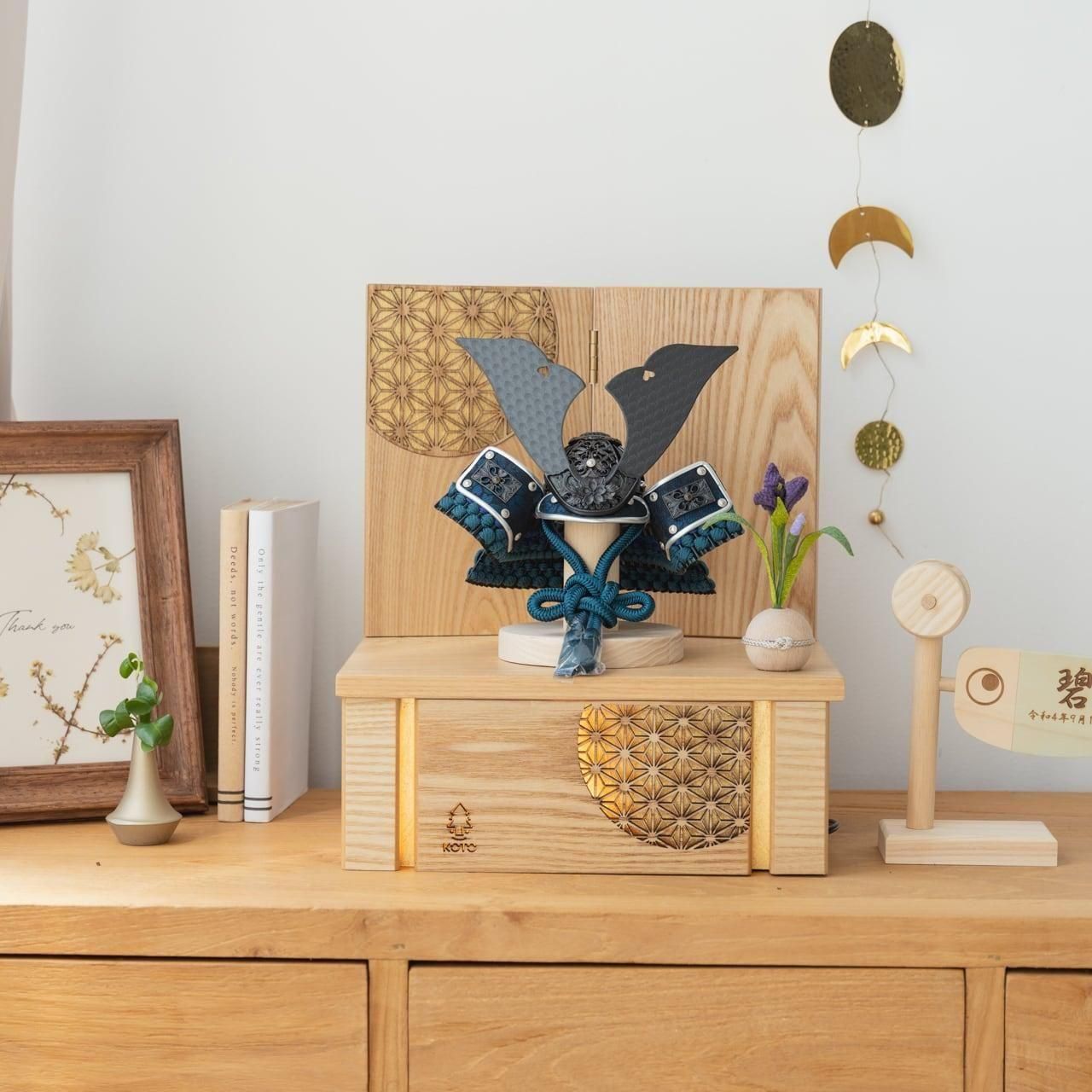 実際に手に取ると天然木の素材ならではの優しいぬくもりが伝わります。てづくり工房「木都」の職人が、伝統工芸の技術と天然木の素材を活かし、真心込めて1つ1つ丁寧につくりました。親しみやすく、お子様と一緒に飾れる「ことの兜」です。※ 細かい部品が含まれています。3歳未満のお子様は、保護者の方と一緒にお遊びください。コンパクトでちょうどいいサイズコンパクトでちょうどいいサイズ今どきのおうちに合わせたコンパクトなサイズに仕上げました。飾るスペースが狭くなりがちなマンションや子ども部屋にもぴったり。伝統的な兜をモダンに仕上げたシンプルなデザイン伝統的な兜をモダンに仕上げたシンプルなデザイン伝統的な製法で作られた兜に天然木の素材を活かしたシンプルなデザインの兜です。モダンでシンプルなデザインは、どんなお部屋の雰囲気にもピッタリ。選び抜いた素材と手間をかけた技法でつくる兜鉢選び抜いた素材と手間をかけた技法でつくる兜鉢ことの兜の兜鉢は、伝統的な本式の合せ鉢という技法でつくられています。本式の合せ鉢とは、戦国時代に頭部を守るために考案され、三角状の鉢部品を重ね合わせ、多数の星鋲をカシメる事で強度を高める技法です。日本の伝統柄 麻の葉日本の伝統柄 麻の葉模様は、麻の葉と呼ばれています。麻の丈夫さ・成長の早さにあやかり、子供の健やかな成長の願いが込められています。お子さまの感性を育む天然木へのこだわりお子さまの感性を育む天然木へのこだわり素材には、タモ、ブナといった天然木を使用。お子さまへの一生に一度の贈り物だから、木都は自然素材の天然木にこだわり続けています。※ 生産時期により使用する素材が一部変更になる場合がございます。熟練の職人による確かな手仕事熟練の職人による確かな手仕事伝統工芸の技術を受け継ぐ日本国内の熟練の職人が、一つひとつ丁寧に手づくりしています。おしゃれなギフト包装でお届けしますおしゃれなギフト包装でお届けします和の雰囲気を感じさせる越前和紙のギフト用ラッピングでお届け。料金がわかるものもお入れしていないので、そのまま贈り物として利用できます。商品レビュー記入でもれなくもらえる天然木のミニ名前札プレゼント商品レビュー記入でもれなくもらえる天然木のミニ名前札プレゼントミニサイズのお名前札 (通常販売価格1,980円) をプレゼント♪商品到着後、商品レビューをご記入の上、商品と同梱のチラシ記載のQRコードから応募フォームへ必要事項をご入力ください。店舗よりレビュー特典を発送いたします。※ お名前札の生年月日の表記は和暦となります。(例:令和七年)商品のご注文へ収納方法とセット内容兜・鍬形・袱紗・芯木・菖蒲・屏風・収納箱・電源ケーブル屏風は収納箱の上に乗せてダンボール箱におしまい下さい。素材:タモサイズ:W250mm × D200mm × H305mm梱包時:W310mm × D240mm × H160mm兜のみ:約 W175mm × D125mm × H130mm注意事項本品は、金属をふんだんに使用しております。取り扱われる方の人体にすり傷、切り傷、刺傷を及ぼす場合がございますので、左記注意事項をよく読んでお取り扱い下さい。甲冑について飾り付ける際に必ず手袋をご使用ください。錆や変色などの予防にもなります。本品の上には絶対に乗らないでください。本品または本品の部品は装飾品です。他の目的に使用しないで下さい。部品には小さなものがございます。お子様がお口に入れないようにご注意いください。木製品について色合いなど実際のものと写真とでは多少の誤差が生じる場合がございます。また、手作りであり天然木を使用している為、多少の仕様の変化や風合いがひとつひとつ異なります。あらかじめご了承ください。部品には小さなものがございます。お子様がお口に入れないようにご注意いください。菖蒲には針金が入っております。お好みで角度を調整して下さい。材質により刻印の濃淡に差が生じますが不良品ではございません。木製品である限り自然なこととご承知下さいませ。保管場所は変色やカビ、サビの原因になりますので湿気の少ない場所・直射日光の当たらない場所に保管してください。ご不明点がございましたら > お問い合わせページ からご相談ください。