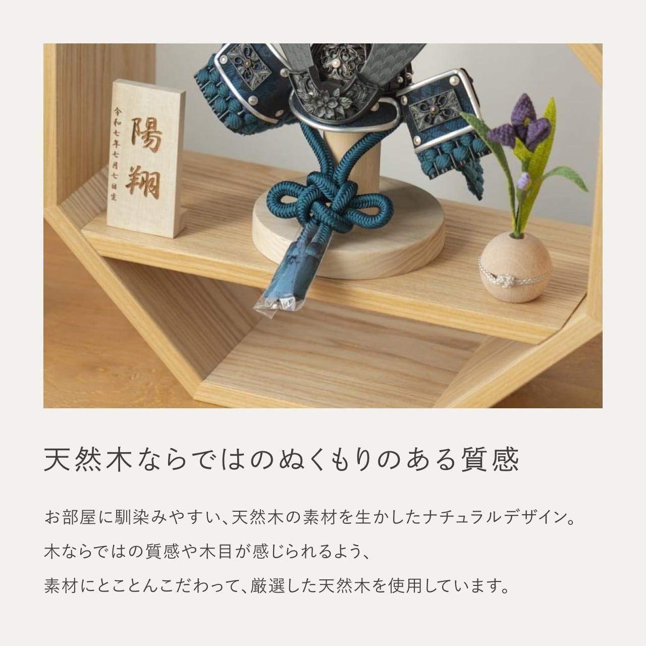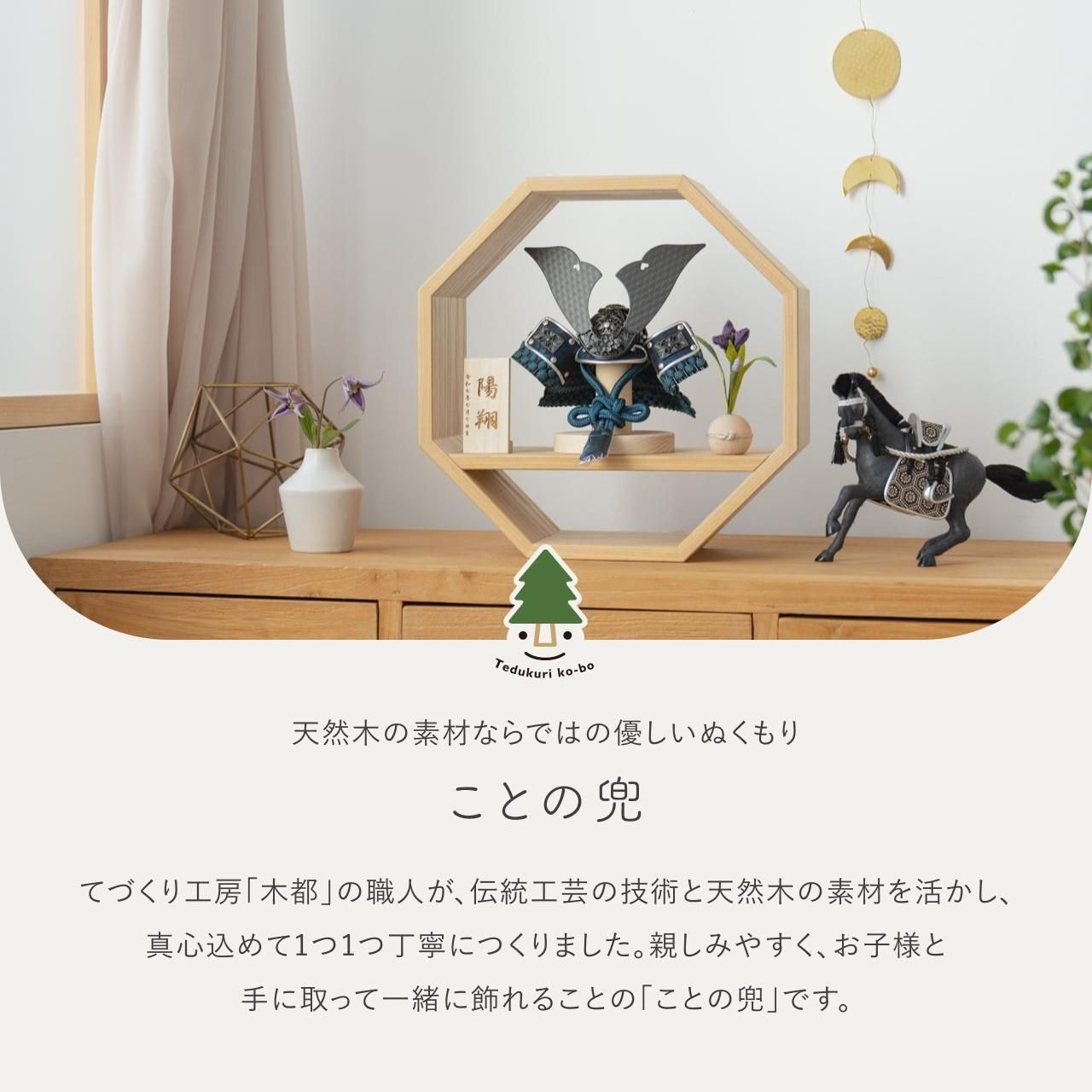 実際に手に取ると天然木の素材ならではの優しいぬくもりが伝わります。てづくり工房「木都」の職人が、伝統工芸の技術と天然木の素材を活かし、真心込めて1つ1つ丁寧につくりました。親しみやすく、お子様と一緒に飾れる「ことの兜」です。※ 細かい部品が含まれています。3歳未満のお子様は、保護者の方と一緒にお遊びください。コンパクトでちょうどいいサイズコンパクトでちょうどいいサイズ今どきのおうちに合わせたコンパクトなサイズに仕上げました。飾るスペースが狭くなりがちなマンションや子ども部屋にもぴったり。伝統的な兜をモダンに仕上げたシンプルなデザイン伝統的な兜をモダンに仕上げたシンプルなデザイン伝統的な製法で作られた兜に天然木の素材を活かしたシンプルなデザインの兜です。モダンでシンプルなデザインは、どんなお部屋の雰囲気にもピッタリ。選び抜いた素材と手間をかけた技法でつくる兜鉢選び抜いた素材と手間をかけた技法でつくる兜鉢ことの兜の兜鉢は、伝統的な本式の合せ鉢という技法でつくられています。本式の合せ鉢とは、戦国時代に頭部を守るために考案され、三角状の鉢部品を重ね合わせ、多数の星鋲をカシメる事で強度を高める技法です。こだわりの八角形の飾り台こだわりの八角形の飾り台八角形は「縁起が良い」とされる形の一つで、「繁栄」「幸運」「幸福」などを象徴するシンボルでもあります。風水では“八方位”を表すとされており、全ての方角から幸せを引き寄せ、邪気を払ってくれるといわれています。 「8」と言う数字も、日本や中国において末広がりの数字で縁起が良いと伝えられています。お子さまの感性を育む天然木へのこだわりお子さまの感性を育む天然木へのこだわり素材には、タモ、ブナといった天然木を使用。お子さまへの一生に一度の贈り物だから、木都は自然素材の天然木にこだわり続けています。※ 生産時期により使用する素材が一部変更になる場合がございます。熟練の職人による確かな手仕事熟練の職人による確かな手仕事伝統工芸の技術を受け継ぐ日本国内の熟練の職人が、一つひとつ丁寧に手づくりしています。おしゃれなギフト包装でお届けしますおしゃれなギフト包装でお届けします和の雰囲気を感じさせる越前和紙のギフト用ラッピングでお届け。料金がわかるものもお入れしていないので、そのまま贈り物として利用できます。商品レビュー記入でもれなくもらえる天然木のミニ名前札プレゼント商品レビュー記入でもれなくもらえる天然木のミニ名前札プレゼントミニサイズのお名前札 (通常販売価格1,980円) をプレゼント♪商品到着後、商品レビューをご記入の上、商品と同梱のチラシ記載のQRコードから応募フォームへ必要事項をご入力ください。店舗よりレビュー特典を発送いたします。※ お名前札の生年月日の表記は和暦となります。(例:令和七年)商品のご注文へ収納方法とセット内容兜・鍬形・芯木・菖蒲・飾り台素材:タモサイズ:W310mm × D110mm × H310mm梱包時:W460mm × D370mm × H160mm兜のみ:約 W175mm × D125mm × H130mm注意事項本品は、金属をふんだんに使用しております。取り扱われる方の人体にすり傷、切り傷、刺傷を及ぼす場合がございますので、左記注意事項をよく読んでお取り扱い下さい。甲冑について飾り付ける際に必ず手袋をご使用ください。錆や変色などの予防にもなります。本品の上には絶対に乗らないでください。本品または本品の部品は装飾品です。他の目的に使用しないで下さい。部品には小さなものがございます。お子様がお口に入れないようにご注意いください。木製品について色合いなど実際のものと写真とでは多少の誤差が生じる場合がございます。また、手作りであり天然木を使用している為、多少の仕様の変化や風合いがひとつひとつ異なります。あらかじめご了承ください。部品には小さなものがございます。お子様がお口に入れないようにご注意いください。菖蒲には針金が入っております。お好みで角度を調整して下さい。材質により刻印の濃淡に差が生じますが不良品ではございません。木製品である限り自然なこととご承知下さいませ。保管場所は変色やカビ、サビの原因になりますので湿気の少ない場所・直射日光の当たらない場所に保管してください。ご不明点がございましたら > お問い合わせページ からご相談ください。
