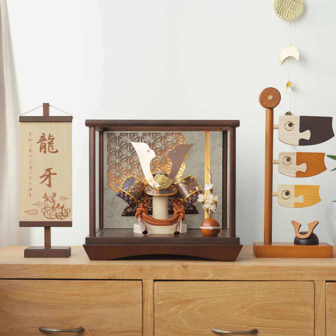 実際に手に取ると天然木の素材ならではの優しいぬくもりが伝わります。てづくり工房「木都」の職人が、伝統工芸の技術と天然木の素材を活かし、真心込めて1つ1つ丁寧につくりました。親しみやすく、お子様と一緒に飾れる「ことの兜」です。※ 細かい部品が含まれています。3歳未満のお子様は、保護者の方と一緒にお遊びください。コンパクトでちょうどいいサイズコンパクトでちょうどいいサイズ今どきのおうちに合わせたコンパクトなサイズに仕上げました。飾るスペースが狭くなりがちなマンションや子ども部屋にもぴったり。伝統的な兜をモダンに仕上げたシンプルなデザイン伝統的な兜をモダンに仕上げたシンプルなデザイン伝統的な製法で作られた兜に天然木の素材を活かしたシンプルなデザインの兜です。モダンでシンプルなデザインは、どんなお部屋の雰囲気にもピッタリ。選び抜いた素材と手間をかけた技法でつくる兜鉢選び抜いた素材と手間をかけた技法でつくる兜鉢ことの兜の兜鉢は、伝統的な本式の合せ鉢という技法でつくられています。本式の合せ鉢とは、戦国時代に頭部を守るために考案され、三角状の鉢部品を重ね合わせ、多数の星鋲をカシメる事で強度を高める技法です。健やかな成長への願いを込めた麻の葉文様健やかな成長への願いを込めた麻の葉文様古来からの日本伝統の吉祥文様である麻の葉文様。麻の丈夫さ・成長の早さにあやかり、お子さまの健やかな成長への願いが込められています。ケースでも手にとって欲しいこだわりの兜ケースでも手にとって欲しいこだわりの兜木都のケース飾りは、本物の素材や質感を感じながら親子で一緒に手に取って飾る体験をしてほしいから、あえて飾る手間を残しています。手間はかかりますが、伝統的な技法で一つひとつ手づくりしています。お子さまの感性を育む天然木へのこだわりお子さまの感性を育む天然木へのこだわり素材には、タモ、ブナといった天然木を使用。お子さまへの一生に一度の贈り物だから、木都は自然素材の天然木にこだわり続けています。※ 生産時期により使用する素材が一部変更になる場合がございます。熟練の職人による確かな手仕事熟練の職人による確かな手仕事伝統工芸の技術を受け継ぐ日本国内の熟練の職人が、一つひとつ丁寧に手づくりしています。おしゃれなギフト包装でお届けしますおしゃれなギフト包装でお届けします和の雰囲気を感じさせる越前和紙のギフト用ラッピングでお届け。料金がわかるものもお入れしていないので、そのまま贈り物として利用できます。商品レビュー記入でもれなくもらえる天然木のミニ名前札プレゼント商品レビュー記入でもれなくもらえる天然木のミニ名前札プレゼントミニサイズのお名前札 (通常販売価格1,980円) をプレゼント♪商品到着後、商品レビューをご記入の上、商品と同梱のチラシ記載のQRコードから応募フォームへ必要事項をご入力ください。店舗よりレビュー特典を発送いたします。※ お名前札の生年月日の表記は和暦となります。(例:令和七年)商品のご注文へ収納方法とセット内容兜・鍬形・芯木・花飾り・ケース・電源ケーブル素材:タモサイズ:W280mm × D240mm × H250mm梱包時:W340mm × D280mm × H275mm兜のみ:約 W170mm × D120mm × H130mm注意事項本品は、金属をふんだんに使用しております。取り扱われる方の人体にすり傷、切り傷、刺傷を及ぼす場合がございますので、左記注意事項をよく読んでお取り扱い下さい。甲冑について飾り付ける際に必ず手袋をご使用ください。錆や変色などの予防にもなります。本品の上には絶対に乗らないでください。本品または本品の部品は装飾品です。他の目的に使用しないで下さい。部品には小さなものがございます。お子様がお口に入れないようにご注意いください。木製品について色合いなど実際のものと写真とでは多少の誤差が生じる場合がございます。また、手作りであり天然木を使用している為、多少の仕様の変化や風合いがひとつひとつ異なります。あらかじめご了承ください。部品には小さなものがございます。お子様がお口に入れないようにご注意いください。菖蒲には針金が入っております。お好みで角度を調整して下さい。材質により刻印の濃淡に差が生じますが不良品ではございません。木製品である限り自然なこととご承知下さいませ。保管場所は変色やカビ、サビの原因になりますので湿気の少ない場所・直射日光の当たらない場所に保管してください。ご不明点がございましたら > お問い合わせページ からご相談ください。