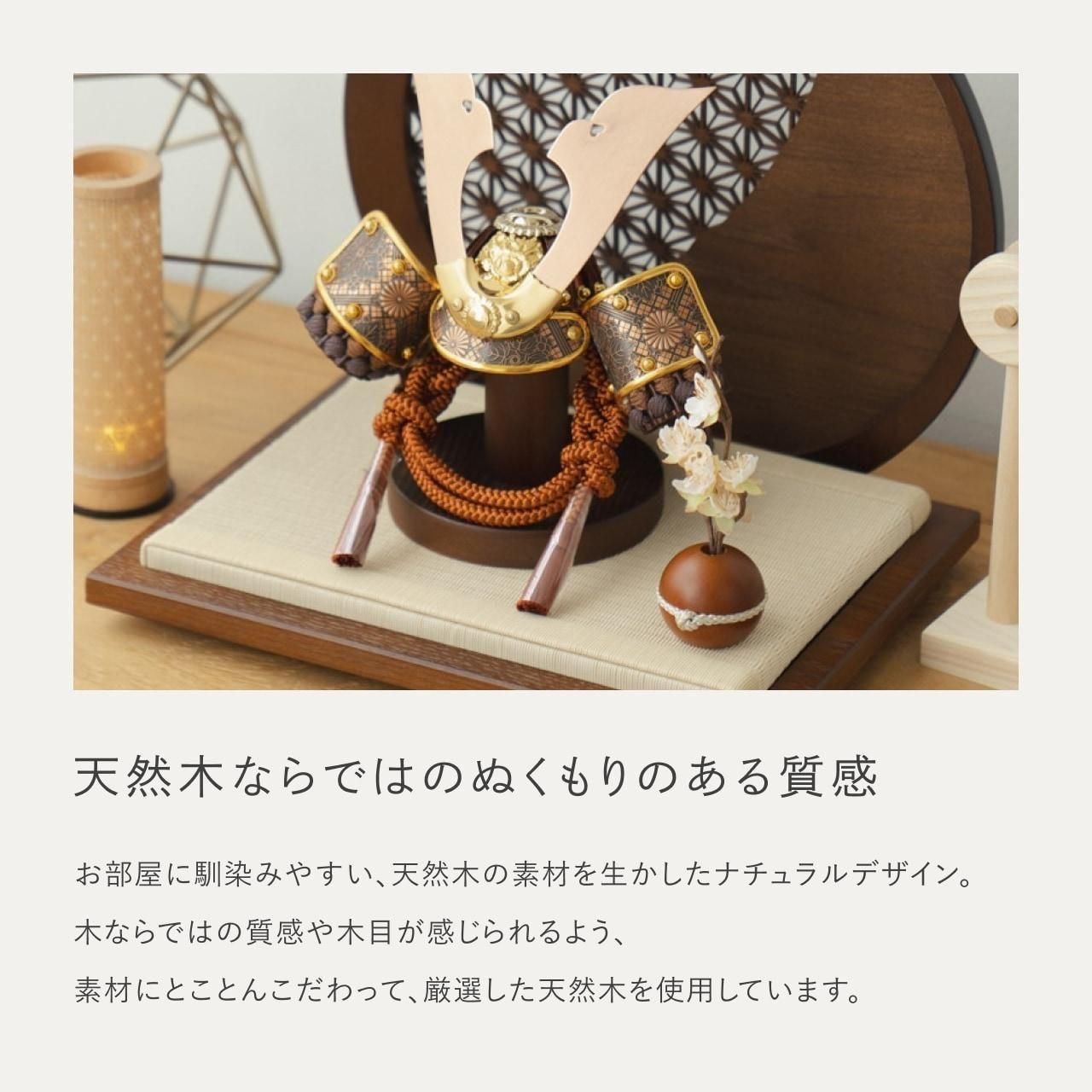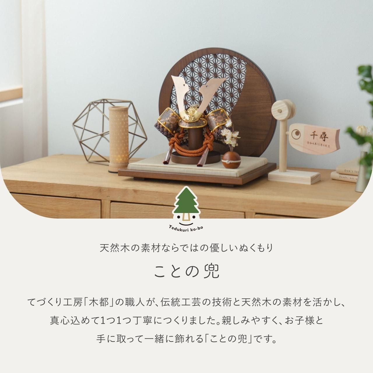 実際に手に取ると天然木の素材ならではの優しいぬくもりが伝わります。てづくり工房「木都」の職人が、伝統工芸の技術と天然木の素材を活かし、真心込めて1つ1つ丁寧につくりました。親しみやすく、お子様と一緒に飾れる「ことの兜」です。※ 細かい部品が含まれています。3歳未満のお子様は、保護者の方と一緒にお遊びください。コンパクトでちょうどいいサイズコンパクトでちょうどいいサイズ今どきのおうちに合わせたコンパクトなサイズに仕上げました。飾るスペースが狭くなりがちなマンションや子ども部屋にもぴったり。伝統的な兜をモダンに仕上げたシンプルなデザイン伝統的な兜をモダンに仕上げたシンプルなデザイン伝統的な製法で作られた兜に天然木の素材を活かしたシンプルなデザインの兜です。モダンでシンプルなデザインは、どんなお部屋の雰囲気にもピッタリ。選び抜いた素材と手間をかけた技法でつくる兜鉢選び抜いた素材と手間をかけた技法でつくる兜鉢ことの兜の兜鉢は、伝統的な本式の合せ鉢という技法でつくられています。本式の合せ鉢とは、戦国時代に頭部を守るために考案され、三角状の鉢部品を重ね合わせ、多数の星鋲をカシメる事で強度を高める技法です。健やかな成長への願いを込めた麻の葉文様健やかな成長への願いを込めた麻の葉文様古来からの日本伝統の吉祥文様である麻の葉文様。麻の丈夫さ・成長の早さにあやかり、お子さまの健やかな成長への願いが込められています。一本一本織機で織る日本古来の伝統製法と加工一本一本織機で織る日本古来の伝統製法と加工日本独自の伝統文化である「畳」一本一本織機で織る「伝統的な製法」と「引目」「目積」などの「伝統的な織柄」に徹底した日本古来の伝統製法で加工されています。天然イ草の風合いを活かしながら、高い耐久性や安全性のある「美草」を使用しています。お子さまの感性を育む天然木へのこだわりお子さまの感性を育む天然木へのこだわり素材には、タモ、ブナといった天然木を使用。お子さまへの一生に一度の贈り物だから、木都は自然素材の天然木にこだわり続けています。※ 生産時期により使用する素材が一部変更になる場合がございます。熟練の職人による確かな手仕事熟練の職人による確かな手仕事伝統工芸の技術を受け継ぐ日本国内の熟練の職人が、一つひとつ丁寧に手づくりしています。おしゃれなギフト包装でお届けしますおしゃれなギフト包装でお届けします和の雰囲気を感じさせる越前和紙のギフト用ラッピングでお届け。料金がわかるものもお入れしていないので、そのまま贈り物として利用できます。商品レビュー記入でもれなくもらえる天然木のミニ名前札プレゼント商品レビュー記入でもれなくもらえる天然木のミニ名前札プレゼントミニサイズのお名前札 (通常販売価格1,980円) をプレゼント♪商品到着後、商品レビューをご記入の上、商品と同梱のチラシ記載のQRコードから応募フォームへ必要事項をご入力ください。店舗よりレビュー特典を発送いたします。※ お名前札の生年月日の表記は和暦となります。(例:令和七年)商品のご注文へ収納方法とセット内容兜・鍬形・芯木・花飾り・衝立・平台素材:タモサイズ:W260mm × D210mm × H255mm梱包時:W240mm × D200mm × H130mm兜のみ:約 W170mm × D120mm × H130mm注意事項本品は、金属をふんだんに使用しております。取り扱われる方の人体にすり傷、切り傷、刺傷を及ぼす場合がございますので、左記注意事項をよく読んでお取り扱い下さい。甲冑について飾り付ける際に必ず手袋をご使用ください。錆や変色などの予防にもなります。本品の上には絶対に乗らないでください。本品または本品の部品は装飾品です。他の目的に使用しないで下さい。部品には小さなものがございます。お子様がお口に入れないようにご注意いください。木製品について色合いなど実際のものと写真とでは多少の誤差が生じる場合がございます。また、手作りであり天然木を使用している為、多少の仕様の変化や風合いがひとつひとつ異なります。あらかじめご了承ください。部品には小さなものがございます。お子様がお口に入れないようにご注意いください。菖蒲には針金が入っております。お好みで角度を調整して下さい。材質により刻印の濃淡に差が生じますが不良品ではございません。木製品である限り自然なこととご承知下さいませ。保管場所は変色やカビ、サビの原因になりますので湿気の少ない場所・直射日光の当たらない場所に保管してください。ご不明点がございましたら > お問い合わせページ からご相談ください。