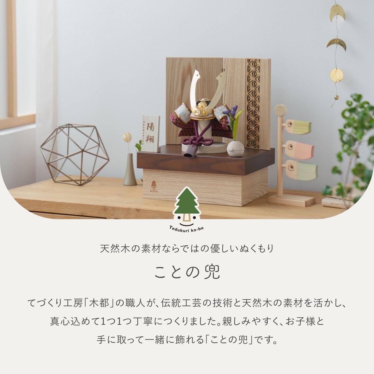 実際に手に取ると天然木の素材ならではの優しいぬくもりが伝わります。てづくり工房「木都」の職人が、伝統工芸の技術と天然木の素材を活かし、真心込めて1つ1つ丁寧につくりました。親しみやすく、お子様と一緒に飾れる「ことの兜」です。※ 細かい部品が含まれています。3歳未満のお子様は、保護者の方と一緒にお遊びください。コンパクトでちょうどいいサイズコンパクトでちょうどいいサイズ今どきのおうちに合わせたコンパクトなサイズに仕上げました。飾るスペースが狭くなりがちなマンションや子ども部屋にもぴったり。伝統的な兜をモダンに仕上げたシンプルなデザイン伝統的な兜をモダンに仕上げたシンプルなデザイン伝統的な製法で作られた兜に天然木の素材を活かしたシンプルなデザインの兜です。モダンでシンプルなデザインは、どんなお部屋の雰囲気にもピッタリ。選び抜いた素材と手間をかけた技法でつくる兜鉢選び抜いた素材と手間をかけた技法でつくる兜鉢ことの兜の兜鉢は、伝統的な本式の合せ鉢という技法でつくられています。本式の合せ鉢とは、戦国時代に頭部を守るために考案され、三角状の鉢部品を重ね合わせ、多数の星鋲をカシメる事で強度を高める技法です。健やかな成長への願いを込めた麻の葉文様健やかな成長への願いを込めた麻の葉文様古来からの日本伝統の吉祥文様である麻の葉文様。麻の丈夫さ・成長の早さにあやかり、お子さまの健やかな成長への願いが込められています。お子さまの感性を育む天然木へのこだわりお子さまの感性を育む天然木へのこだわり素材には、タモ、ブナといった天然木を使用。お子さまへの一生に一度の贈り物だから、木都は自然素材の天然木にこだわり続けています。※ 生産時期により使用する素材が一部変更になる場合がございます。熟練の職人による確かな手仕事熟練の職人による確かな手仕事伝統工芸の技術を受け継ぐ日本国内の熟練の職人が、一つひとつ丁寧に手づくりしています。おしゃれなギフト包装でお届けしますおしゃれなギフト包装でお届けします和の雰囲気を感じさせる越前和紙のギフト用ラッピングでお届け。料金がわかるものもお入れしていないので、そのまま贈り物として利用できます。商品レビュー記入でもれなくもらえる天然木のミニ名前札プレゼント商品レビュー記入でもれなくもらえる天然木のミニ名前札プレゼントミニサイズのお名前札 (通常販売価格1,980円) をプレゼント♪商品到着後、商品レビューをご記入の上、商品と同梱のチラシ記載のQRコードから応募フォームへ必要事項をご入力ください。店舗よりレビュー特典を発送いたします。※ お名前札の生年月日の表記は和暦となります。(例:令和七年)商品のご注文へ収納方法とセット内容兜・鍬形・芯木・菖蒲・屏風・収納箱屏風は収納箱の上に乗せてダンボール箱におしまい下さい。素材:タモサイズ:W245mm × D200mm × H300mm梱包時:W305mm × D245mm × H160mm兜のみ:約 W165mm × D115mm × H140mm注意事項本品は、金属をふんだんに使用しております。取り扱われる方の人体にすり傷、切り傷、刺傷を及ぼす場合がございますので、左記注意事項をよく読んでお取り扱い下さい。甲冑について飾り付ける際に必ず手袋をご使用ください。錆や変色などの予防にもなります。本品の上には絶対に乗らないでください。本品または本品の部品は装飾品です。他の目的に使用しないで下さい。部品には小さなものがございます。お子様がお口に入れないようにご注意いください。木製品について色合いなど実際のものと写真とでは多少の誤差が生じる場合がございます。また、手作りであり天然木を使用している為、多少の仕様の変化や風合いがひとつひとつ異なります。あらかじめご了承ください。部品には小さなものがございます。お子様がお口に入れないようにご注意いください。菖蒲には針金が入っております。お好みで角度を調整して下さい。材質により刻印の濃淡に差が生じますが不良品ではございません。木製品である限り自然なこととご承知下さいませ。保管場所は変色やカビ、サビの原因になりますので湿気の少ない場所・直射日光の当たらない場所に保管してください。ご不明点がございましたら > お問い合わせページ からご相談ください。