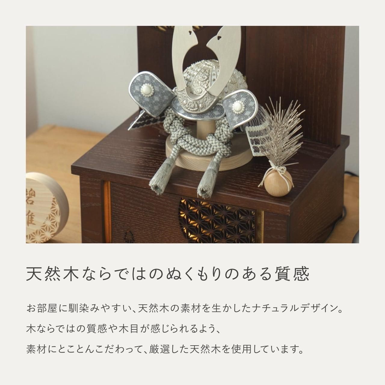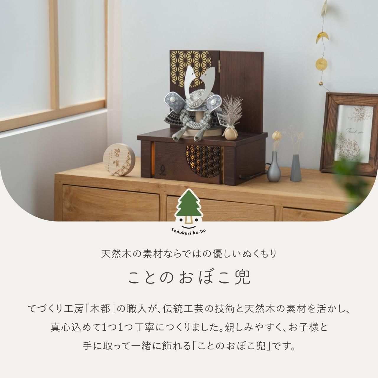 実際に手に取ると天然木の素材ならではの優しいぬくもりが伝わります。てづくり工房「木都」の職人が、伝統工芸の技術と天然木の素材を活かし、真心込めて1つ1つ丁寧につくりました。親しみやすく、お子様と一緒に飾れる「ことのおぼこ兜」です。※ 細かい部品が含まれています。3歳未満のお子様は、保護者の方と一緒にお遊びください。コンパクトでちょうどいいサイズコンパクトでちょうどいいサイズ今どきのおうちに合わせたコンパクトなサイズに仕上げました。飾るスペースが狭くなりがちなマンションや子ども部屋にもぴったり。伝統的な兜をモダンに仕上げたシンプルなデザイン伝統的な兜をモダンに仕上げたシンプルなデザイン伝統的な製法で作られた兜に天然木の素材を活かしたシンプルなデザインの兜です。モダンでシンプルなデザインは、どんなお部屋の雰囲気にもピッタリ。丸みを帯びた親しみやすいフォルム丸みを帯びた親しみやすいフォルム吹き返しやまびさし、鍬形にいたるまで、全体的に丸みを帯びた形状に仕上げました。伝統的な兜でありながら、親しみやすさを感じる兜です。選び抜いた素材と手間をかけた技法でつくる兜鉢選び抜いた素材と手間をかけた技法でつくる兜鉢ことのおぼこ兜の兜鉢は、伝統的な本式の合せ鉢という技法でつくられています。本式の合せ鉢とは、戦国時代に頭部を守るために考案され、三角状の鉢部品を重ね合わせ、多数の星鋲をカシメる事で強度を高める技法です。健やかな成長への願いを込めた麻の葉文様健やかな成長への願いを込めた麻の葉文様古来からの日本伝統の吉祥文様である麻の葉文様。麻の丈夫さ・成長の早さにあやかり、お子さまの健やかな成長への願いが込められています。お子さまの感性を育む天然木へのこだわりお子さまの感性を育む天然木へのこだわり素材には、タモ、ブナといった天然木を使用。お子さまへの一生に一度の贈り物だから、木都は自然素材の天然木にこだわり続けています。※ 生産時期により使用する素材が一部変更になる場合がございます。熟練の職人による確かな手仕事熟練の職人による確かな手仕事伝統工芸の技術を受け継ぐ日本国内の熟練の職人が、一つひとつ丁寧に手づくりしています。おしゃれなギフト包装でお届けしますおしゃれなギフト包装でお届けします和の雰囲気を感じさせる越前和紙のギフト用ラッピングでお届け。料金がわかるものもお入れしていないので、そのまま贈り物として利用できます。商品レビュー記入でもれなくもらえる天然木のミニ名前札プレゼント商品レビュー記入でもれなくもらえる天然木のミニ名前札プレゼントミニサイズのお名前札 (通常販売価格1,980円) をプレゼント♪商品到着後、商品レビューをご記入の上、商品と同梱のチラシ記載のQRコードから応募フォームへ必要事項をご入力ください。店舗よりレビュー特典を発送いたします。※ お名前札の生年月日の表記は和暦となります。(例:令和七年)商品のご注文へ収納方法とセット内容兜・鍬形・芯木・松・屏風・収納箱・電源ケーブル屏風は収納箱の上に乗せてダンボール箱におしまい下さい。素材:タモサイズ:W250mm × D200mm × H305mm梱包時:W310mm × D240mm × H160mm兜のみ:約 W180mm × D140mm × H130mm注意事項甲冑について飾り付ける際に必ず手袋をご使用ください。錆や変色などの予防にもなります。本品の上には絶対に乗らないでください。本品または本品の部品は装飾品です。他の目的に使用しないで下さい。部品には小さなものがございます。お子様がお口に入れないようにご注意いください。木製品について色合いなど実際のものと写真とでは多少の誤差が生じる場合がございます。また、手作りであり天然木を使用している為、多少の仕様の変化や風合いがひとつひとつ異なります。あらかじめご了承ください。部品には小さなものがございます。お子様がお口に入れないようにご注意いください。菖蒲には針金が入っております。お好みで角度を調整して下さい。材質により刻印の濃淡に差が生じますが不良品ではございません。木製品である限り自然なこととご承知下さいませ。保管場所は変色やカビ、サビの原因になりますので湿気の少ない場所・直射日光の当たらない場所に保管してください。ご不明点がございましたら > お問い合わせページ からご相談ください。