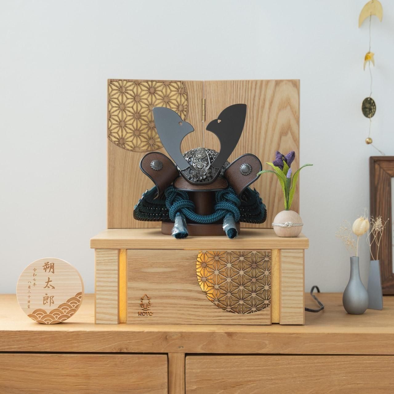 実際に手に取ると天然木の素材ならではの優しいぬくもりが伝わります。てづくり工房「木都」の職人が、伝統工芸の技術と天然木の素材を活かし、真心込めて1つ1つ丁寧につくりました。親しみやすく、お子様と一緒に飾れる「ことのおぼこ兜」です。※ 細かい部品が含まれています。3歳未満のお子様は、保護者の方と一緒にお遊びください。コンパクトでちょうどいいサイズコンパクトでちょうどいいサイズ今どきのおうちに合わせたコンパクトなサイズに仕上げました。飾るスペースが狭くなりがちなマンションや子ども部屋にもぴったり。伝統的な兜をモダンに仕上げたシンプルなデザイン伝統的な兜をモダンに仕上げたシンプルなデザイン伝統的な製法で作られた兜に天然木の素材を活かしたシンプルなデザインの兜です。モダンでシンプルなデザインは、どんなお部屋の雰囲気にもピッタリ。丸みを帯びた親しみやすいフォルム丸みを帯びた親しみやすいフォルム吹き返しやまびさし、鍬形にいたるまで、全体的に丸みを帯びた形状に仕上げました。伝統的な兜でありながら、親しみやすさを感じる兜です。選び抜いた素材と手間をかけた技法でつくる兜鉢選び抜いた素材と手間をかけた技法でつくる兜鉢ことのおぼこ兜の兜鉢は、伝統的な本式の合せ鉢という技法でつくられています。本式の合せ鉢とは、戦国時代に頭部を守るために考案され、三角状の鉢部品を重ね合わせ、多数の星鋲をカシメる事で強度を高める技法です。健やかな成長への願いを込めた麻の葉文様健やかな成長への願いを込めた麻の葉文様古来からの日本伝統の吉祥文様である麻の葉文様。麻の丈夫さ・成長の早さにあやかり、お子さまの健やかな成長への願いが込められています。お子さまの感性を育む天然木へのこだわりお子さまの感性を育む天然木へのこだわり素材には、タモ、ブナといった天然木を使用。お子さまへの一生に一度の贈り物だから、木都は自然素材の天然木にこだわり続けています。※ 生産時期により使用する素材が一部変更になる場合がございます。熟練の職人による確かな手仕事熟練の職人による確かな手仕事伝統工芸の技術を受け継ぐ日本国内の熟練の職人が、一つひとつ丁寧に手づくりしています。おしゃれなギフト包装でお届けしますおしゃれなギフト包装でお届けします和の雰囲気を感じさせる越前和紙のギフト用ラッピングでお届け。料金がわかるものもお入れしていないので、そのまま贈り物として利用できます。商品レビュー記入でもれなくもらえる天然木のミニ名前札プレゼント商品レビュー記入でもれなくもらえる天然木のミニ名前札プレゼントミニサイズのお名前札 (通常販売価格1,980円) をプレゼント♪商品到着後、商品レビューをご記入の上、商品と同梱のチラシ記載のQRコードから応募フォームへ必要事項をご入力ください。店舗よりレビュー特典を発送いたします。※ お名前札の生年月日の表記は和暦となります。(例:令和七年)商品のご注文へ収納方法とセット内容兜・鍬形・芯木・菖蒲・屏風・収納箱・電源ケーブル屏風は収納箱の上に乗せてダンボール箱におしまい下さい。素材:タモサイズ:W250mm × D200mm × H305mm梱包時:W340mm × D280mm × H275mm兜のみ:約 W180mm × D140mm × H130mm注意事項甲冑について飾り付ける際に必ず手袋をご使用ください。錆や変色などの予防にもなります。本品の上には絶対に乗らないでください。本品または本品の部品は装飾品です。他の目的に使用しないで下さい。部品には小さなものがございます。お子様がお口に入れないようにご注意いください。木製品について色合いなど実際のものと写真とでは多少の誤差が生じる場合がございます。また、手作りであり天然木を使用している為、多少の仕様の変化や風合いがひとつひとつ異なります。あらかじめご了承ください。部品には小さなものがございます。お子様がお口に入れないようにご注意いください。菖蒲には針金が入っております。お好みで角度を調整して下さい。材質により刻印の濃淡に差が生じますが不良品ではございません。木製品である限り自然なこととご承知下さいませ。保管場所は変色やカビ、サビの原因になりますので湿気の少ない場所・直射日光の当たらない場所に保管してください。ご不明点がございましたら > お問い合わせページ からご相談ください。
