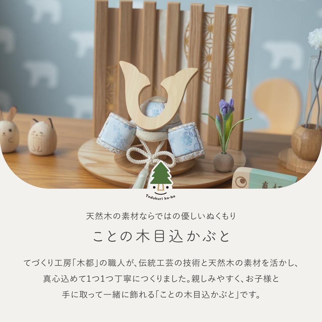 実際に手に取ると天然木の素材ならではの優しいぬくもりが伝わります。てづくり工房「木都」の職人が、伝統工芸の技術と天然木の素材を活かし、真心込めて1つ1つ丁寧につくりました。親しみやすく、お子様と一緒に飾れる 「ことの木目込かぶと」です。※ 細かい部品が含まれています。3歳未満のお子様は、保護者の方と一緒にお遊びください。 コンパクトでちょうどいいサイズコンパクトでちょうどいいサイズ今どきのおうちに合わせたコンパクトなサイズに仕上げました。飾るスペースが狭くなりがちなマンションや子ども部屋にもぴったり。お衣装へのこだわりお衣装へのこだわり有職裂地に桜と牡丹、菊の柄をあしらっています。有職とは「有職故事」という宮廷の決まり事に準拠した色彩や文様で、それらで造った衣装を有職衣装と呼びます。桜は豊かさ、牡丹は富貴、菊は無病息災や長寿の意味があります。お部屋のイメージに調和するデザインお部屋のイメージに調和するデザイン天然木の素材を活かしたシンプルなデザインだから、お部屋の雰囲気にもピッタリ。富士山の麓でとれた桧富士山の麓でとれた桧鍬形の素材には、富士山麓の無垢のヒノキを使用しています。お子さまの感性を育む天然木へのこだわりお子さまの感性を育む天然木へのこだわり素材には、桧、タモといった天然木を使用。お子さまへの一生に一度の贈り物だから、木都は自然素材の天然木にこだわり続けています。※ 生産時期により使用する素材が一部変更になる場合がございます。熟練の職人による確かな手仕事熟練の職人による確かな手仕事伝統工芸の技術を受け継ぐ日本国内の熟練の職人が、一つひとつ丁寧に手づくりしています。おしゃれなギフト包装でお届けしますおしゃれなギフト包装でお届けします和の雰囲気を感じさせる越前和紙のギフト用ラッピングでお届け。料金がわかるものもお入れしていないので、そのまま贈り物として利用できます。商品レビュー記入でもれなくもらえる天然木のミニ名前札プレゼント商品レビュー記入でもれなくもらえる天然木のミニ名前札プレゼントミニサイズのお名前札 (通常販売価格1,980円) をプレゼント♪商品到着後、商品レビューをご記入の上、商品と同梱のチラシ記載のQRコードから応募フォームへ必要事項をご入力ください。店舗よりレビュー特典を発送いたします。※ お名前札の生年月日の表記は和暦となります。(例:令和七年)商品のご注文へ収納方法とセット内容兜・鍬形・芯木・菖蒲・屏風・平台素材:桧・タモサイズ:W215mm × D180mm × H200mm梱包時:W270mm × D240mm × H125mm兜のみ:約 W130mm × D125mm × H110mm注意事項色合いなど実際のものと写真とでは多少の誤差が生じる場合がございます。また、手作りであり天然木を使用している為、多少の仕様の変化や風合いがひとつひとつ異なります。あらかじめご了承ください。部品には小さなものがございます。お子様がお口に入れないようにご注意ください。観賞用ではございますが手にとって遊んでいただくことも可能です。鍬形部は折れやすくなっております。強い衝撃を与えたり落としたりしないで下さい。材質により目の刻印の濃淡に差が生じますが不良品ではございません。木製品である限り自然なこととご承知下さいませ。保管場所は変色やカビ、サビの原因になりますので湿気の少ない場所・直射日光の当たらない場所に保管してください。ご不明点がございましたら > お問い合わせページ からご相談ください。
