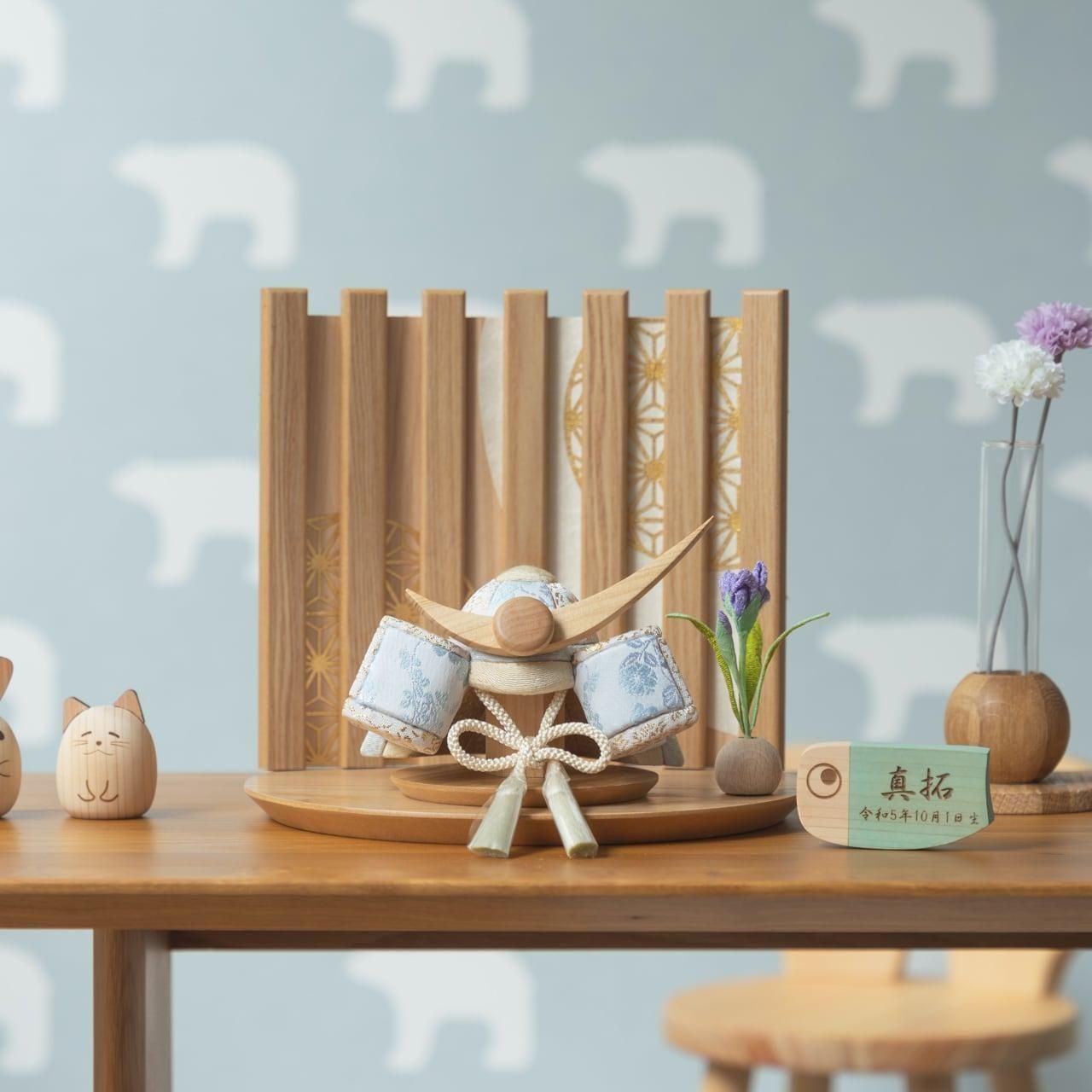 てづくり工房「木都」の職人が、伝統工芸の技術と天然木の素材を活かし、真心込めて1つ1つ丁寧につくりました。親しみやすく、お子様と一緒に飾れる 「ことの木目込かぶと」です。