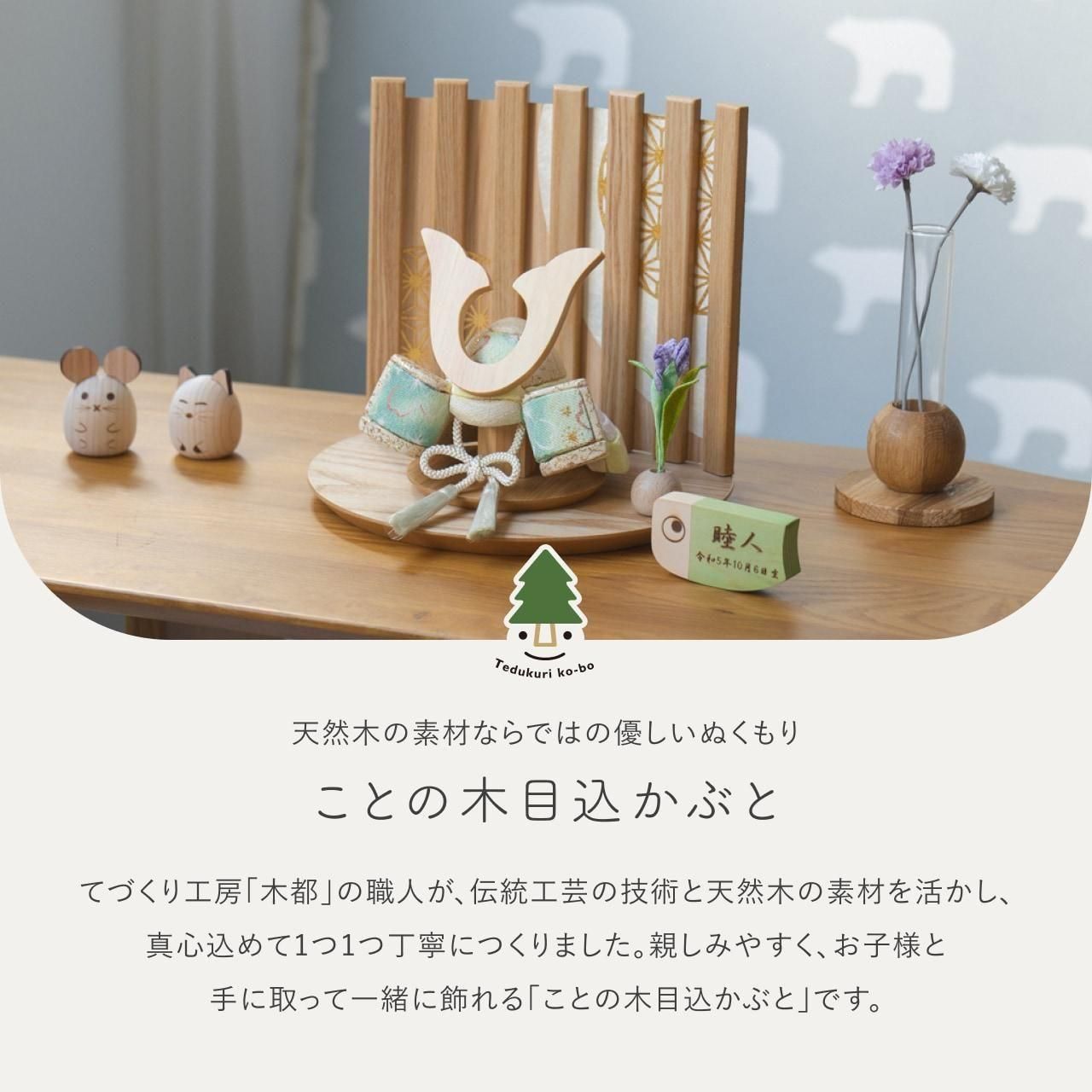 実際に手に取ると天然木の素材ならではの優しいぬくもりが伝わります。てづくり工房「木都」の職人が、伝統工芸の技術と天然木の素材を活かし、真心込めて1つ1つ丁寧につくりました。親しみやすく、お子様と一緒に飾れる 「ことの木目込かぶと」です。※ 細かい部品が含まれています。3歳未満のお子様は、保護者の方と一緒にお遊びください。 コンパクトでちょうどいいサイズコンパクトでちょうどいいサイズ今どきのおうちに合わせたコンパクトなサイズに仕上げました。飾るスペースが狭くなりがちなマンションや子ども部屋にもぴったり。お衣装へのこだわりお衣装へのこだわり有職裂地を使用しています。有職とは「有職故事」という宮廷の決まり事に準拠した色彩や文様で、それらで造った衣装を有職衣装と呼びます。薔薇には美しさや愛情という意味があります。お部屋のイメージに調和するデザインお部屋のイメージに調和するデザイン天然木の素材を活かしたシンプルなデザインだから、お部屋の雰囲気にもピッタリ。富士山の麓でとれた桧富士山の麓でとれた桧鍬形の素材には、富士山麓の無垢のヒノキを使用しています。健やかな成長への願いを込めた麻の葉文様健やかな成長への願いを込めた麻の葉文様古来からの日本伝統の吉祥文様である麻の葉文様。麻の丈夫さ・成長の早さにあやかり、お子さまの健やかな成長への願いが込められています。お子さまの感性を育む天然木へのこだわりお子さまの感性を育む天然木へのこだわり素材には、桧、タモといった天然木を使用。お子さまへの一生に一度の贈り物だから、木都は自然素材の天然木にこだわり続けています。※ 生産時期により使用する素材が一部変更になる場合がございます。熟練の職人による確かな手仕事熟練の職人による確かな手仕事伝統工芸の技術を受け継ぐ日本国内の熟練の職人が、一つひとつ丁寧に手づくりしています。おしゃれなギフト包装でお届けしますおしゃれなギフト包装でお届けします和の雰囲気を感じさせる越前和紙のギフト用ラッピングでお届け。料金がわかるものもお入れしていないので、そのまま贈り物として利用できます。商品レビュー記入でもれなくもらえる天然木のミニ名前札プレゼント商品レビュー記入でもれなくもらえる天然木のミニ名前札プレゼントミニサイズのお名前札 (通常販売価格1,980円) をプレゼント♪商品到着後、商品レビューをご記入の上、商品と同梱のチラシ記載のQRコードから応募フォームへ必要事項をご入力ください。店舗よりレビュー特典を発送いたします。※ お名前札の生年月日の表記は和暦となります。(例:令和七年)商品のご注文へ収納方法とセット内容兜・鍬形・芯木・菖蒲・屏風・平台素材:桧・タモサイズ:W215mm × D180mm × H200mm梱包時:W270mm × D240mm × H125mm兜のみ:約 W130mm × D125mm × H110mm注意事項色合いなど実際のものと写真とでは多少の誤差が生じる場合がございます。また、手作りであり天然木を使用している為、多少の仕様の変化や風合いがひとつひとつ異なります。あらかじめご了承ください。部品には小さなものがございます。お子様がお口に入れないようにご注意ください。観賞用ではございますが手にとって遊んでいただくことも可能です。鍬形部は折れやすくなっております。強い衝撃を与えたり落としたりしないで下さい。材質により目の刻印の濃淡に差が生じますが不良品ではございません。木製品である限り自然なこととご承知下さいませ。保管場所は変色やカビ、サビの原因になりますので湿気の少ない場所・直射日光の当たらない場所に保管してください。ご不明点がございましたら > お問い合わせページ からご相談ください。