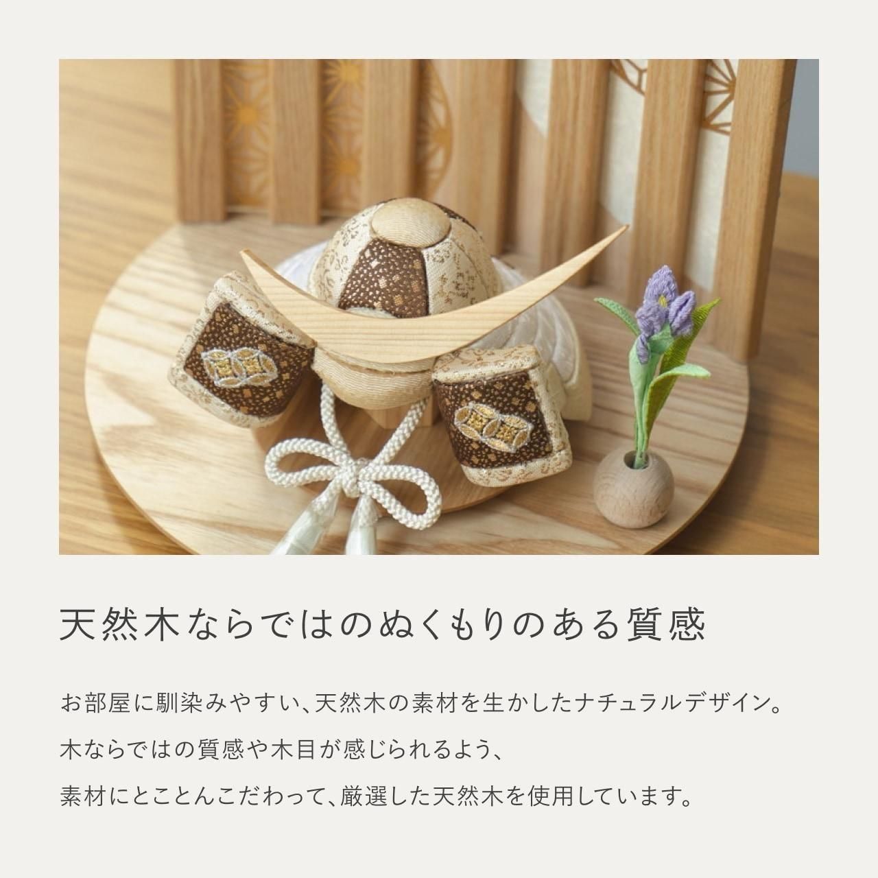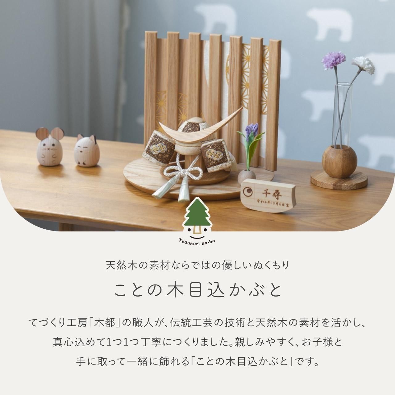 実際に手に取ると天然木の素材ならではの優しいぬくもりが伝わります。てづくり工房「木都」の職人が、伝統工芸の技術と天然木の素材を活かし、真心込めて1つ1つ丁寧につくりました。親しみやすく、お子様と一緒に飾れる 「ことの木目込かぶと」です。※ 細かい部品が含まれています。3歳未満のお子様は、保護者の方と一緒にお遊びください。 コンパクトでちょうどいいサイズコンパクトでちょうどいいサイズ今どきのおうちに合わせたコンパクトなサイズに仕上げました。飾るスペースが狭くなりがちなマンションや子ども部屋にもぴったり。お衣装へのこだわりお衣装へのこだわり有職裂地を使用しています。有職とは「有職故事」という宮廷の決まり事に準拠した色彩や文様で、それらで造った衣装を有職衣装と呼びます。お部屋のイメージに調和するデザインお部屋のイメージに調和するデザイン天然木の素材を活かしたシンプルなデザインだから、お部屋の雰囲気にもピッタリ。富士山の麓でとれた桧富士山の麓でとれた桧鍬形の素材には、富士山麓の無垢のヒノキを使用しています。健やかな成長への願いを込めた麻の葉文様健やかな成長への願いを込めた麻の葉文様古来からの日本伝統の吉祥文様である麻の葉文様。麻の丈夫さ・成長の早さにあやかり、お子さまの健やかな成長への願いが込められています。お子さまの感性を育む天然木へのこだわりお子さまの感性を育む天然木へのこだわり素材には、桧、タモといった天然木を使用。お子さまへの一生に一度の贈り物だから、木都は自然素材の天然木にこだわり続けています。※ 生産時期により使用する素材が一部変更になる場合がございます。熟練の職人による確かな手仕事熟練の職人による確かな手仕事伝統工芸の技術を受け継ぐ日本国内の熟練の職人が、一つひとつ丁寧に手づくりしています。おしゃれなギフト包装でお届けしますおしゃれなギフト包装でお届けします和の雰囲気を感じさせる越前和紙のギフト用ラッピングでお届け。料金がわかるものもお入れしていないので、そのまま贈り物として利用できます。商品レビュー記入でもれなくもらえる天然木のミニ名前札プレゼント商品レビュー記入でもれなくもらえる天然木のミニ名前札プレゼントミニサイズのお名前札 (通常販売価格1,980円) をプレゼント♪商品到着後、商品レビューをご記入の上、商品と同梱のチラシ記載のQRコードから応募フォームへ必要事項をご入力ください。店舗よりレビュー特典を発送いたします。※ お名前札の生年月日の表記は和暦となります。(例:令和七年)商品のご注文へ収納方法とセット内容兜・鍬形・芯木・菖蒲・屏風・平台素材:桧・タモサイズ:W215mm × D180mm × H200mm梱包時:W270mm × D240mm × H125mm兜のみ:約 W130mm × D125mm × H110mm注意事項色合いなど実際のものと写真とでは多少の誤差が生じる場合がございます。また、手作りであり天然木を使用している為、多少の仕様の変化や風合いがひとつひとつ異なります。あらかじめご了承ください。部品には小さなものがございます。お子様がお口に入れないようにご注意ください。観賞用ではございますが手にとって遊んでいただくことも可能です。鍬形部は折れやすくなっております。強い衝撃を与えたり落としたりしないで下さい。材質により目の刻印の濃淡に差が生じますが不良品ではございません。木製品である限り自然なこととご承知下さいませ。保管場所は変色やカビ、サビの原因になりますので湿気の少ない場所・直射日光の当たらない場所に保管してください。ご不明点がございましたら > お問い合わせページ からご相談ください。